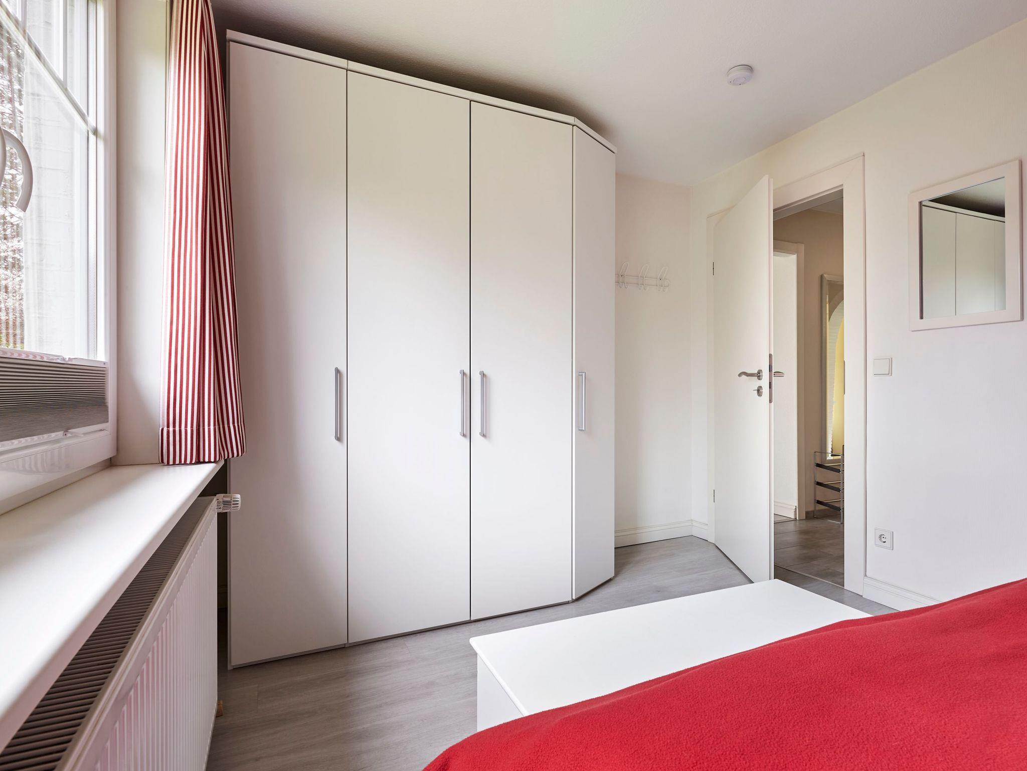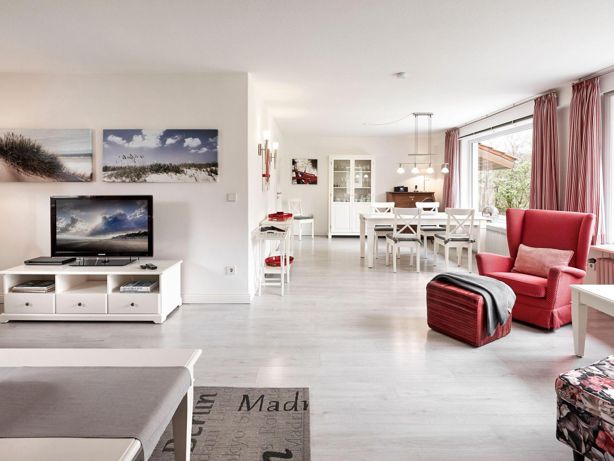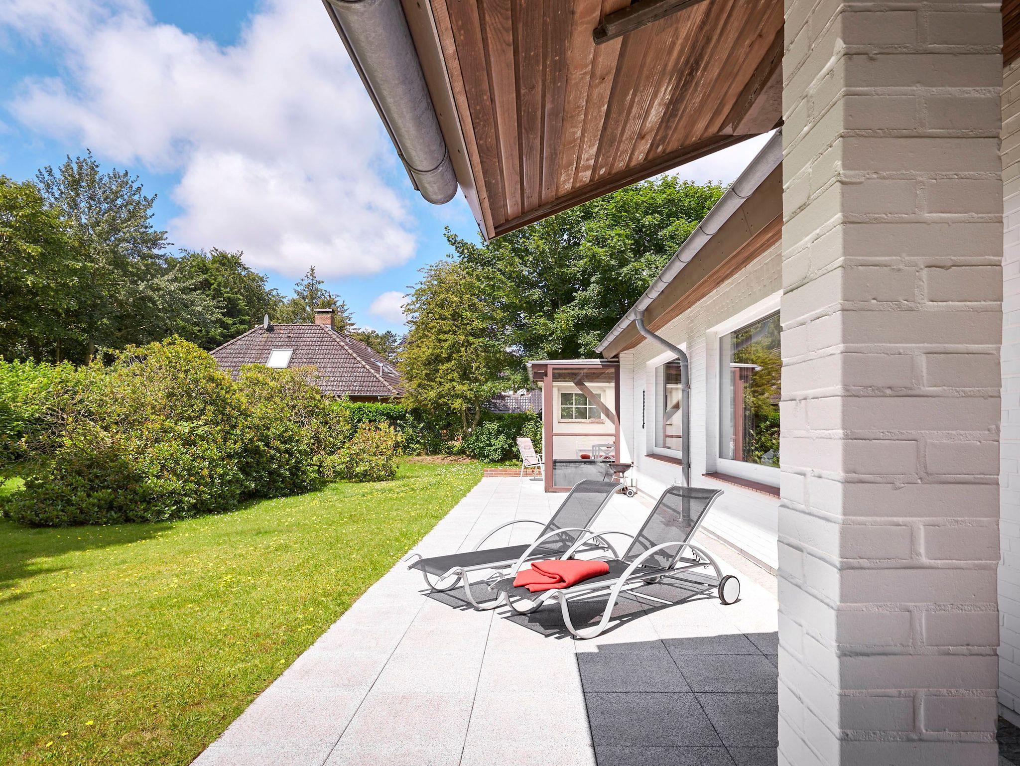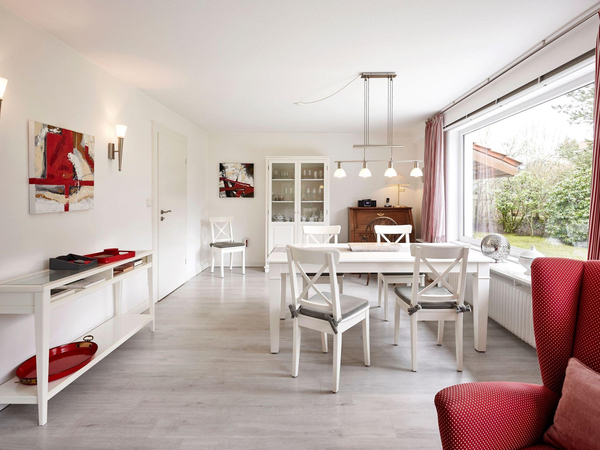 In diesem Einzelhaus im Bungalowstil werden Sie einen wunderbaren Urlaub genießen. Vom großen Wohn-Esszimmer gelangen Sie über eine überdachte Terrasse direkt in den Garten. Sollte also mal ein kurzer Schauer das Grillvergnügen trüben, sitzen Sie geschützt im Freien. Möchten Sie den Tag nicht im eigenen Garten verbringen, machen Sie sich auf den Weg zur Strandpromenade. In nur wenigen Minuten gelangen Sie zu Fuß oder auch per Rad zum Wasser. Angelehnt ist der Grünstreifen an einen Wald, welcher mit wunderschönen Wegen zum Spazierengehen einlädt.