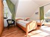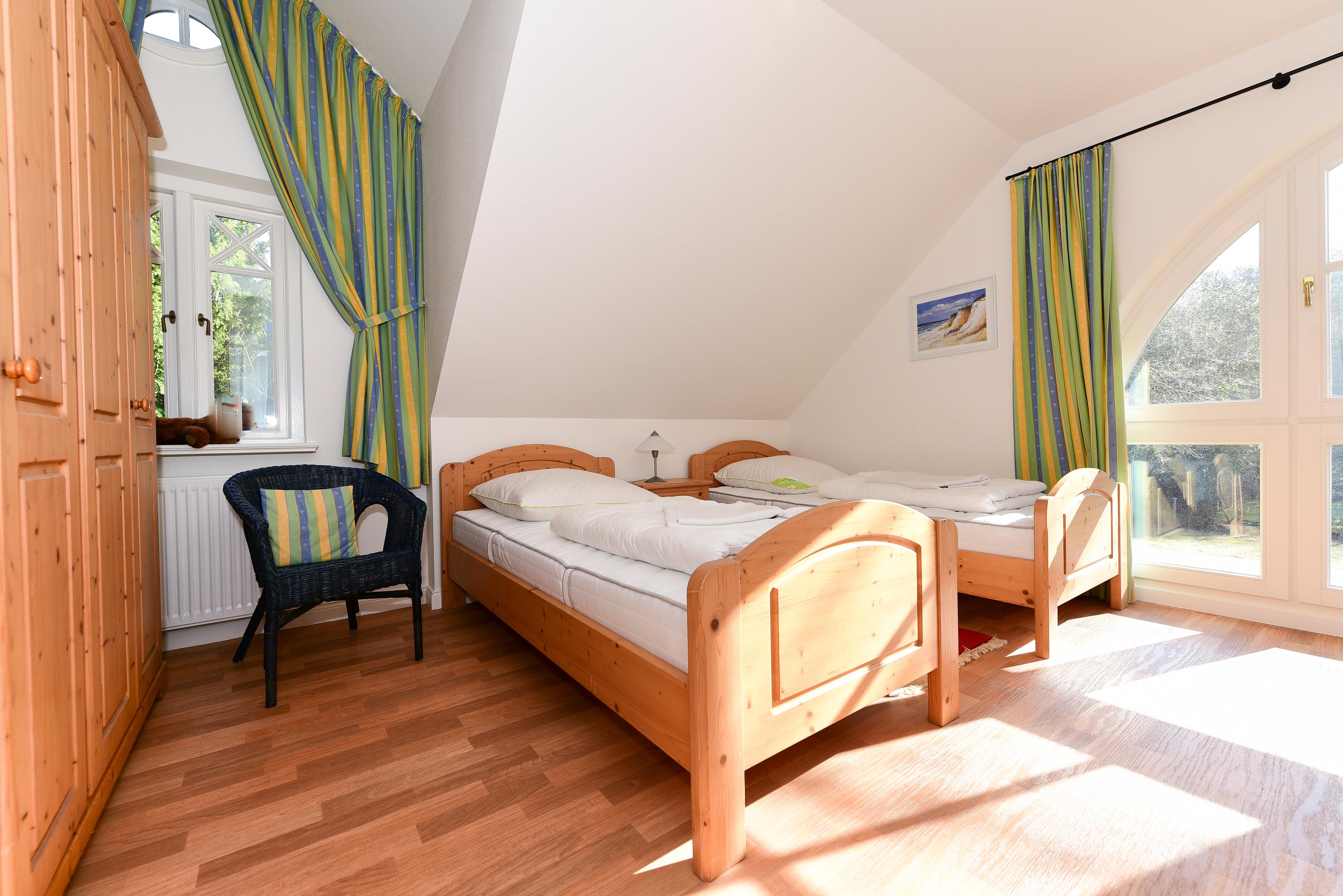 Im Obergeschoss erwarten Sie zwei gemütliche Schlafzimmer - eines mit Doppelbett und das andere mit zwei Einzelbetten. Die jeweiligen halbrunden Fenster spenden viel Tageslicht und bieten eine wohlige Atmosphäre.