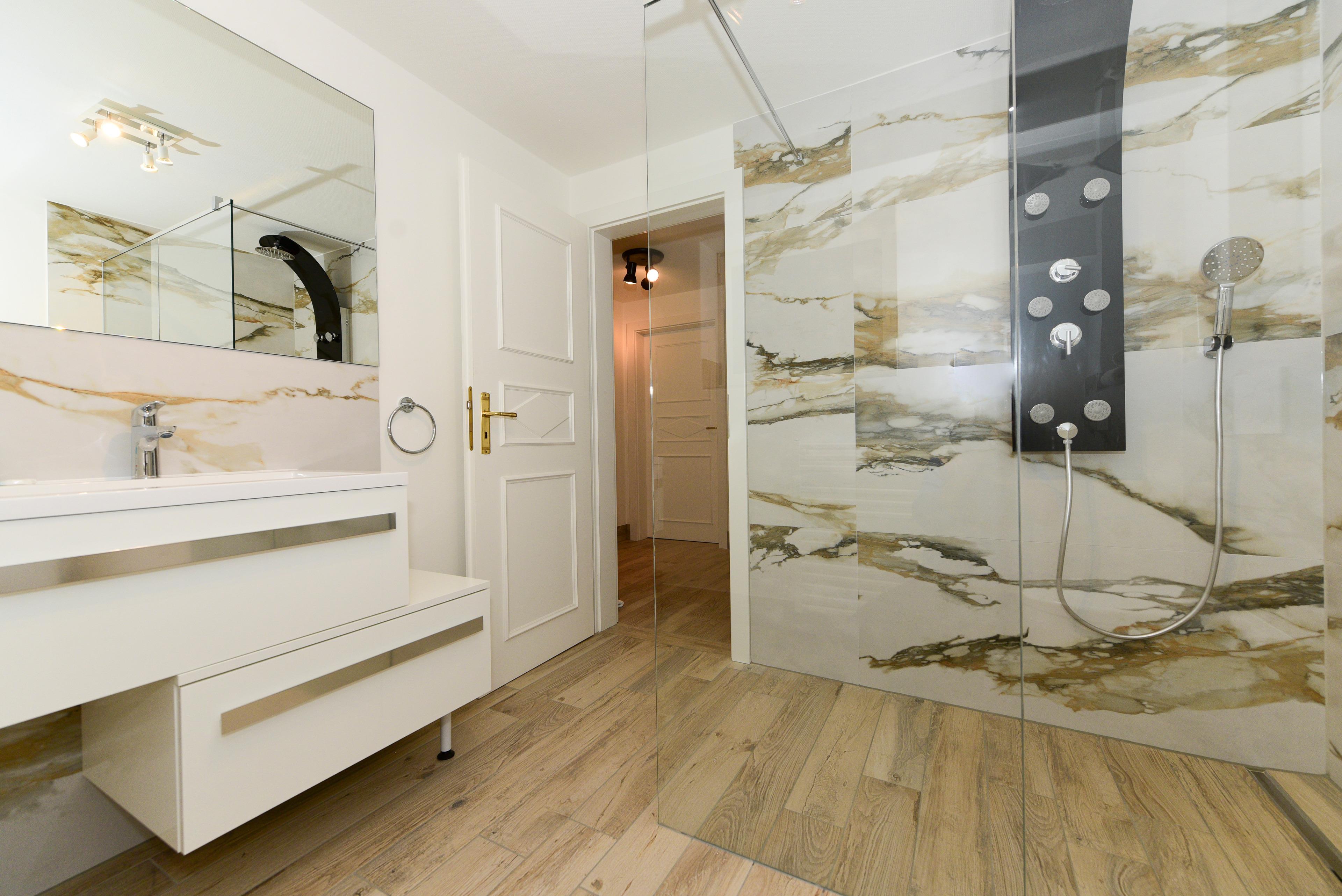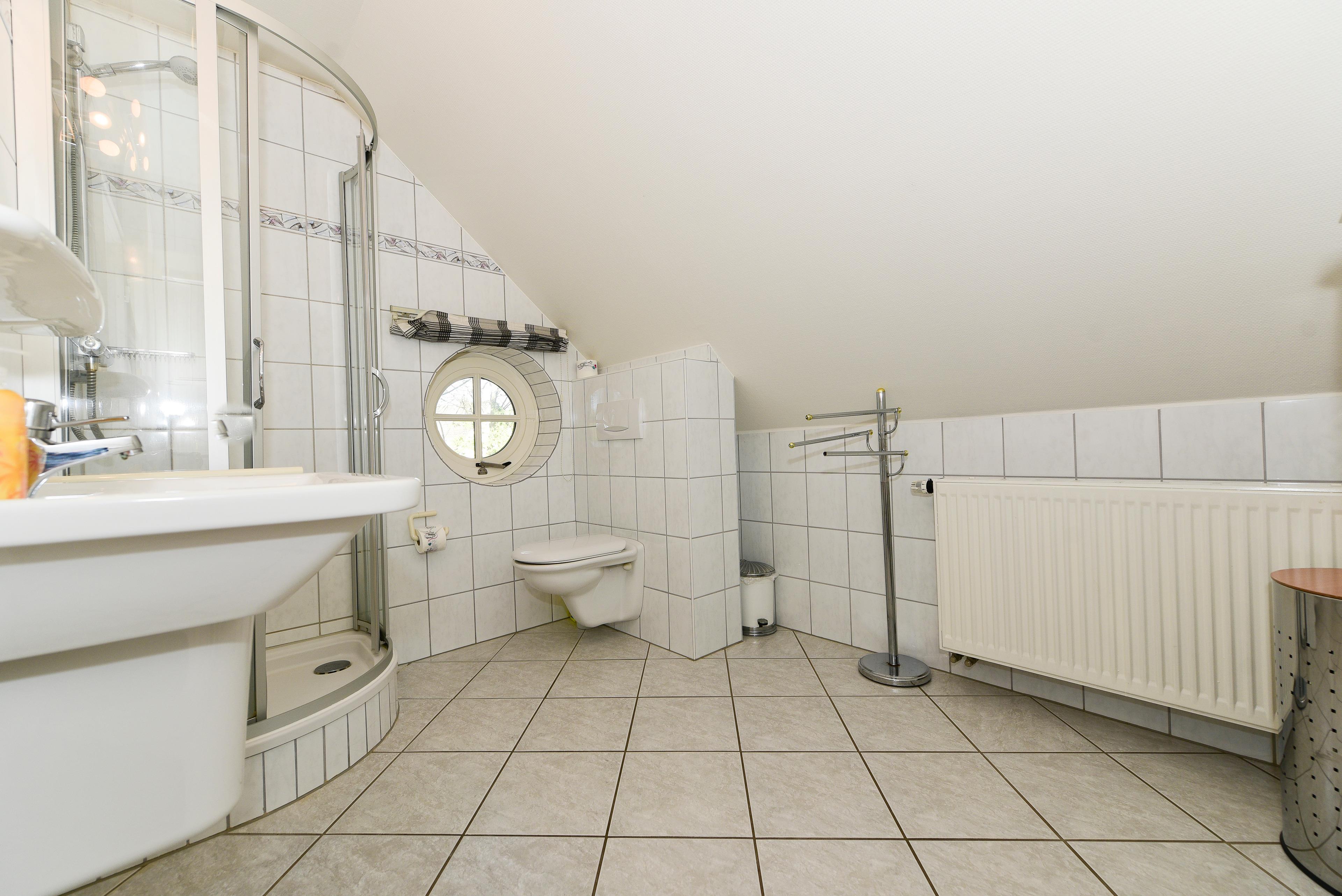 Die beiden Duschbäder, eines im Obergeschoss und eines im Souterrain, sowie ein zusätzliches Gäste-WC im Erdgeschoss bieten zusätzlichen Komfort und Privatsphäre.