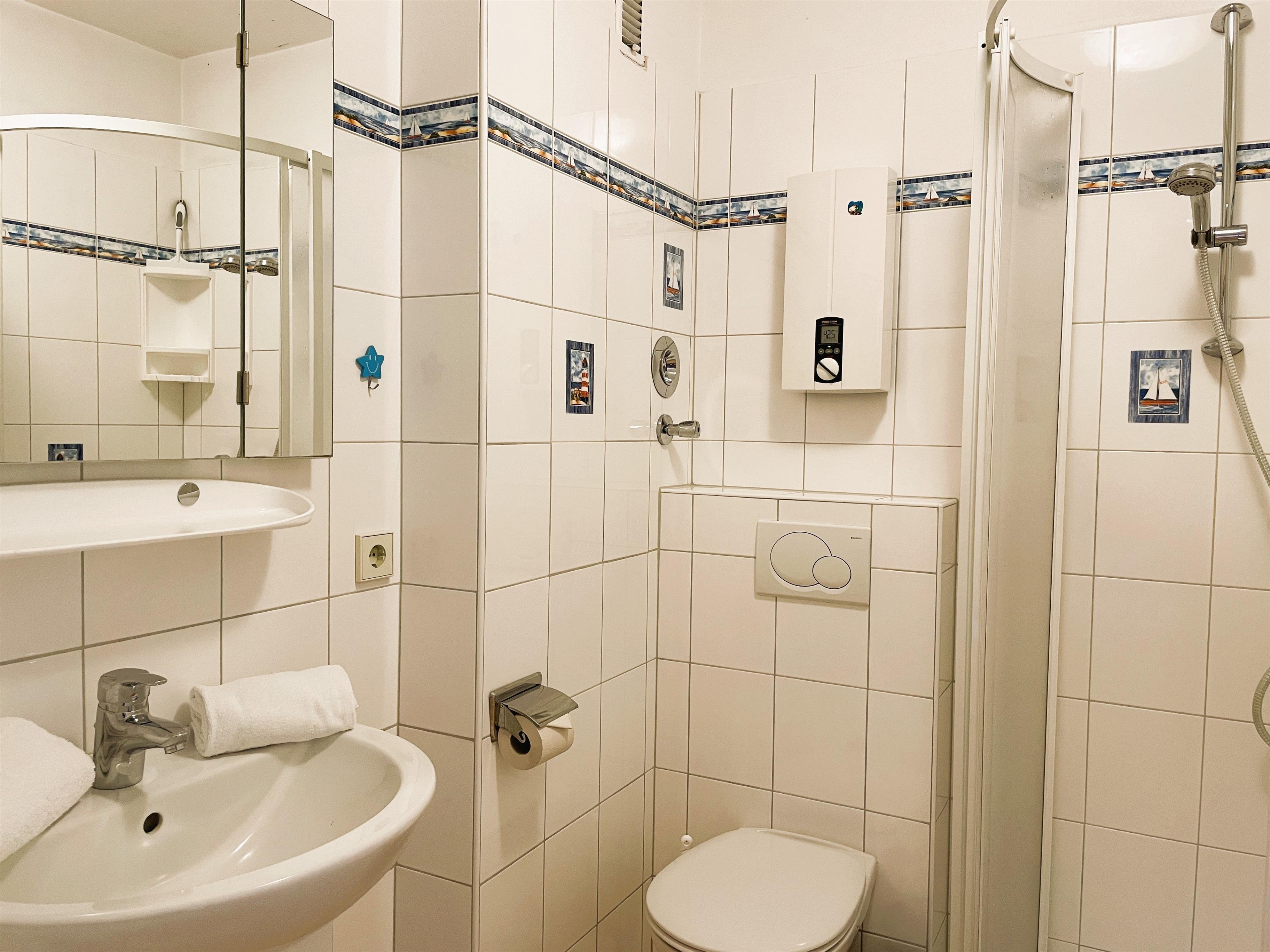 Das Appartement Meerblick 1b (ca. 33m) liegt im Erdgeschoss des Hauses und lädt zu herrlichen Urlaubstagen direkt am Strand ein. Genießen Sie das Frühstück auf der Terrasse mit großer Wiese und Blick auf das Meer. Der lichtdurchflutete Wohnraum ist freundlich gehalten und besteht aus einer gemütlichen Sitzecke, einem hochwertigen Schrankbett (160x200cm) und einer Küchenzeile mit angrenzendem Essplatz. Liebevolle Details schenken der Wohnung Ihren besonderen Flair. Im Flur befindet sich ein weiteres Bett 90x190cm) für eine Person falls Sie dort Ihren Mittagschlaf genießen möchten oder als Ausweichmöglichkeit für die Nächte. Das Bad ist hell gefliest und funktional. Genießen Sie ein Appartement in exklusiver Lage!