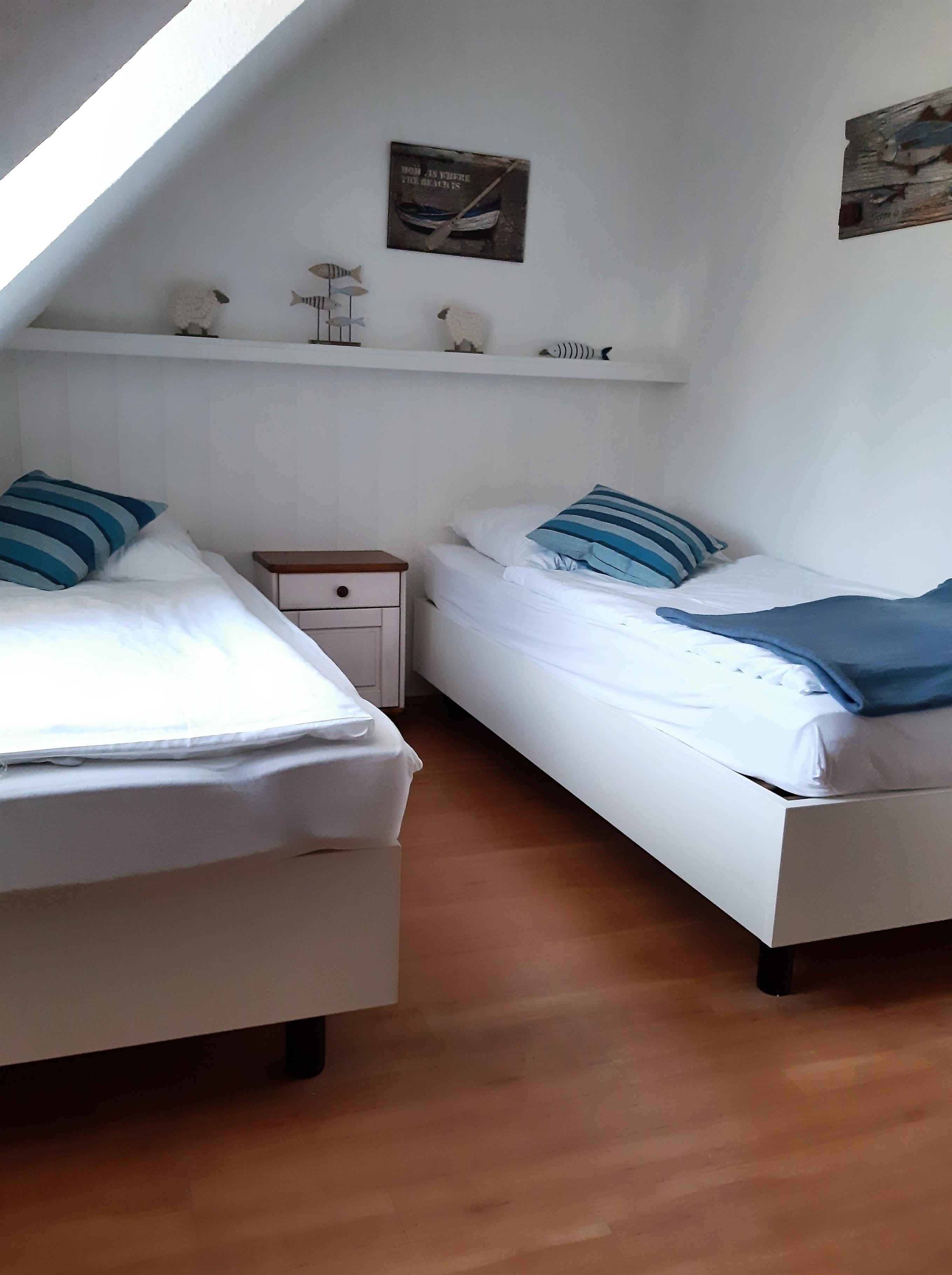 Unsere Ferienwohnung Apfelblüte (ca. 56 qm) befindet sich im ersten Obergeschoss und bietet vier Personen ein schönes Domizil für einen entspannten Föhrurlaub. Der L- förmige Wohn- Küchenbereich ist großzügig und lichtdurchflutet. Die offene, vollausgestattete Küchenzeile mit Ceranfeldherd, Backofen, Geschirrspüler, Mikrowelle und Essplatz ist modern und ansprechend. Der Wohnbereich mit hochwertiger Couchgarnitur, großem Flachbild-TV, DVD-Player, Musikanlage, WLAN und einer kleinen, aber feinen Auswahl an Lesestoff und Gesellschaftsspielen lädt zum Verweilen ein. Vom Flur aus gelangen Sie in die übrigen Räume. Ein Schlafzimmer mit zwei Einzelbetten ( eines davon steht unter direkter Dachschräge)mit Kleiderschrank verfügt über einen zweiten Flachbild-TV. Ein Doppelbett befindet sich im gemütlichen Dachgeschoss. Das Badezimmer mit Dusche und Fenster ist hell gefliest und modern. Die Wohnung Apfelblüte wurde von den Eigentümern liebevoll eingerichtet und dekoriert. Die Wohnung Apfelblüte verfügt über einen Terrassensitzplatz. Alle Einkaufsmöglichkeiten sowie die Promenade und der Strand sind in wenigen Gehminuten erreichbar. Unsere Ferienwohnung Apfelblüte ist ein ideales Domizil für Familien!