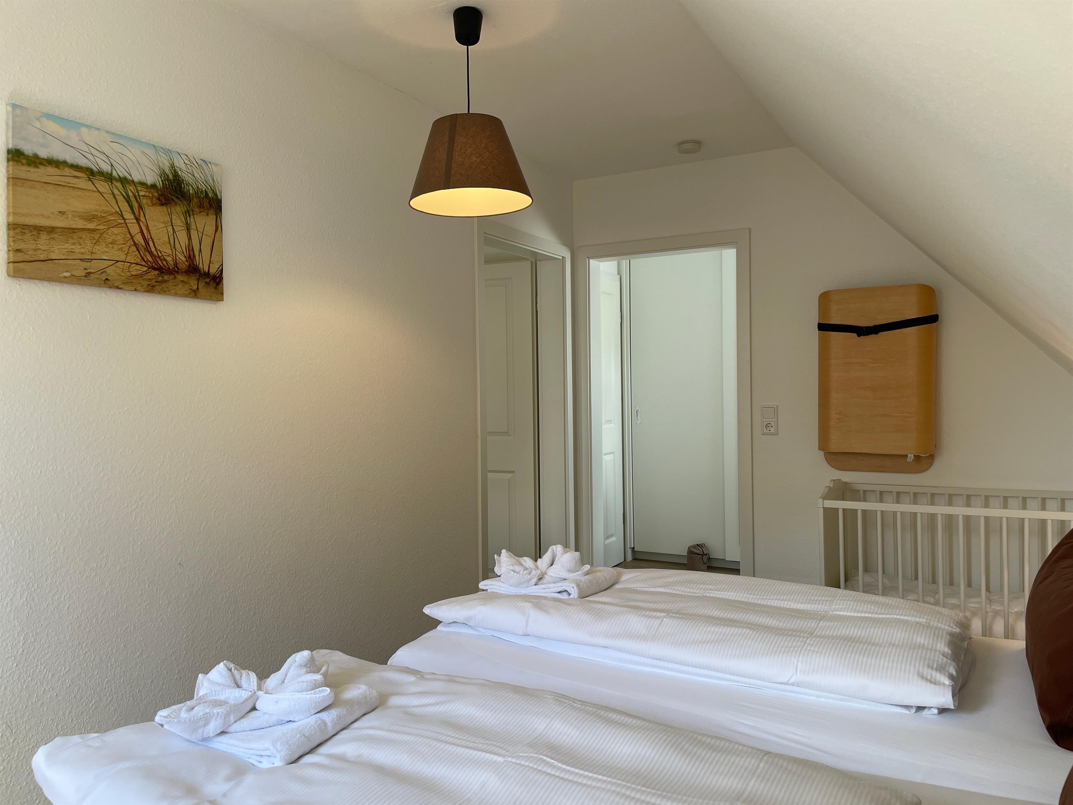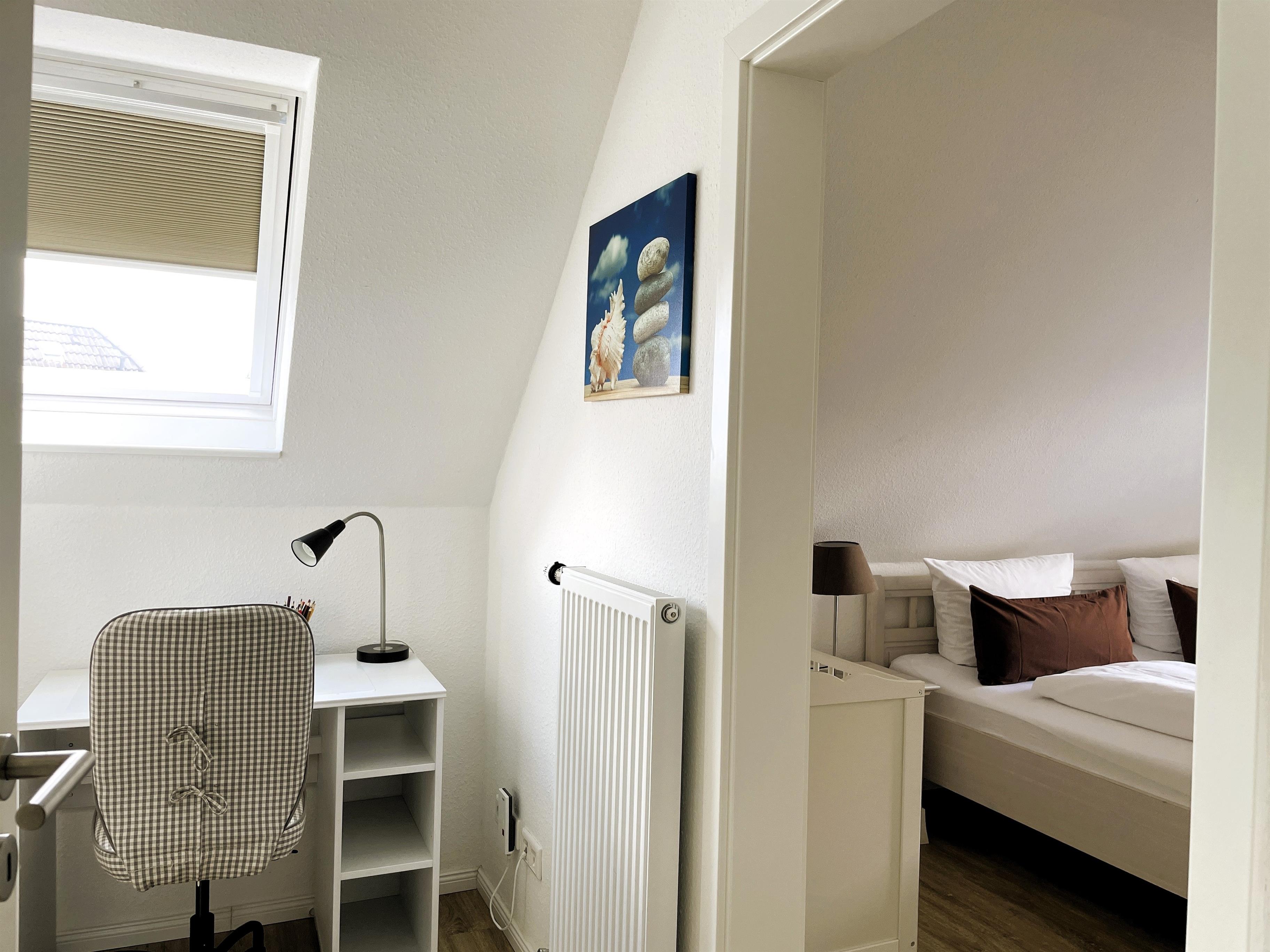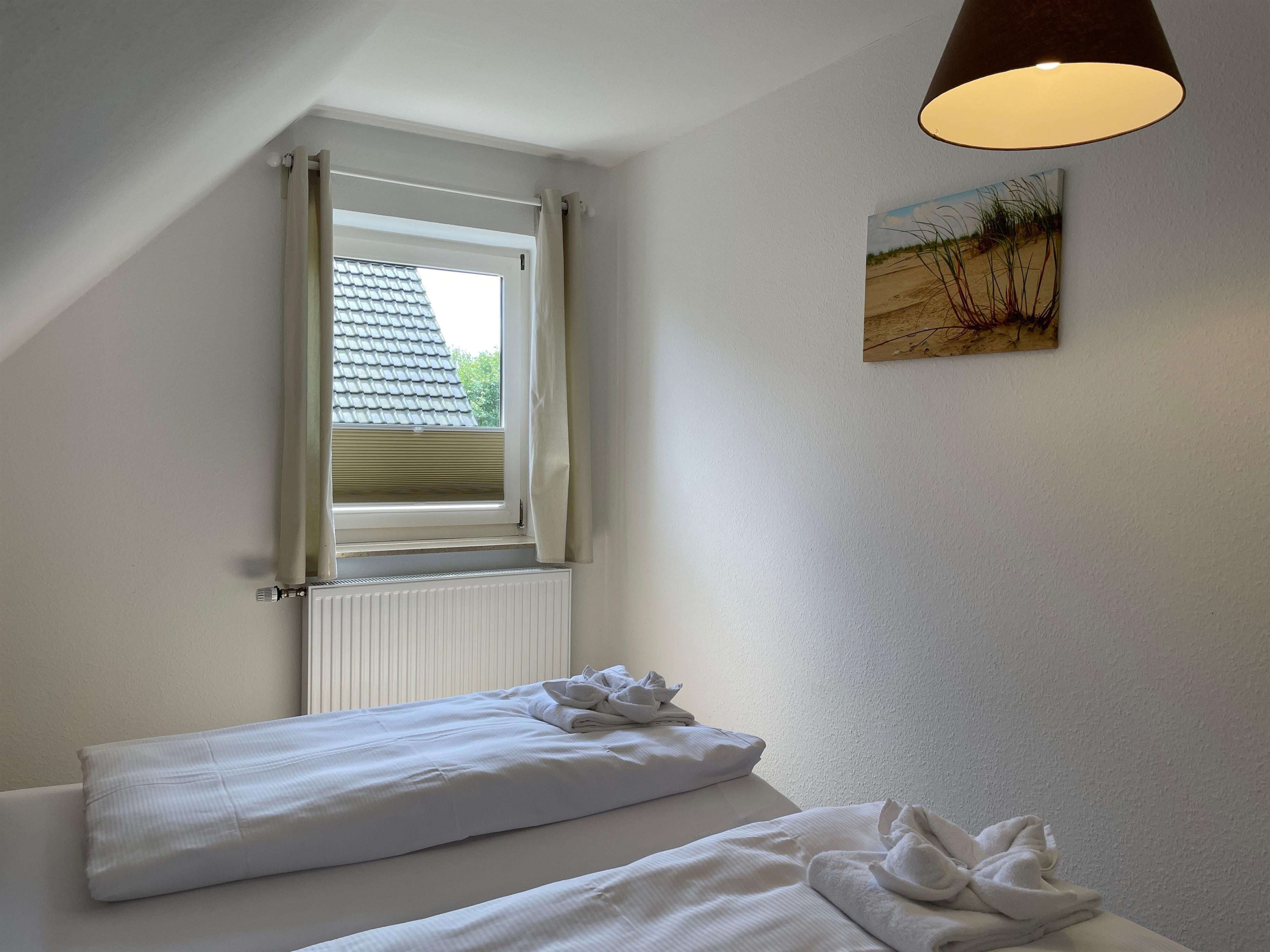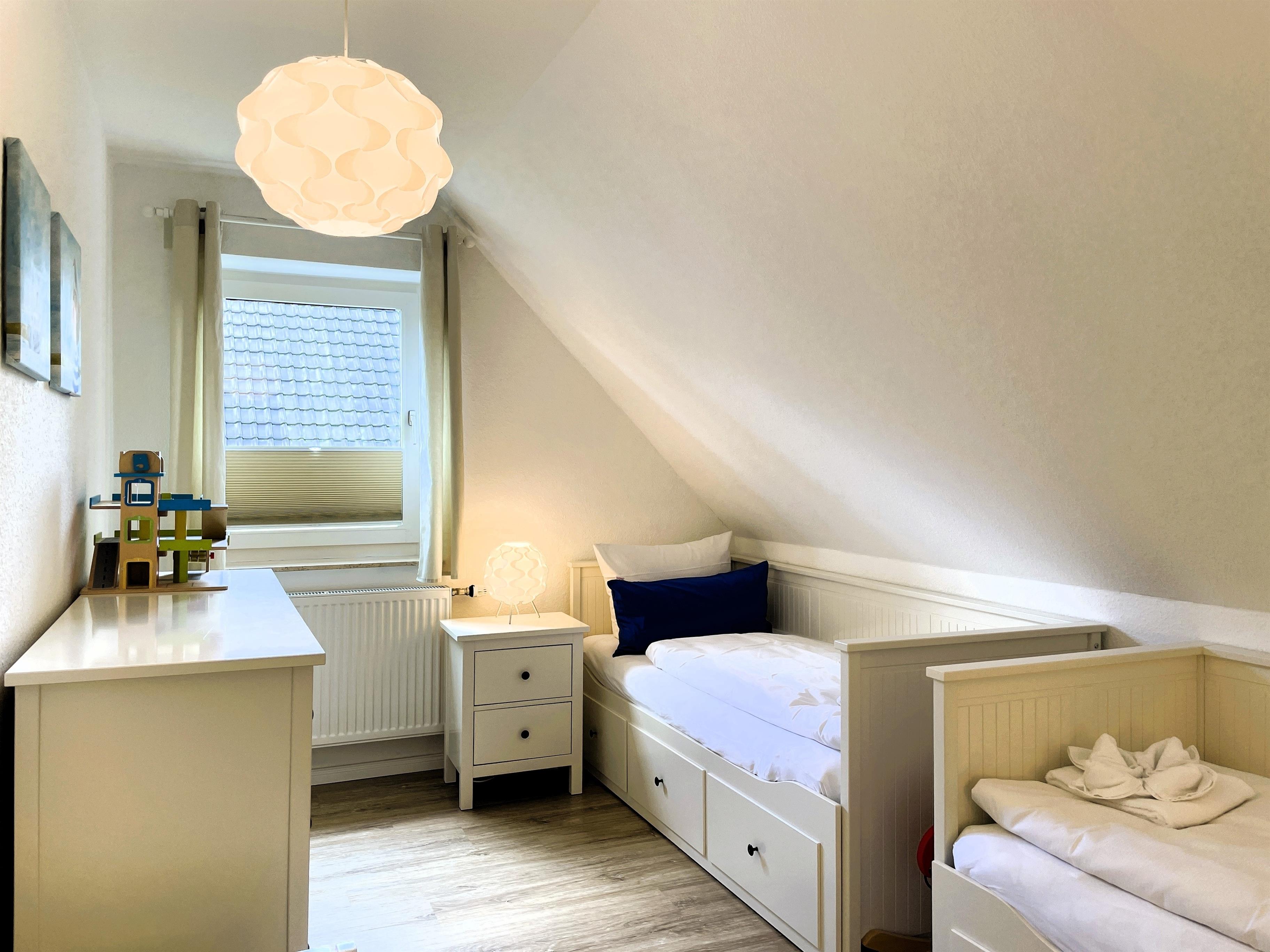 Über kurze Wege erreichen Sie die Innenstadt, die Strandpromenade mit ihren vielen Cafes und Boutiquen, sowie den Strand. Das Haupthaus ( Friesenstern 1 ) erstreckt sich für bis zu 6 Personen über 2 Ebenen, zuzüglich Keller. Es empfängt Sie ein großzügiger Eingansbereich, mit Zugang zu einem Gäste WC, einem Schlafzimmer mit zwei Einzelbetten (80x200 cm), dem geschmackvoll eingerichteten Wohnzimmer und der Küche. Vom hellen Wohn- Essbereich gelangen Sie auf ihre eigene Terrasse mit Strandkorb und in den Garten. Die Küche ist erstklassig ausgestattet, so dass sie selbst im Urlaub zum Kochen einlädt. Im Obergeschoss finden Sie ein Schlafzimmer mit einem Doppelbett (200x200 cm mit 2 Matrazen) und einem Babybett, sowie Wickelbereich, mit Zugang zu einem weiteren Schlafzimmer mit 2 Einzelbetten (80x200 cm). Ein weiteres Kinderbett kann dazu gestellt werden, so dass 6 Personen mit zwei Kleinkinder genügend Platz finden. Direkt neben dem Elternschlafzimmer befindet sich ein Ankleidezimmer mit Schreibecke, für das Erledigen Ihrer Urlaubspost oder sonstigen Schreibarbeiten. Des weiteren finden Sie in dieser Etage auch das große und moderne Badezimmer mit Dusche und Badewanne.