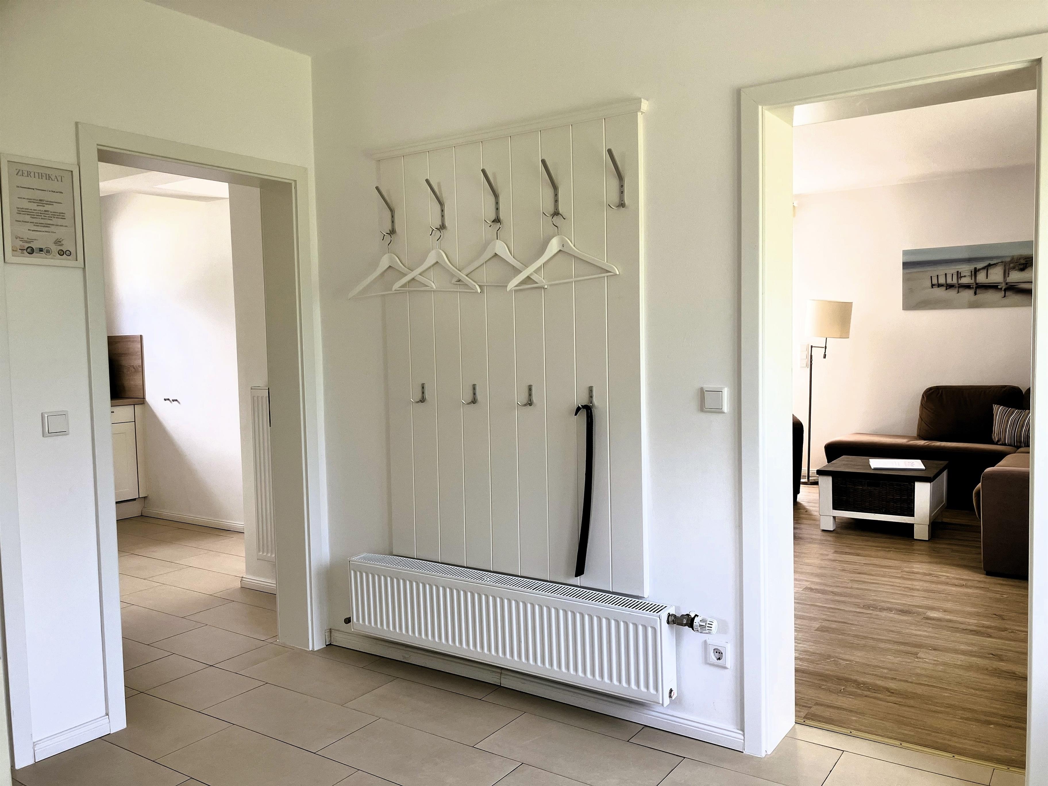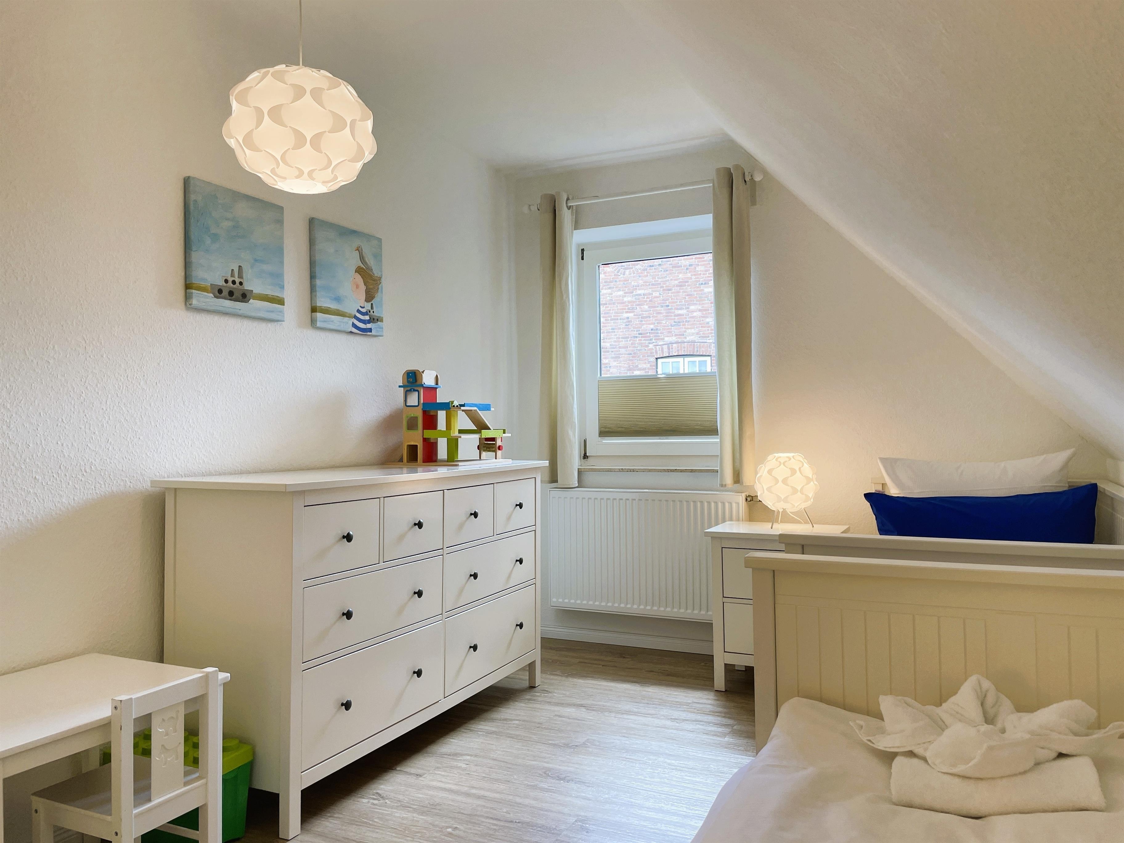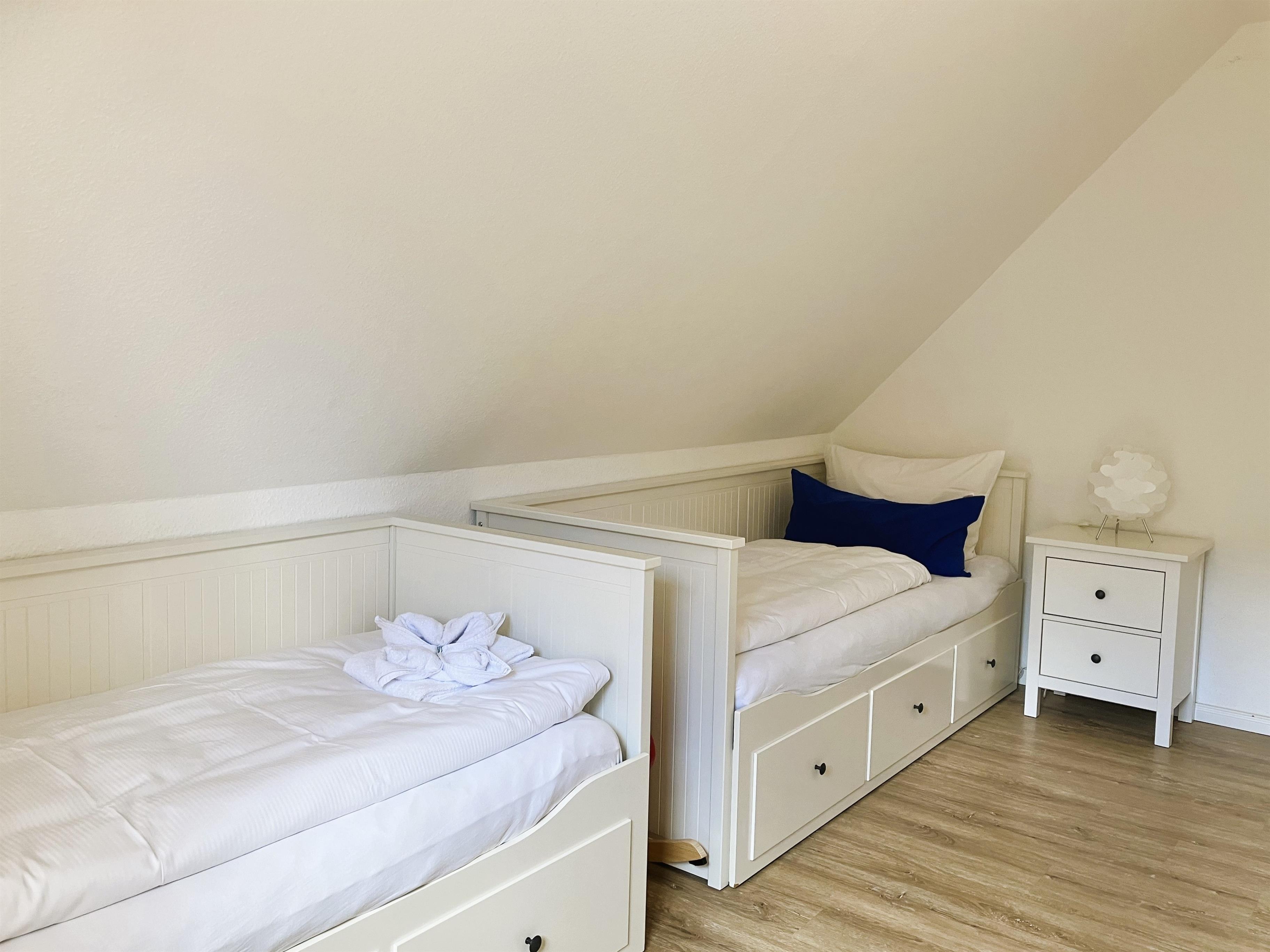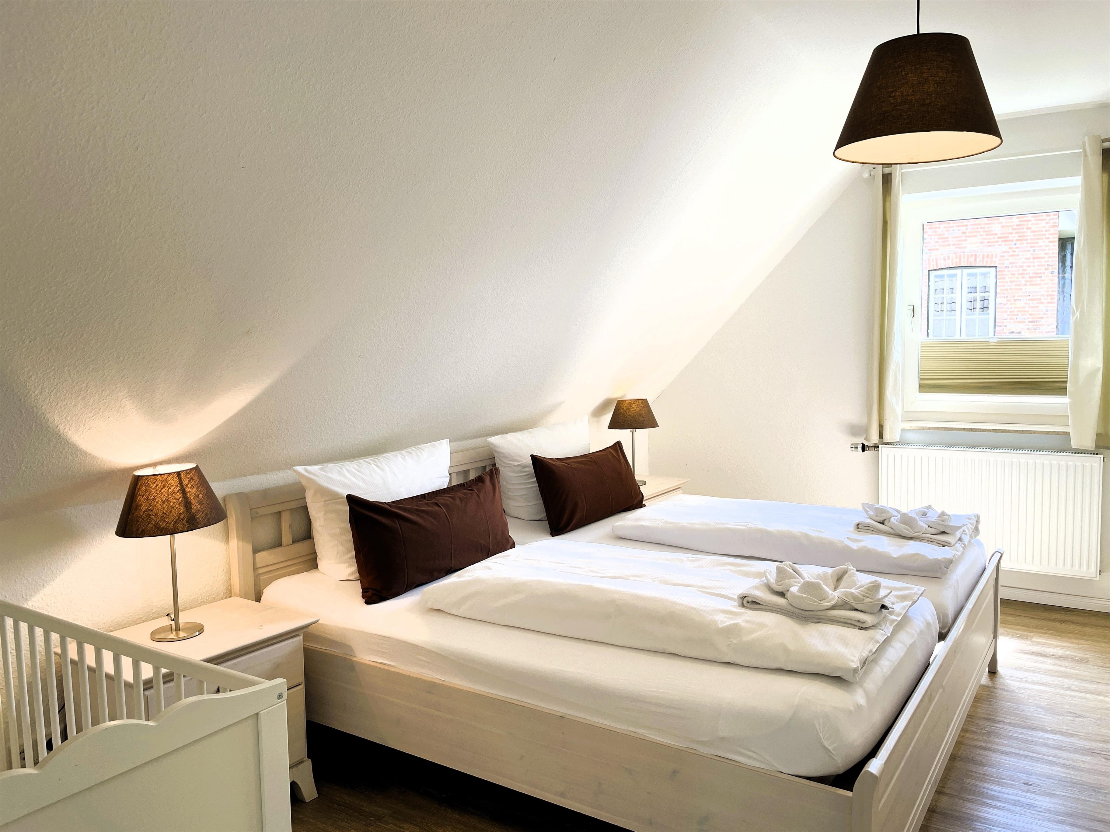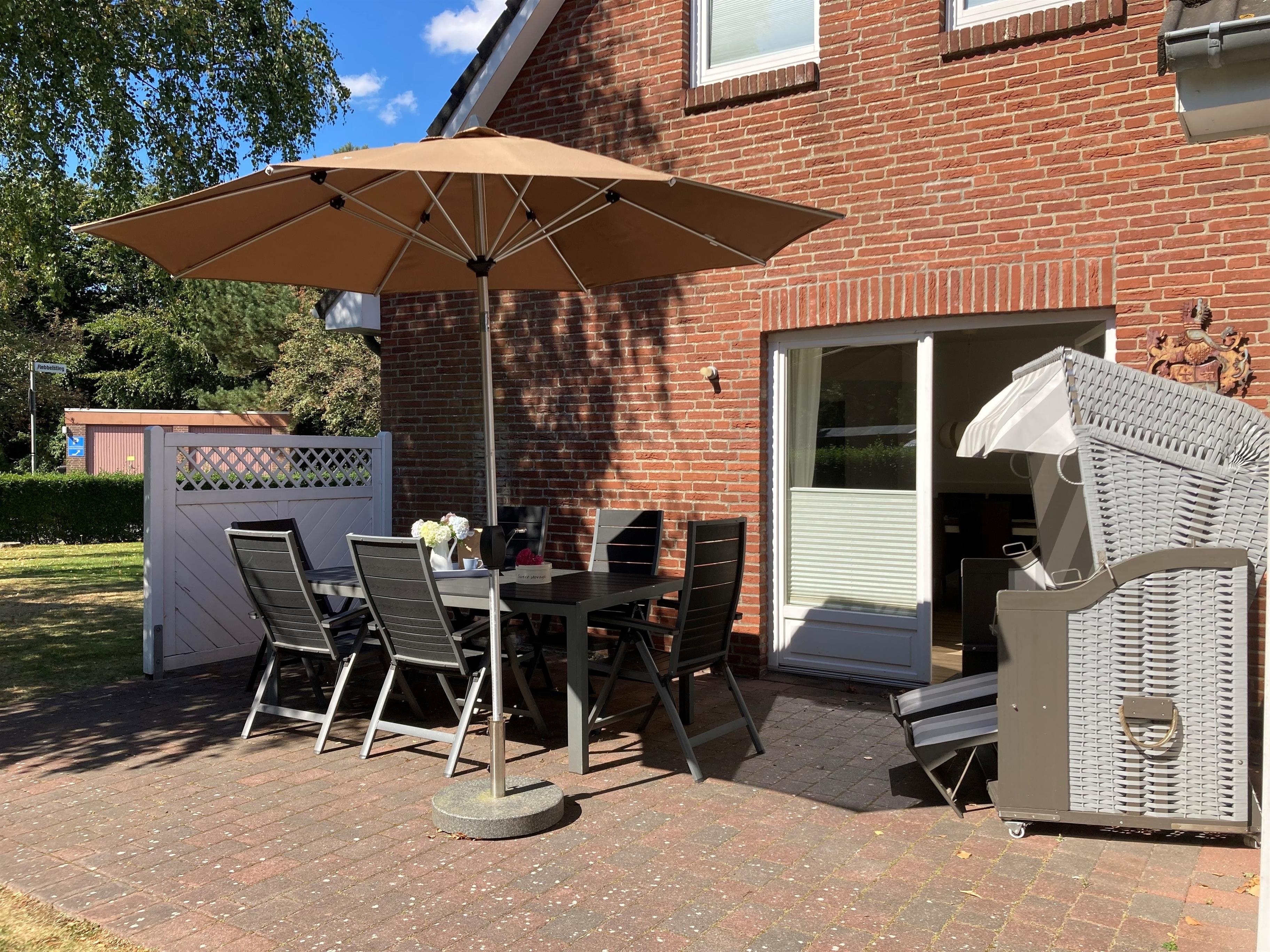 Über kurze Wege erreichen Sie die Innenstadt, die Strandpromenade mit ihren vielen Cafes und Boutiquen, sowie den Strand. Das Haupthaus ( Friesenstern 1 ) erstreckt sich für bis zu 6 Personen über 2 Ebenen, zuzüglich Keller. Es empfängt Sie ein großzügiger Eingansbereich, mit Zugang zu einem Gäste WC, einem Schlafzimmer mit zwei Einzelbetten (80x200 cm), dem geschmackvoll eingerichteten Wohnzimmer und der Küche. Vom hellen Wohn- Essbereich gelangen Sie auf ihre eigene Terrasse mit Strandkorb und in den Garten. Die Küche ist erstklassig ausgestattet, so dass sie selbst im Urlaub zum Kochen einlädt. Im Obergeschoss finden Sie ein Schlafzimmer mit einem Doppelbett (200x200 cm mit 2 Matrazen) und einem Babybett, sowie Wickelbereich, mit Zugang zu einem weiteren Schlafzimmer mit 2 Einzelbetten (80x200 cm). Ein weiteres Kinderbett kann dazu gestellt werden, so dass 6 Personen mit zwei Kleinkinder genügend Platz finden. Direkt neben dem Elternschlafzimmer befindet sich ein Ankleidezimmer mit Schreibecke, für das Erledigen Ihrer Urlaubspost oder sonstigen Schreibarbeiten. Des weiteren finden Sie in dieser Etage auch das große und moderne Badezimmer mit Dusche und Badewanne.