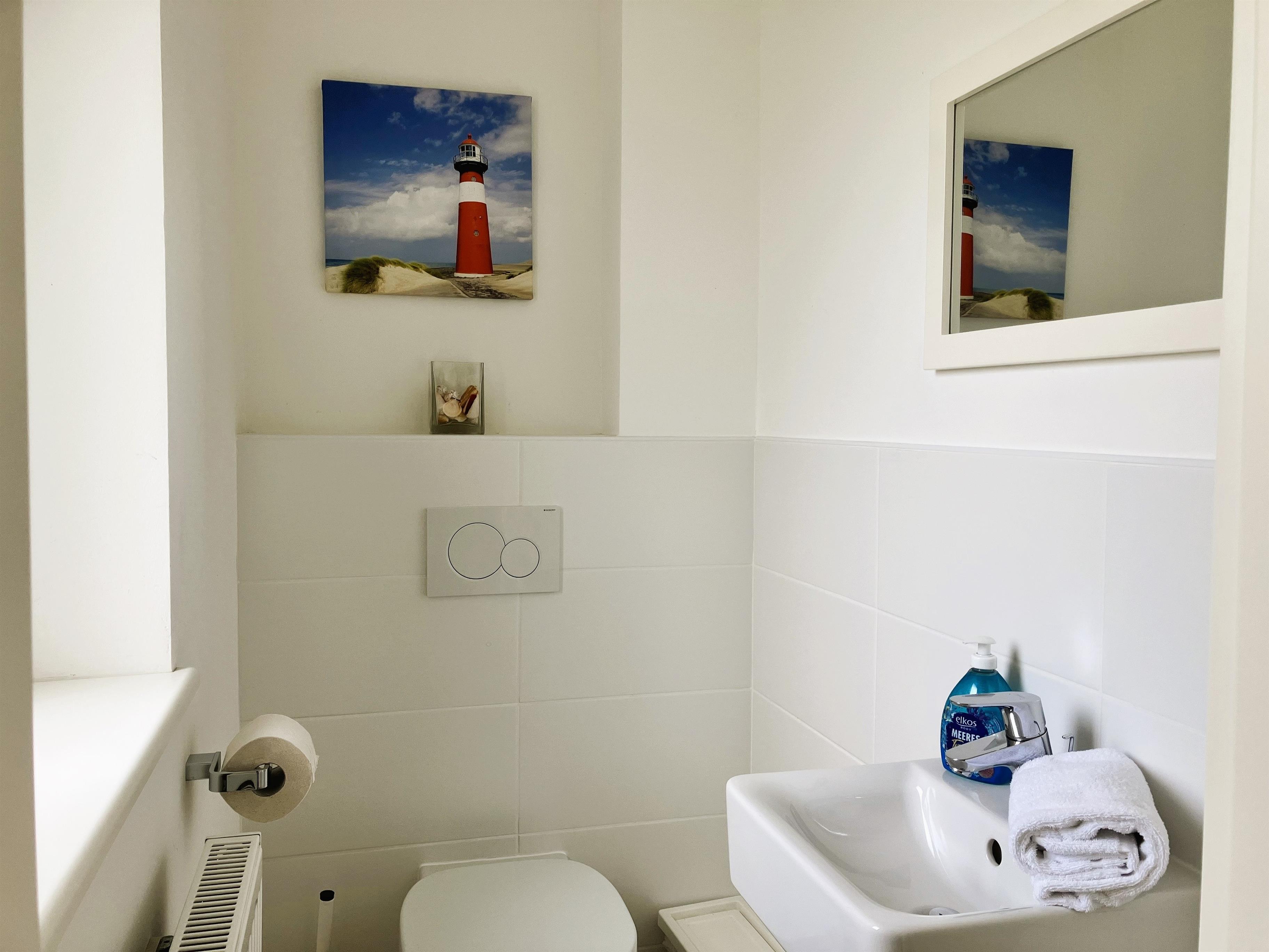 Das WC ist separat. Im Keller finden Sie eine große Waschmaschine, sowie einen Wäschetrockner. Ferner ist das Haus mit W-LAN ausgestattet. Auf Kinderfreundlichkeit wird großen Wert gelegt, so sind in allen Bereichen ausschließlich kindersichere Steckdosen eingebaut worden. Es stehen Wickelmöglichkeit, Babybadewanne, Hochstühlchen, Laufställchen, sowie Töpfchen und auch Babygeschirr zur Verfügung. Auf dem großen Waldspielplatz Löwenhöhle oder im Friesenmuseum gleich in der Nachbarschaft finden Klein und Groß Spaß und Interressantes über die grüne Insel.