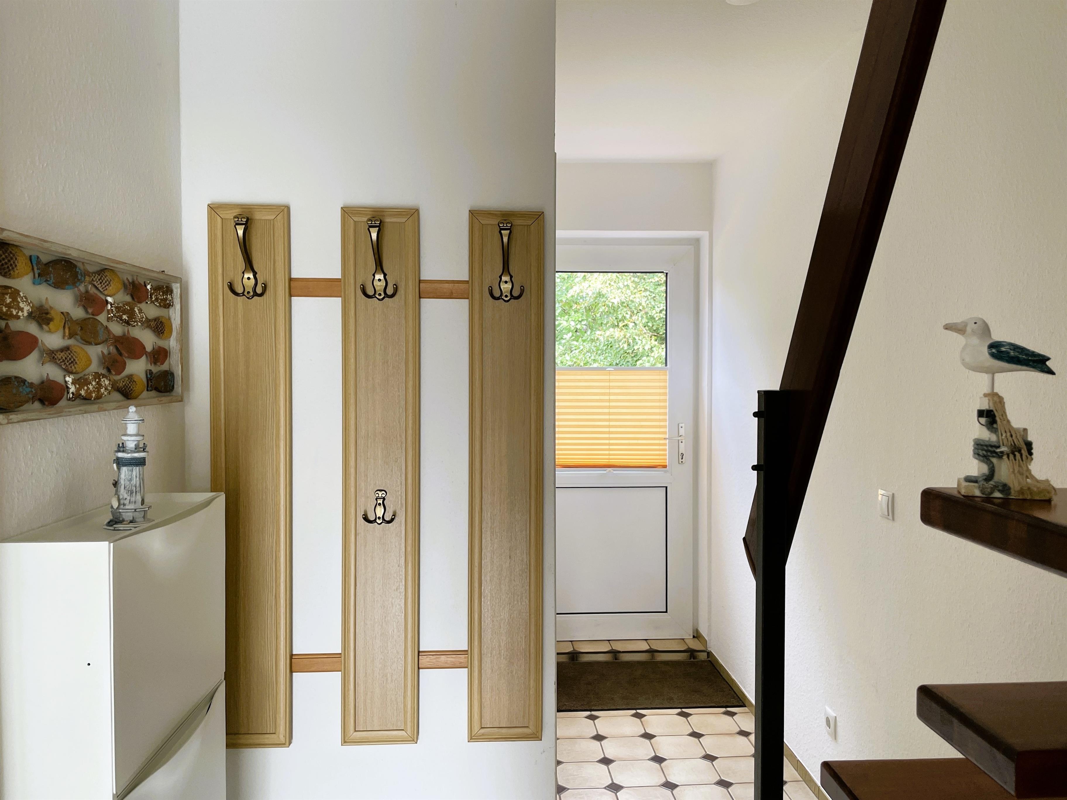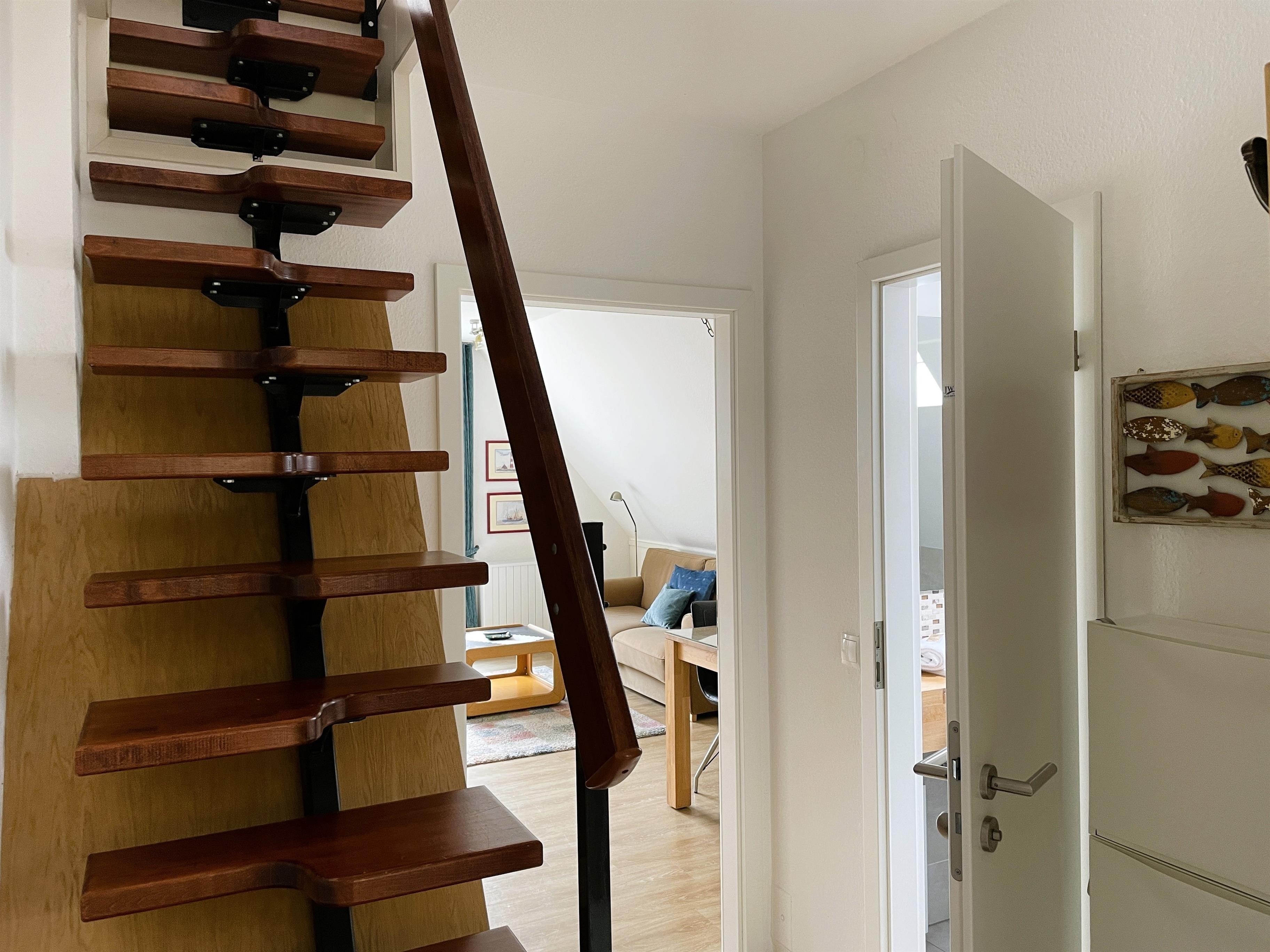 Unsere Wohnung Meeresbrandung befindet sich in der zweiten Etage in einem gepflegten, ruhig gelegenen , von Grün umgebenen Reihenhaus im Olhörnweg 1 und erstreckt sich über 2 Ebenen. Vom Eingang aus gehen Sie in eine vollausgestattete Küche mit Ceranfeld-Herd, Backofen, Mikrowelle, Wasserkocher, Kaffeemaschine, Geschirrspüler, Waschtrockner und Eierkocher, die zum Kochen einlädt.