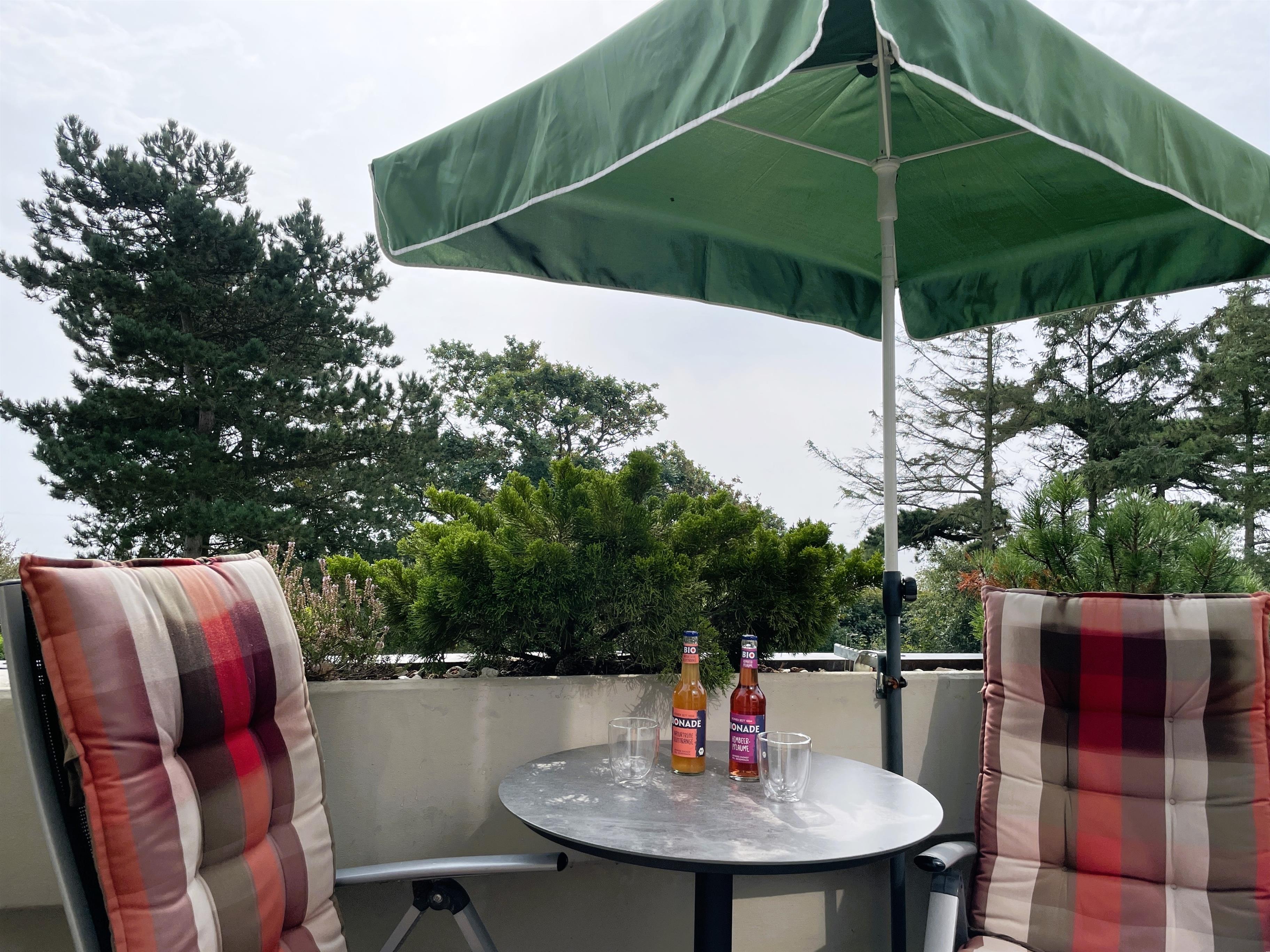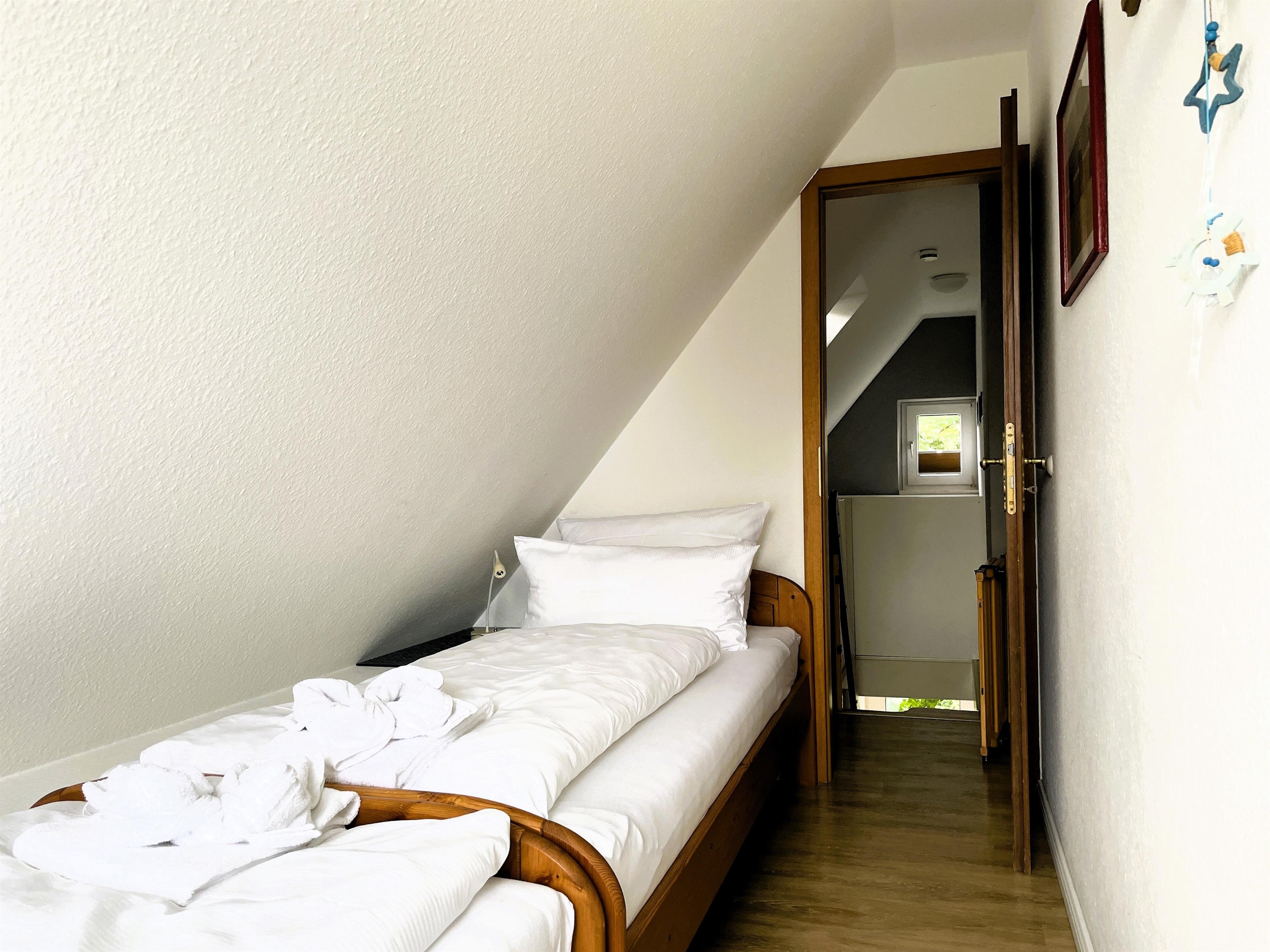 Daneben befindet sich das kleine Badezimmer mit Dusche, welches funktional ist. Das helle geräumige Wohnzimmer mit hochwertigem Schlafsofa mit Lattenrost (150 x190cm), gemütlichem Essbereich, Kabelfernsehen, W-LAN, Telefon mit kostenfreier Nutzung des deutschen Festnetzes führt auf den Balkon hinaus, der einen traumhaften Blick über den weitläufigen Garten hin zum Meer bietet. Das Obergeschoß erreichen Sie über eine Raumspartreppe, die am oberen Ende mit einem Treppenschutzgitter gesichert ist. Hier befinden sich zwei ineinander übergehende Schlafräume mit einem Doppelbett (160x 200 cm) und zwei Einzelbetten (teils unter einer Dachschräge je 90x200 cm). Von dem einen Raum haben Sie ebenfalls den schönen Blick auf das Meer. Alle wichtigen Versorgungseinrichtungen wie Bäcker, Supermarkt usw. erreichen Sie innerhalb von 10 Gehminuten. Zum Strand sind es ca. 100m und das Meerwasserwellenbad AquaFöhr erreichen Sie in wenigen Gehminuten. Das Zentrum von Wyk sowie die Promenade mit gemütlichen Cafés und Boutiquen sind in wenigen Gehminuten erreichbar.
