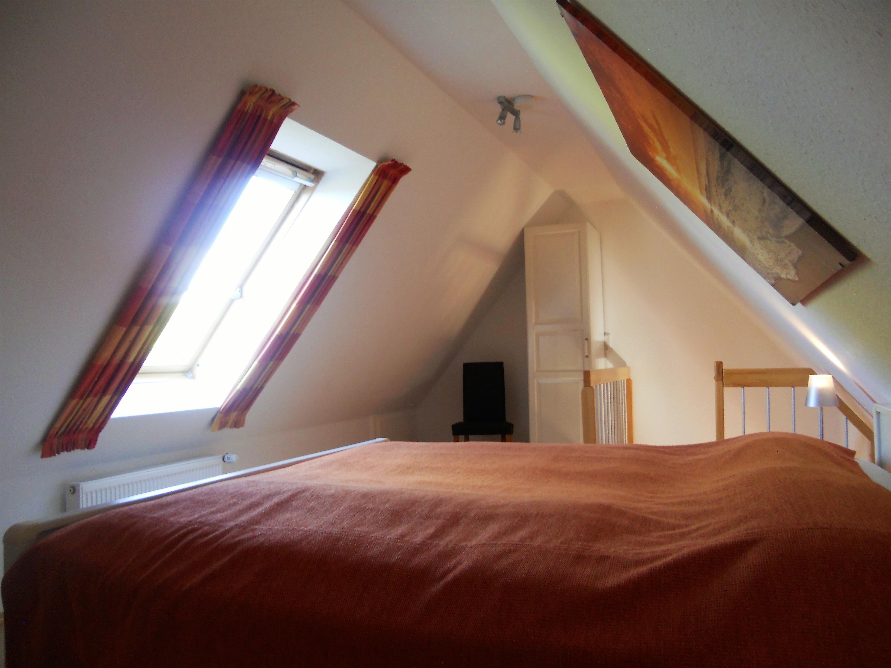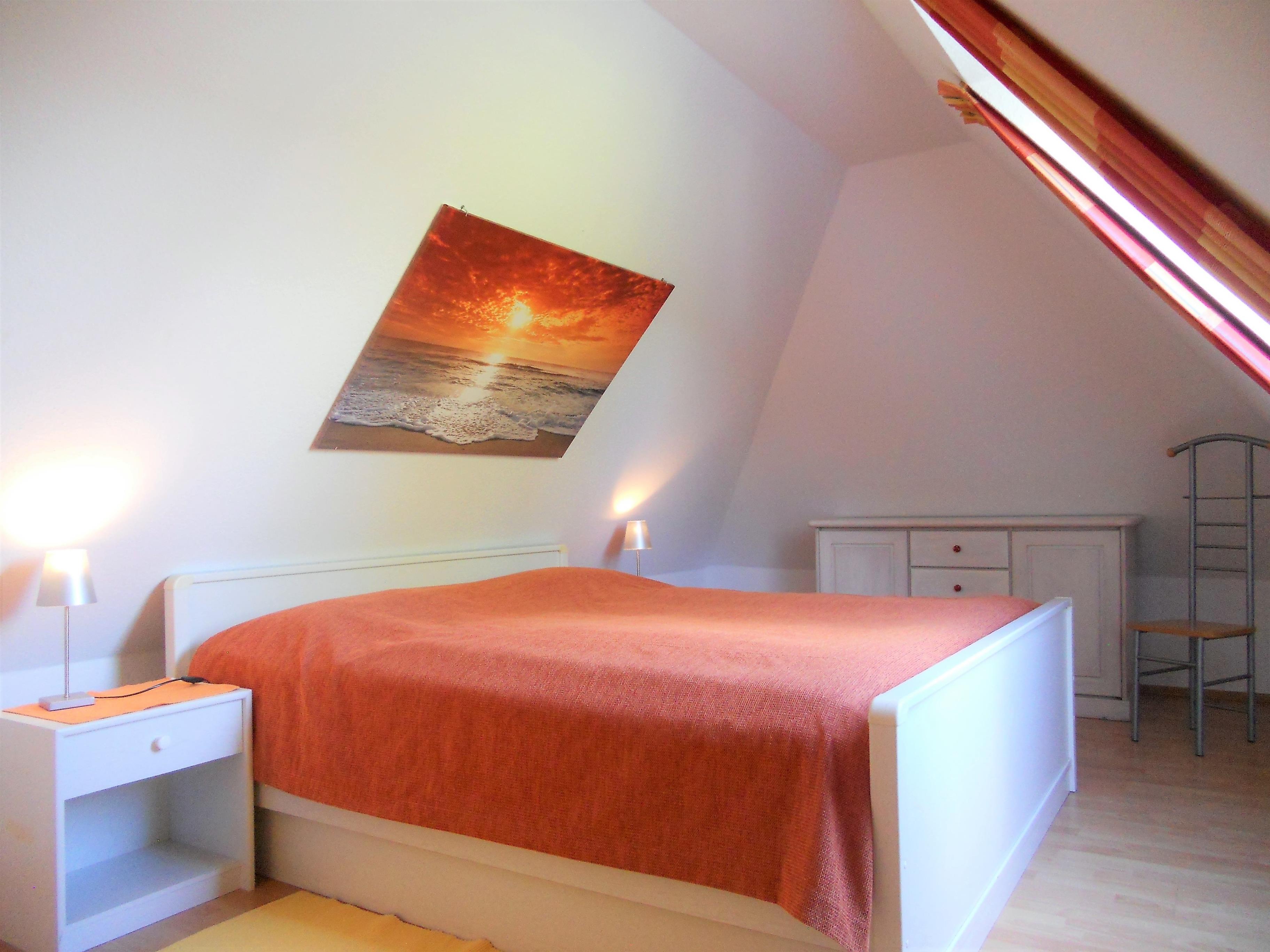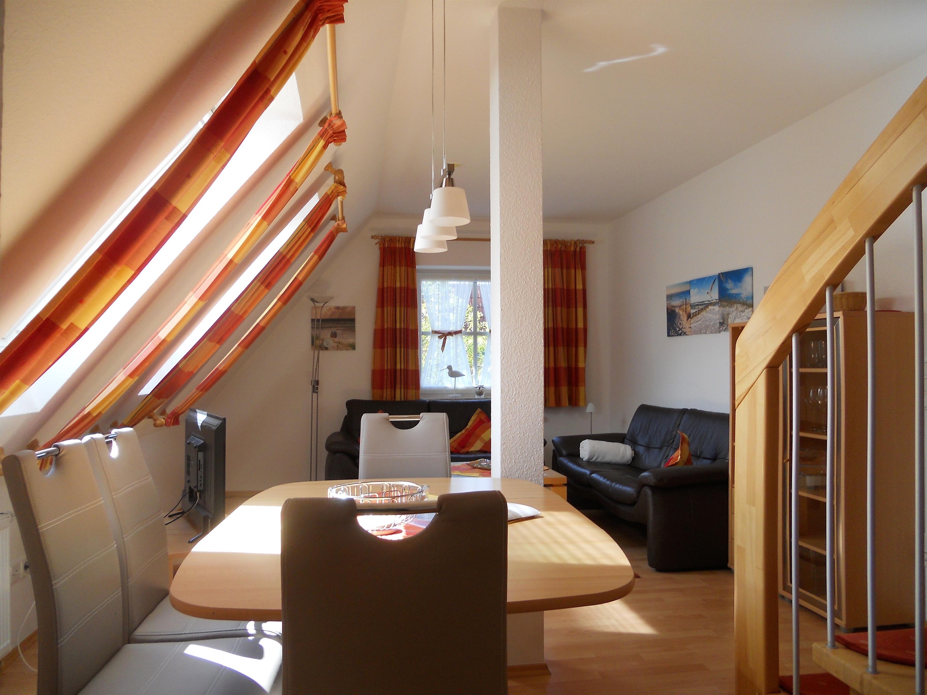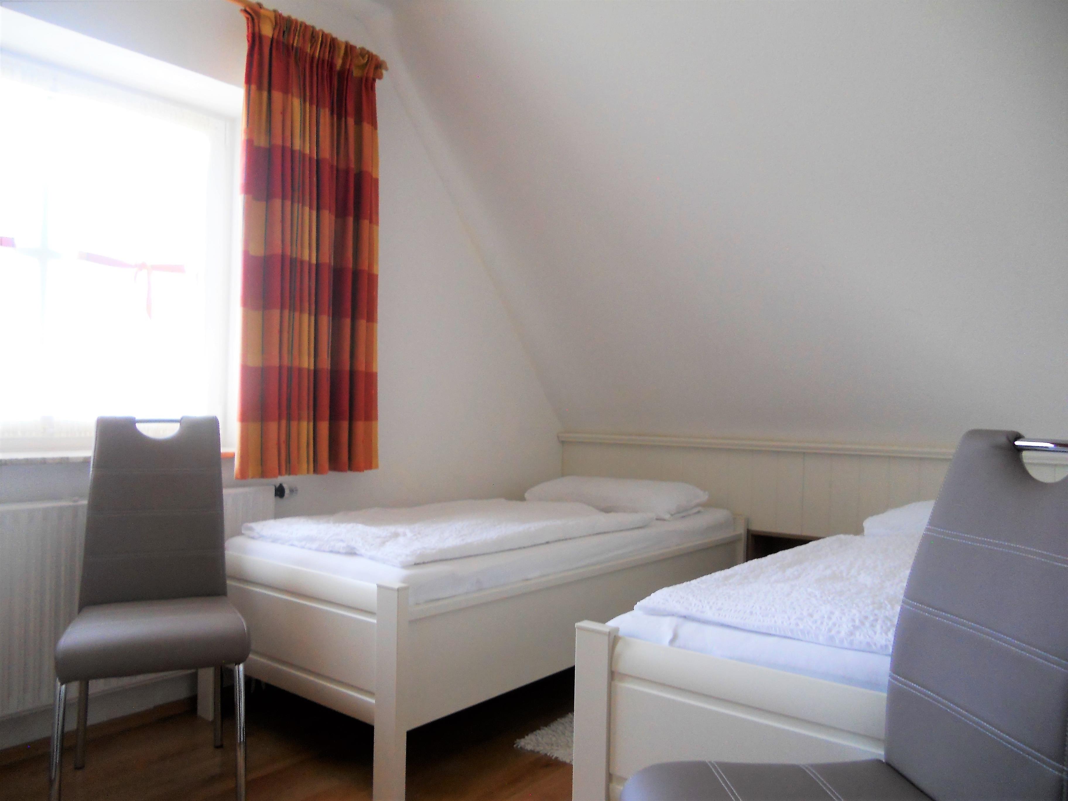 Im Herzen von Wyk gelegen, befindet sich in ruhiger Lage unser Domizil Rugstieg 8 mit seinen 4 Ferienwohnungen für 2 bis 5 Personen. Die Wohnungen des Hauses sind allergiker- und kinderfreundlich eingerichtet. Unsere Wohnung Rugstieg 8/4 erstreckt sich über das erste und zweite Obergeschoß und bietet bis zu 4 Personen genügend Platz für herrliche Urlaubstage. Das gemütlich eingerichtete Wohnzimmer ist liebevoll gestaltet und technisch gut ausgestattet mit WLAN, Telefon, Stereoanlage, Flachbild-TV und DVD-Player. Hier befindet sich auch der Essplatz neben der Treppe, die hinaus zum offenen Dachgeschoss-Schlafzimmer mit Doppelbett führt. Auf der ersten Etage befindet sich weiterhin ein Schlafzimmer mit zwei Einzelbetten, das Bad mit Dusche und Föhn sowie die separate Küche mit Ceranfeld-Herd und Backofen, Geschirrspüler, Mikrowelle und vielem mehr. Probieren sie doch mal friesische Gerichte in Ihrem Urlaub aus. In der Wyker Innenstadt finden Sie freundliche Buchhändler, die schöne friesische Kochbücher anbieten. Im Untergeschoss des Hauses befindet sich eine Sauna mit einigen Fitnessgeräten sowie Waschmaschine und Trockner zur gemeinsamen kostenfreien Nutzung. Das gepflegte Haus mit dem idyllischen Garten liegt wenige Meter vom Wyker Stadtwädchen mit dem Abenteurspielplatz Löwenhöhle entfernt und lädt somit Jung und Alt zum Spazierengehen und Verweilen ein. In ca. 10 Gehminuten erreichen Sie den Strand und das Meer sowie die Fußgängerzone mit zahlreichen Cafés, kleinen Geschäften und Restaurants. Schauen Sie sich die Wohnungen an und überzeugen Sie sich selbst! Wir freuen uns auf Ihren Anruf.