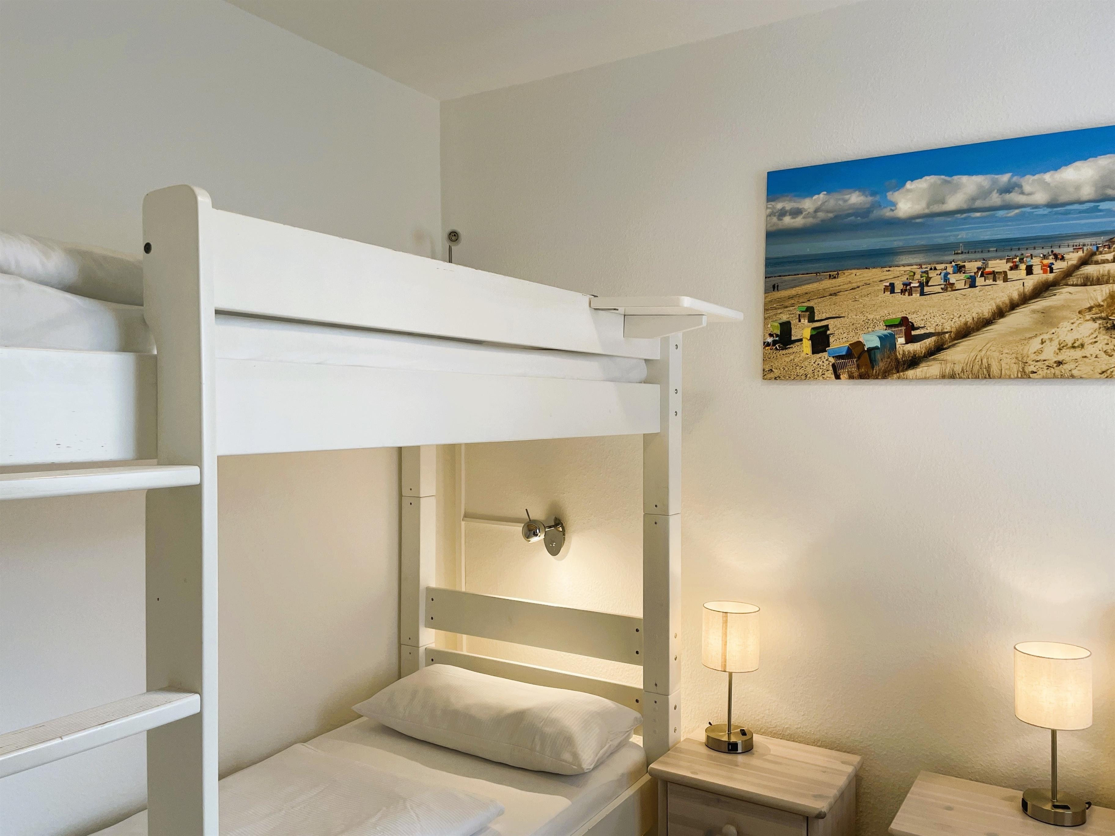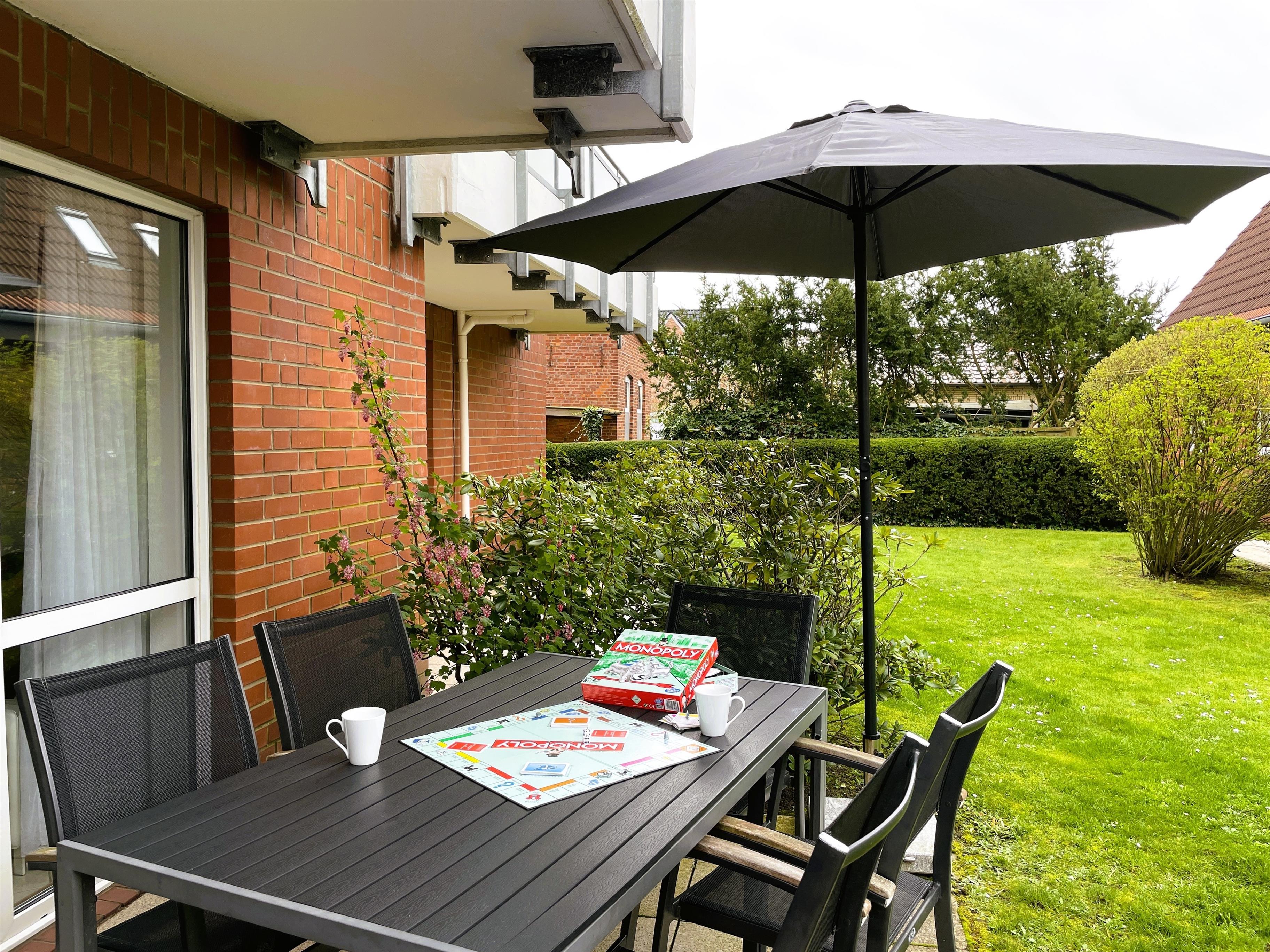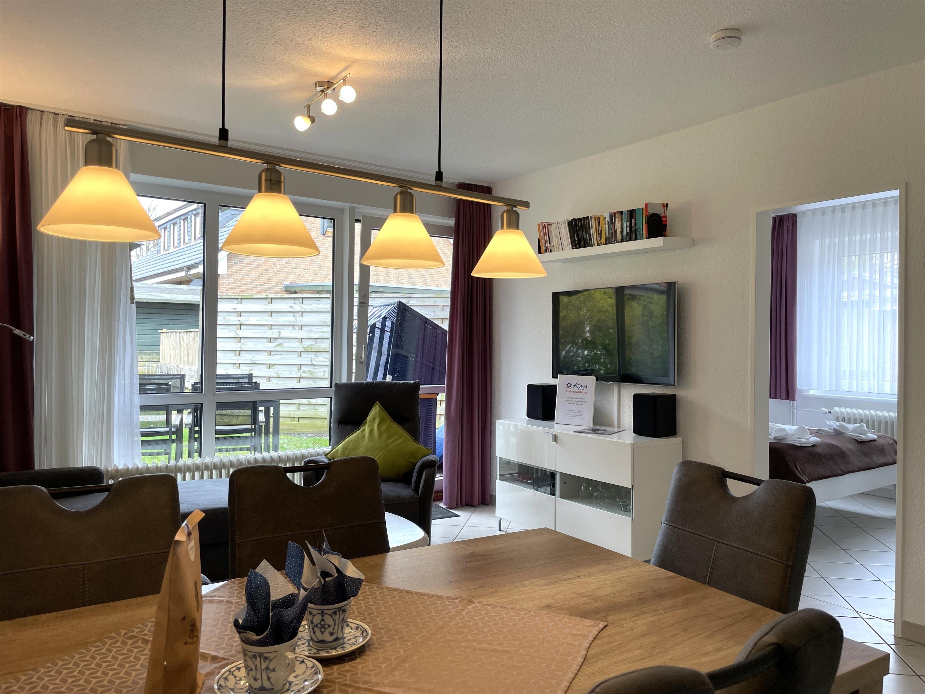 Unsere Erdgeschosswohnung Seeadler 10, ca.60 qm groß, liegt im hinteren Teil des Hauptgebäudes. Genießen Sie Ihren Urlaub auf Föhr in einer einladenden Ferienwohnung, die mit viel Sorgfalt eingerichtet wurde und 4 bis max. 5 Personen mit Hund genügend Raum und Platz bietet. Der gemütliche Wohn- Essbereich mit integrierter Küche lässt keine Wünsche offen. Genießen Sie die feine Auswahl an Urlaubslektüre, erleben Sie einen unterhaltsamen Spieleabend vielleicht bei einer Runde Monopoly, entspannen Sie mit Flachbild-TV, WLAN oder guter Musik im elektrisch verstellbaren Relaxsessel. Die Küchenzeile ist mit Ceranfeldherd und Backofen, Mikrowelle mit Grillfunktion, Kühlschrank und Gefrierfach über Kaffeemaschine, Wasserhocher bis hin zu einem Eierkocher und vielem mehr sehr gut ausgestattet und lädt dazu ein die friesische Küche nachzukochen. Die Essgruppe bietet genügend Platz für kulinaische Köstlichkeiten. Vom Wohnbereich aus erreichen Sie die wohnungseigene Terrasse, welche im Sommer mit Gartenmöbeln zum Entspannen einlädt. Das innenliegende Bad ist hell gefliest und mit Dusche, Handtuchheizung und Föhn funktional. Vom Flur aus gelangen Sie in das Kinderzimmer mit einem Etagenbett (90x200cm) und einem Einzelbett (90x200 cm) sowie Kleiderschrank. Hier fühlen sich unsere kleinen Gäste wohl und können einen erlebnisreichen Urlaubstag bei einer schönen CD ausklingen lassen. Das Elternschlafzimmer, erreichbar vom Wohnzimmer aus, verfügt über ein Doppelbett (180x200cm) und einen großen Kleiderschrank. Verbringen Sie traumhafte Tage bei uns im Seeadler 10.