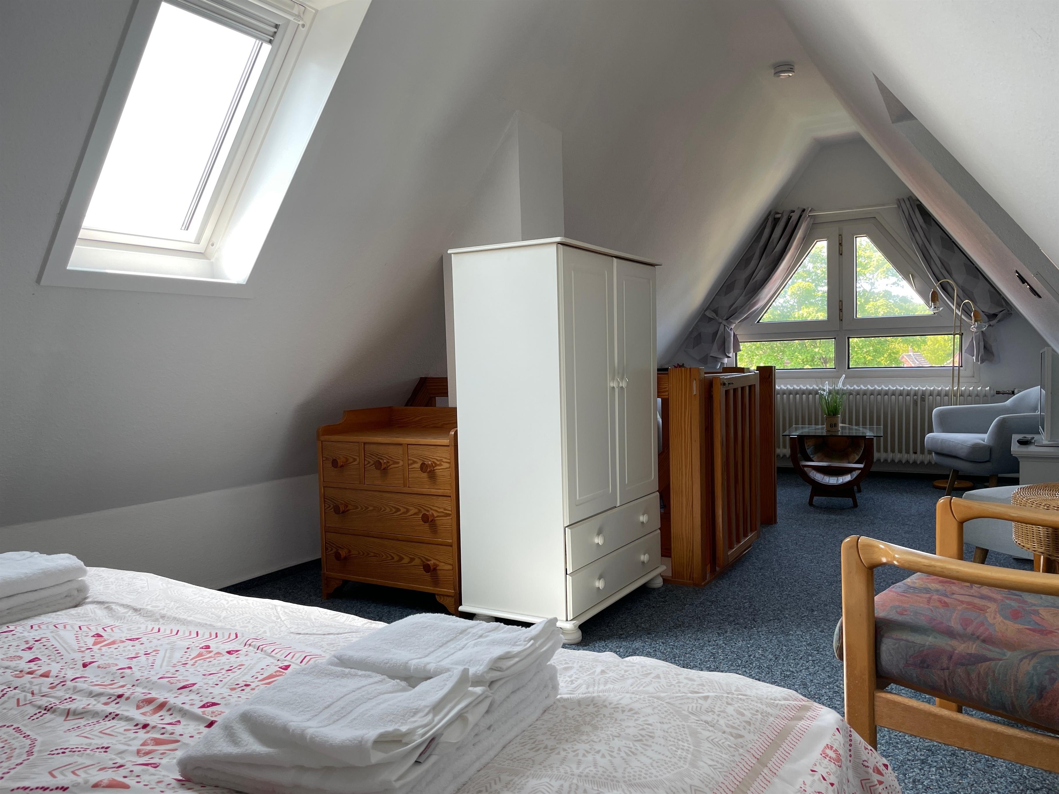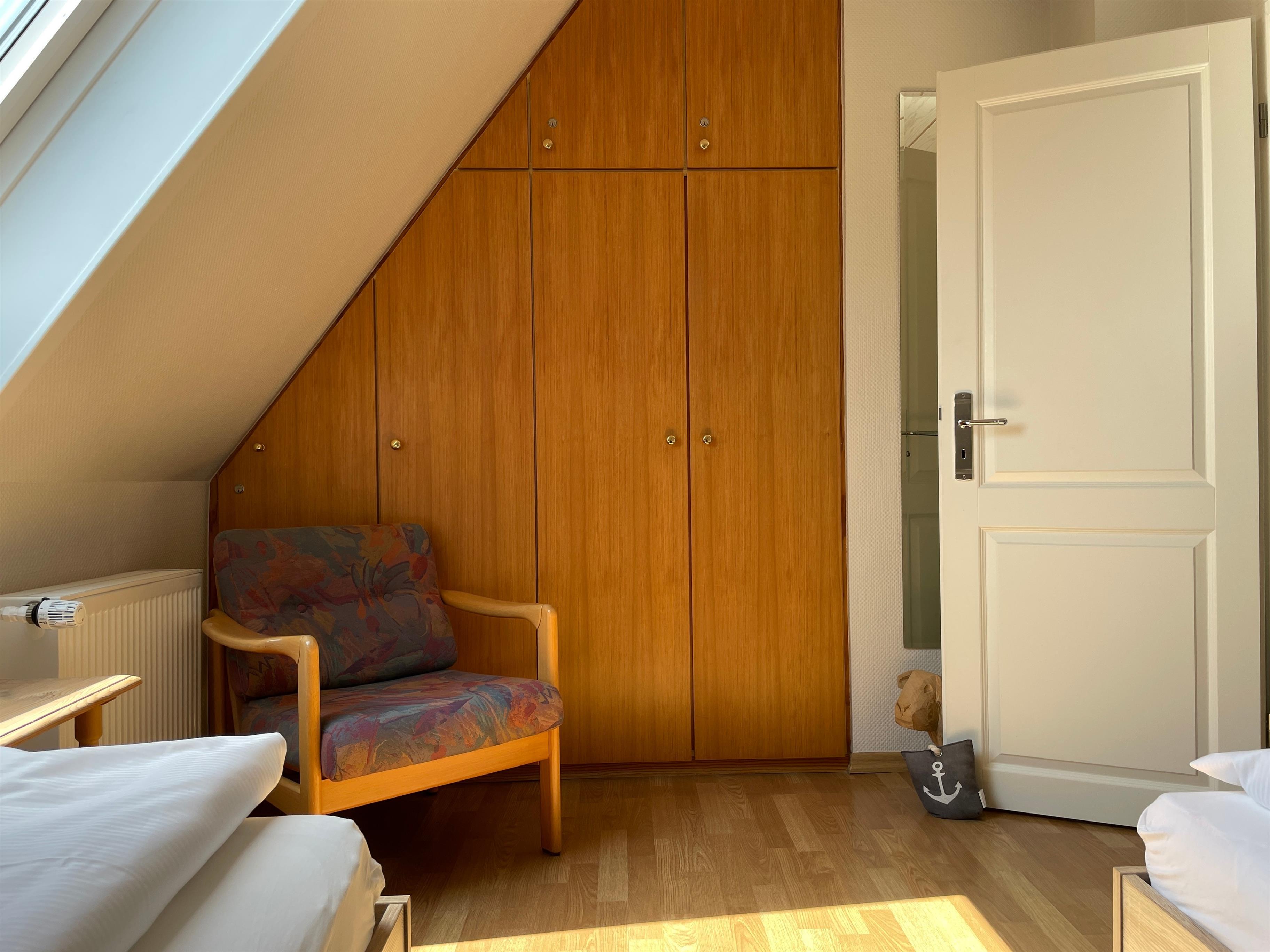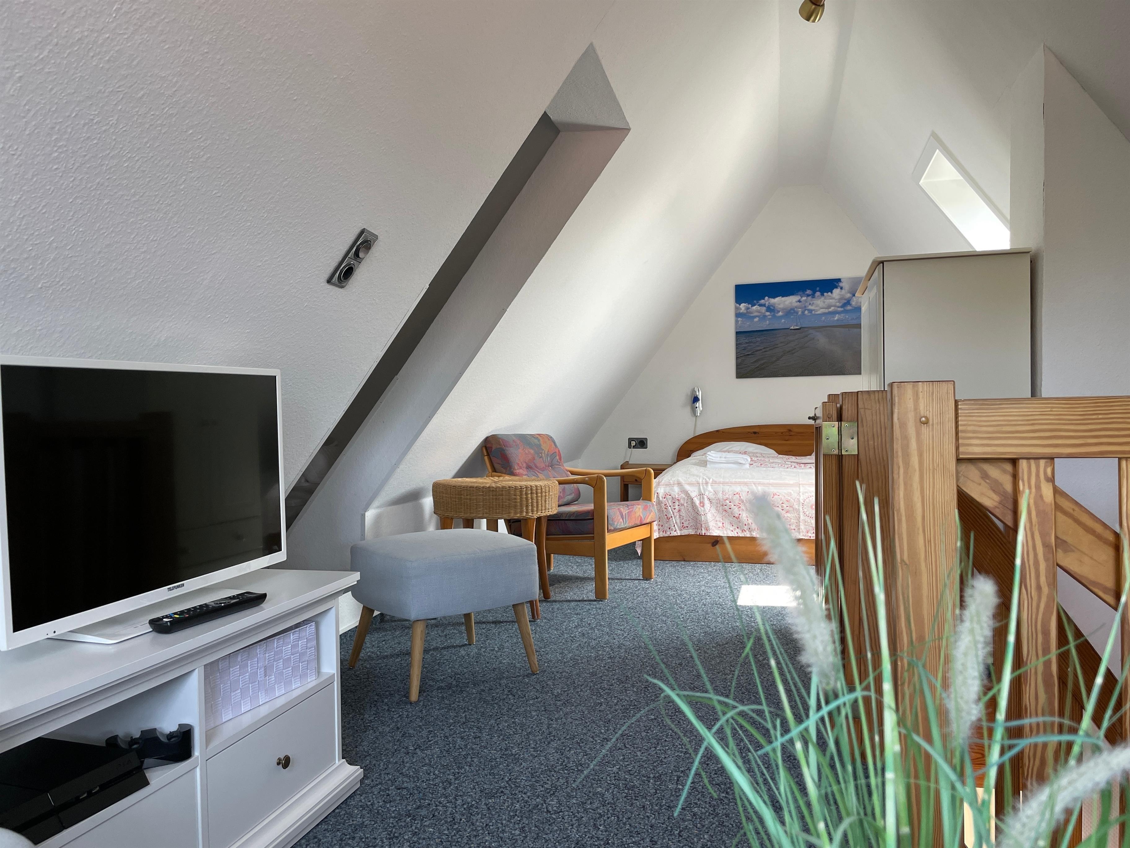 Die Ferienhausanlage Seeadler liegt in der verkehrsberuhigten Zone am Sandwall nur wenige Meter von Cafés, Restaurants, den kleinen Föhrer Geschäften und natürlich dem Strand und dem Meer entfernt. Auf der zweiten Etage der gepflegten Ferienhausanlage befindet sich unsere Wohnung Seeadler 15 und erstreckt sich über zwei Etagen. Während sich im unteren Teil der charmanten Maisonettewohnung das gemütliche Schlafzimmer mit zwei Einzelbetten (90x200cm), das helle Duschbad mit Waschtisch und Waschmaschine und der einladende Wohnbereich mit WLAN, einer Playstation 4, Smart-TV, Festnetztelefon, einem bequemen Schlafsofa (170x190cm) und der integrierten gut ausgestatteten Küchenzeile befindet, können Sie sich im oberen Teil der Wohnung wunderbar zurückziehen , um in der liebevoll eingerichteten Leseecke vielleicht den neu gekauften Föhrkrimi zu lesen oder ein anderes TV-Programm zu genießen. Im Dachgeschoss befindet sich auch ein Doppelbett (keine offizielle Übernachtungsmöglichkeit). Die Wohnung ist mit viel Freude von den Eigentümern hergerichtet wurden, so dass sich unsere Gäste rundherum wohlfühlen können. Besonders im Sommer lädt jedoch auch der Balkon mit Südwest- Ausrichtung zum Relaxen ein.