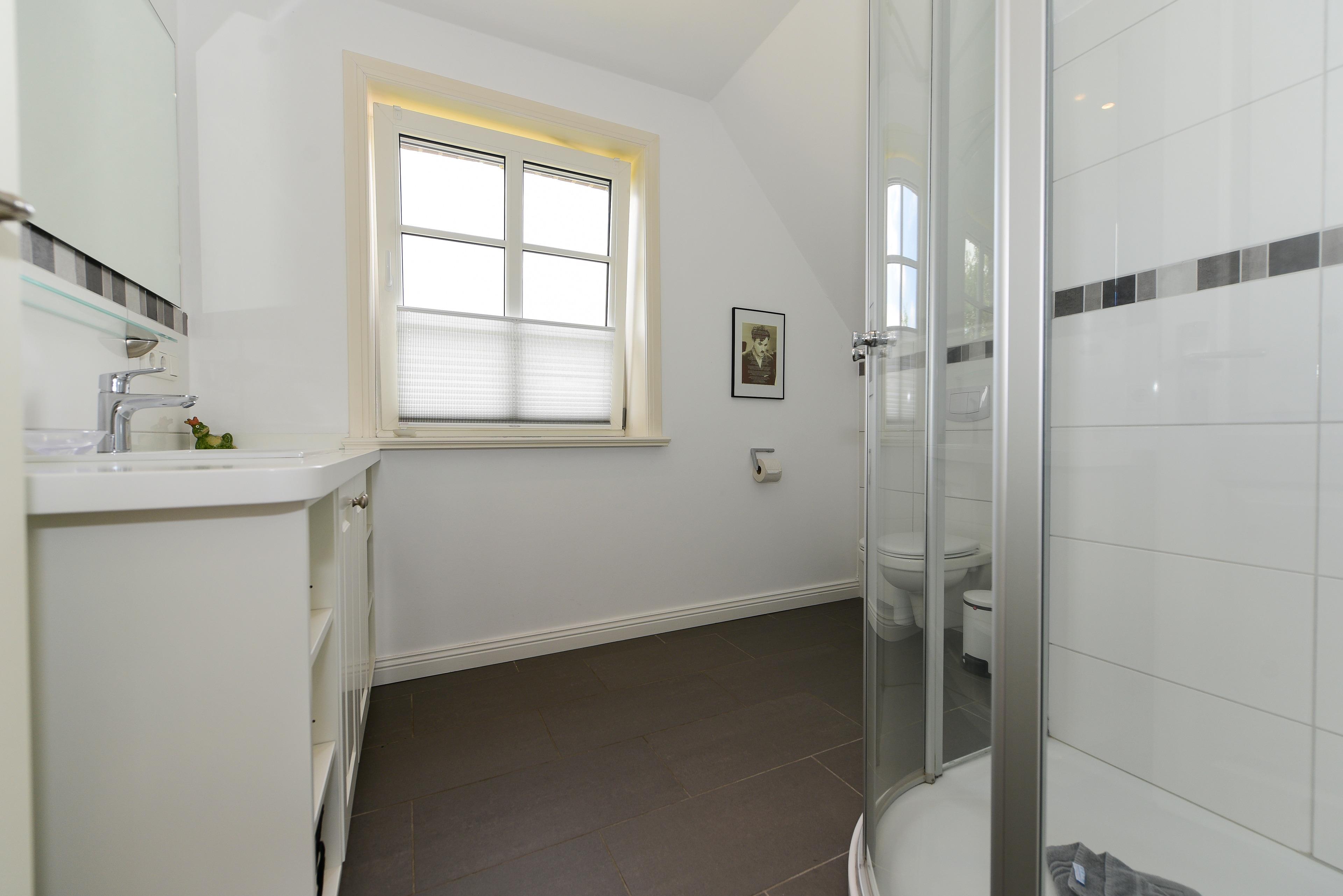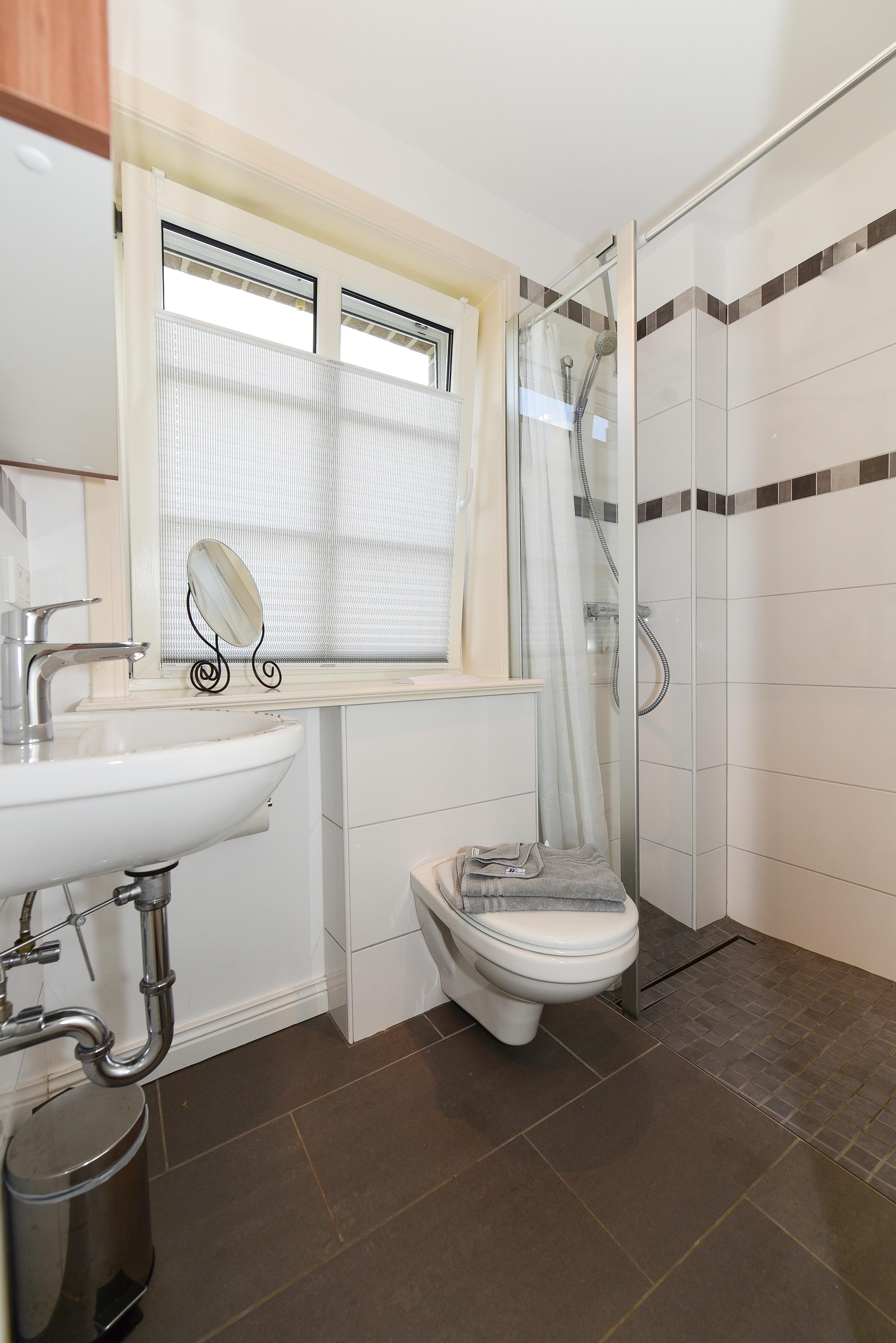 Das größere Bad bietet Ihnen ausreichend Platz für entspannte Momente und sorgt dafür, dass Sie sich auch hier wie zu Hause fühlen.