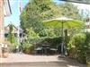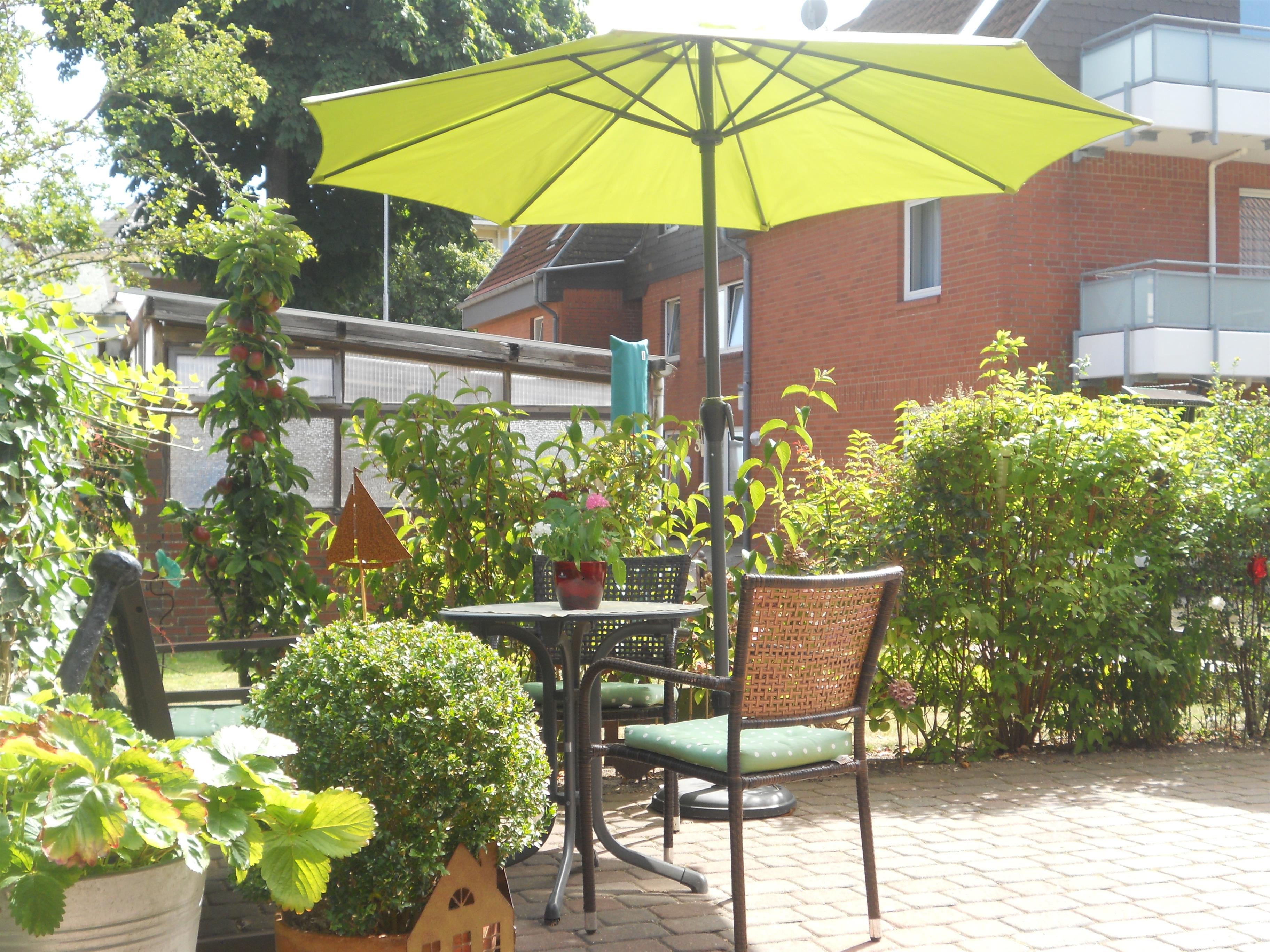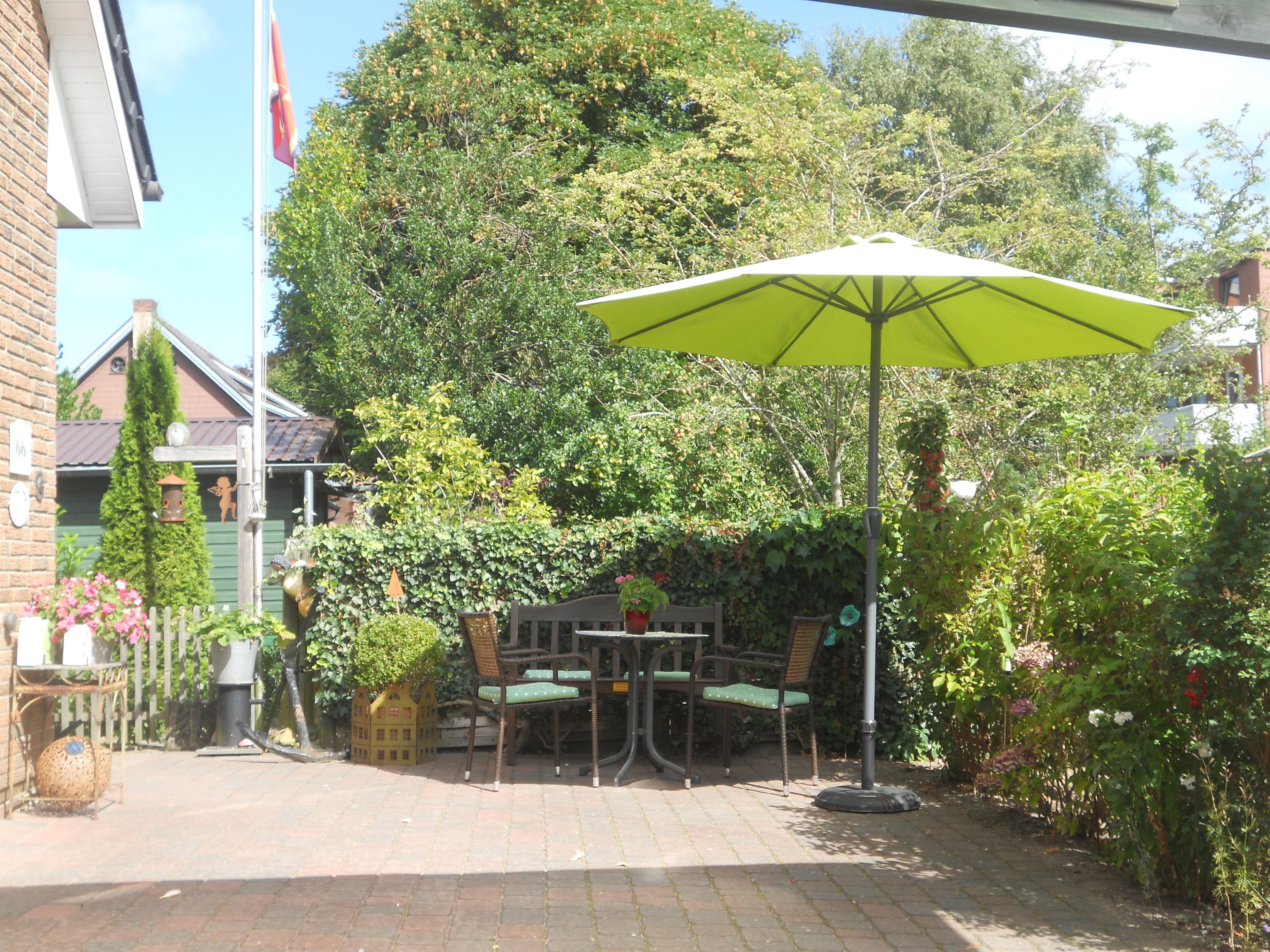 Im Garten befindet sich zur gemeinsamen Nutzung eine Sitzgelegenheit für die Wohnungen Störtebecker und Rungholt.
