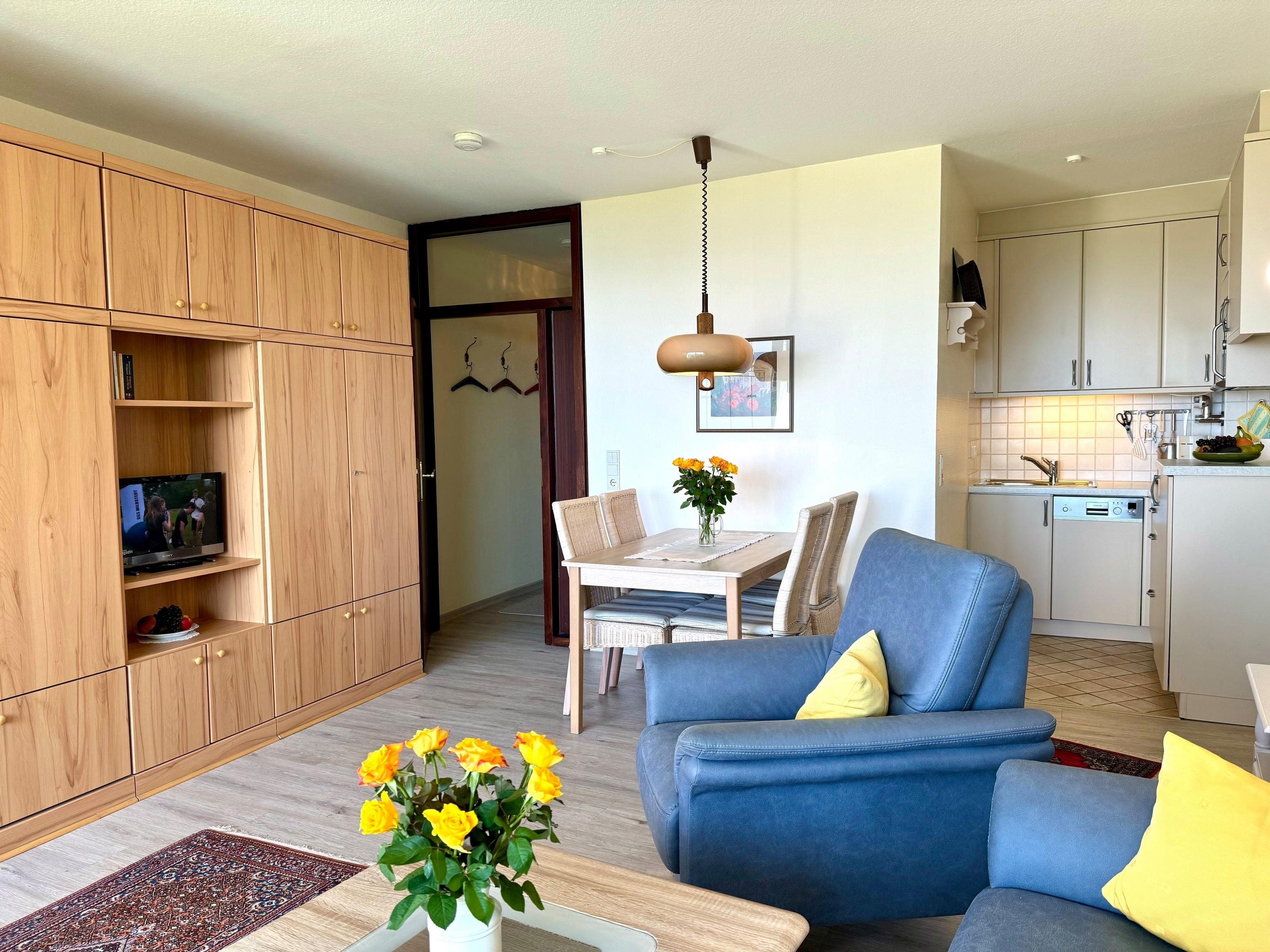 Das Duschbad und die kleine moderne Küchenzeile mit Essplatz sind zweckmäßig und komfortabel ausgestattet. Ein separates Schlafzimmer mit Doppelbett gehört ebenfalls zur Wohnung.