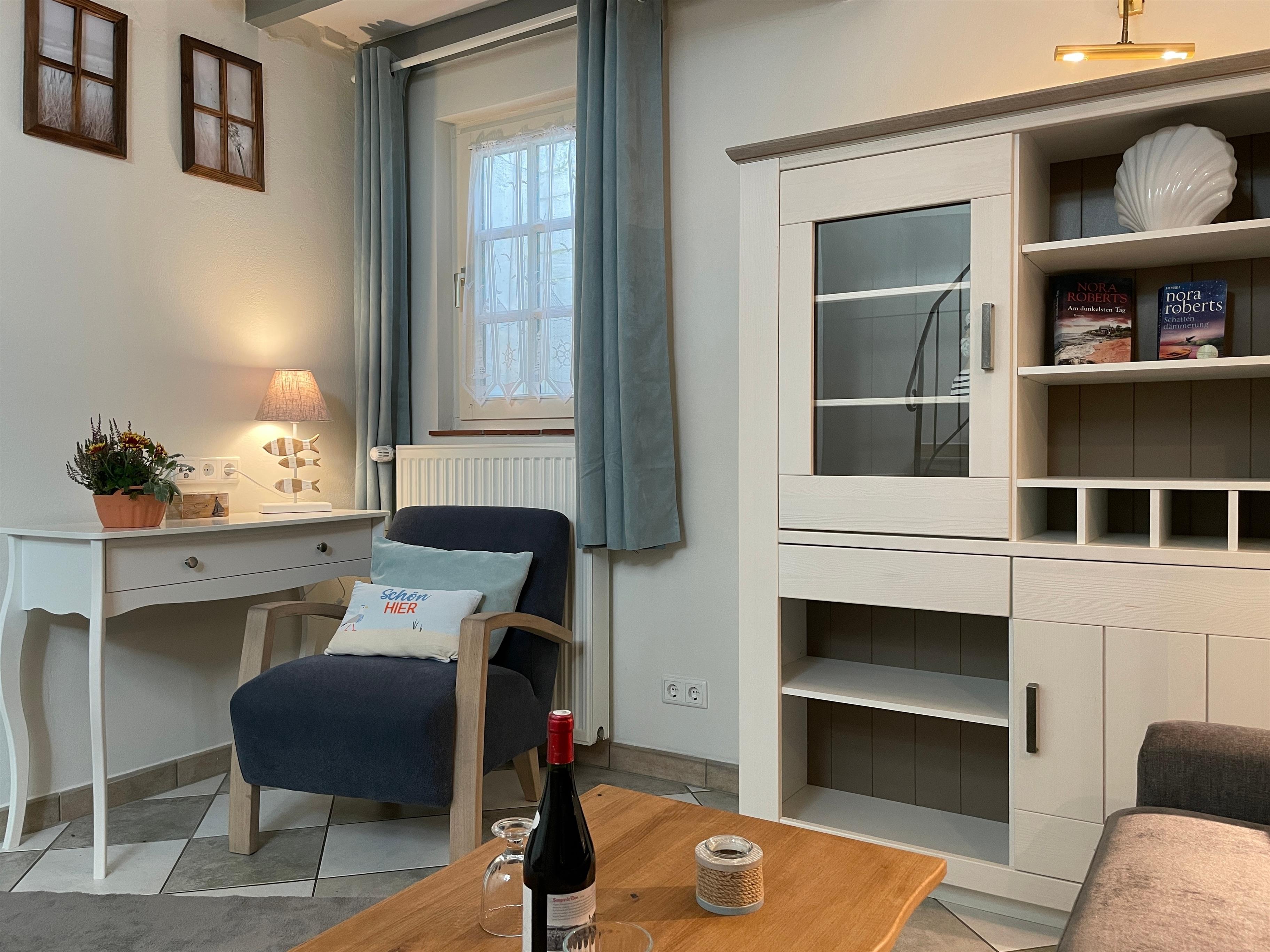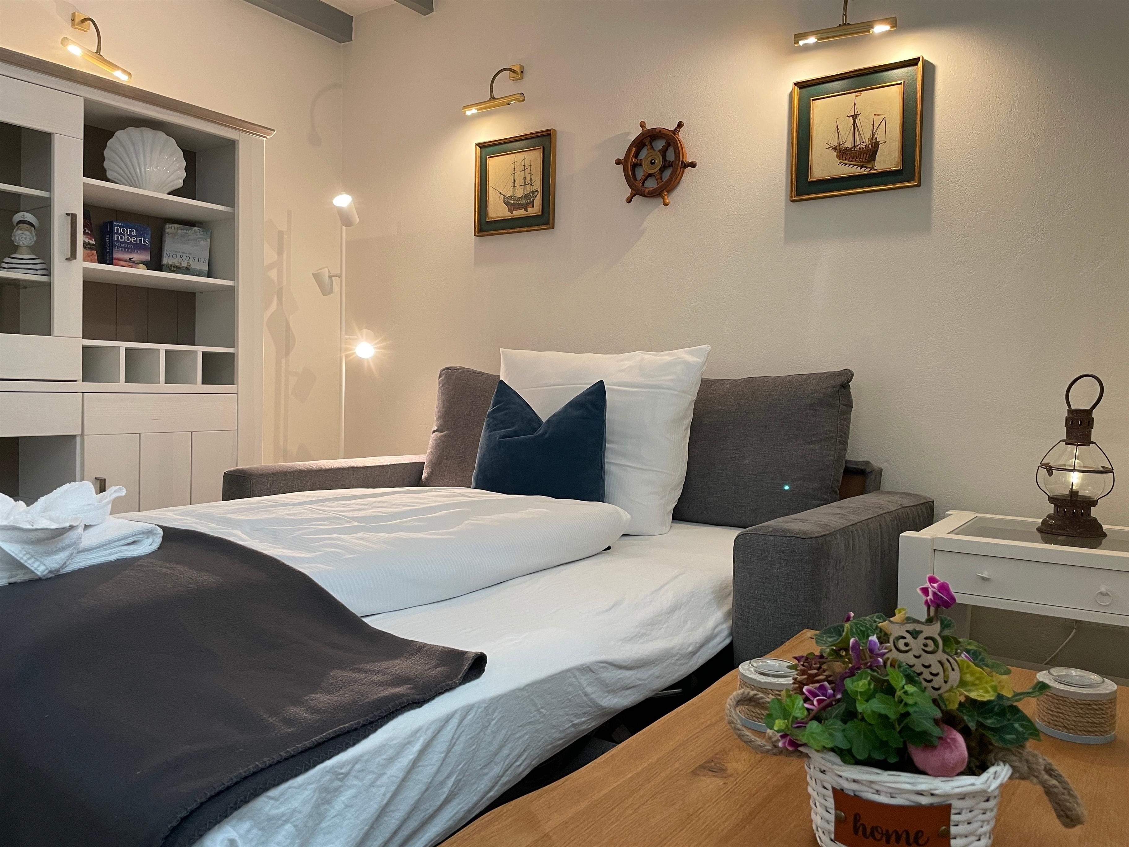 Das charmante Tiny-Reetdach-Häuschen "Seepferdchen" befindet sich neben dem Haupthaus Lüttenblick und bietet einen gemütlichen Urlaubsrückzug für 1 bis 3 Personen direkt am Südstrand. Dieses kompakte Feriendomizil erstreckt sich über zwei Etagen (Erdgeschoß und Souterrain) und verfügt über drei Zimmer. Ebenerdig betreten Sie die Wohnküche durch eine 1,60 hohe Friesentür. Hier erwartet Sie ein heller, einladender Raum (normale Deckenhöhe) mit einem internetfähigen Fernseher und einer Küche mit allem, was Sie brauchen: 4-Plattenherd, Mikrowelle, Filterkaffeemaschine, Wasserkocher, Toaster und Kühlschrank mit Gefrierfach. Der Sitzbereich mit gemütlichem Sofa, Esstisch und Stühlen bietet einen traumhaften Ausblick auf das Meer und hier ist auch der direkte Zugang (ca. 1,80m hoch) zu Ihrer privaten Terrasse. Diese ist windgeschützt durch Glaselemente, so dass entspannte Momente garantiert sind -Relaxen im Strandkorb, Essen am Gartentisch mit Stühlen oder Sonnen auf Liegen, alles so wie Sie es wünschen! Eine Wendeltreppe führt Sie in den Wohnbereich mit einer gemütlichen Schlafcouch, Leseecke und einer kleinen Abseite mit Safe, die Platz für Ihre Koffer bietet. Maritime Accessoires bringen eine heimelige Gemütlichkeit in den Raum. Weiterhin befindet sich hier das Hauptschlafzimmer mit einem komfortablen Doppelbett und einem Kleiderschrank. Das Badezimmer ist mit einer ebenerdigen Dusche und einem WC ausgestattet und verfügt über einen separaten, abschließbaren Ausgang, der über eine Treppe in den Garten führt. Das Glaselement der Tür lässt sich kippen, sodass das Bad gut gelüftet werden kann. Das "Seepferdchen" vereint maritimes Flair mit modernem Komfort und ist der ideale Ausgangspunkt für Ihren Nordsee-Urlaub. Genießen Sie die Nähe zum Strand, die frische Seeluft und die gemütliche Atmosphäre dieses einzigartigen Reetdach-Häuschens.