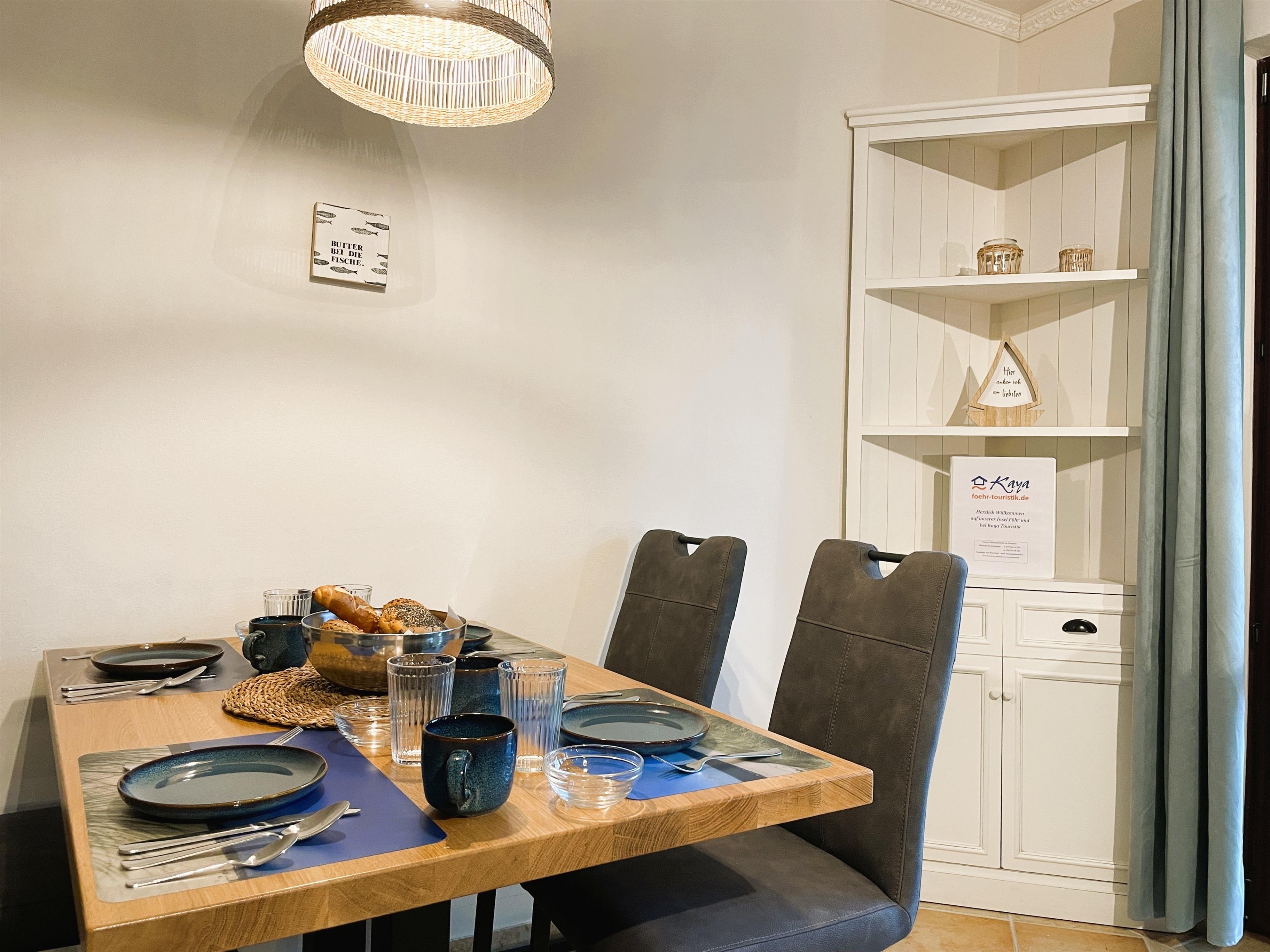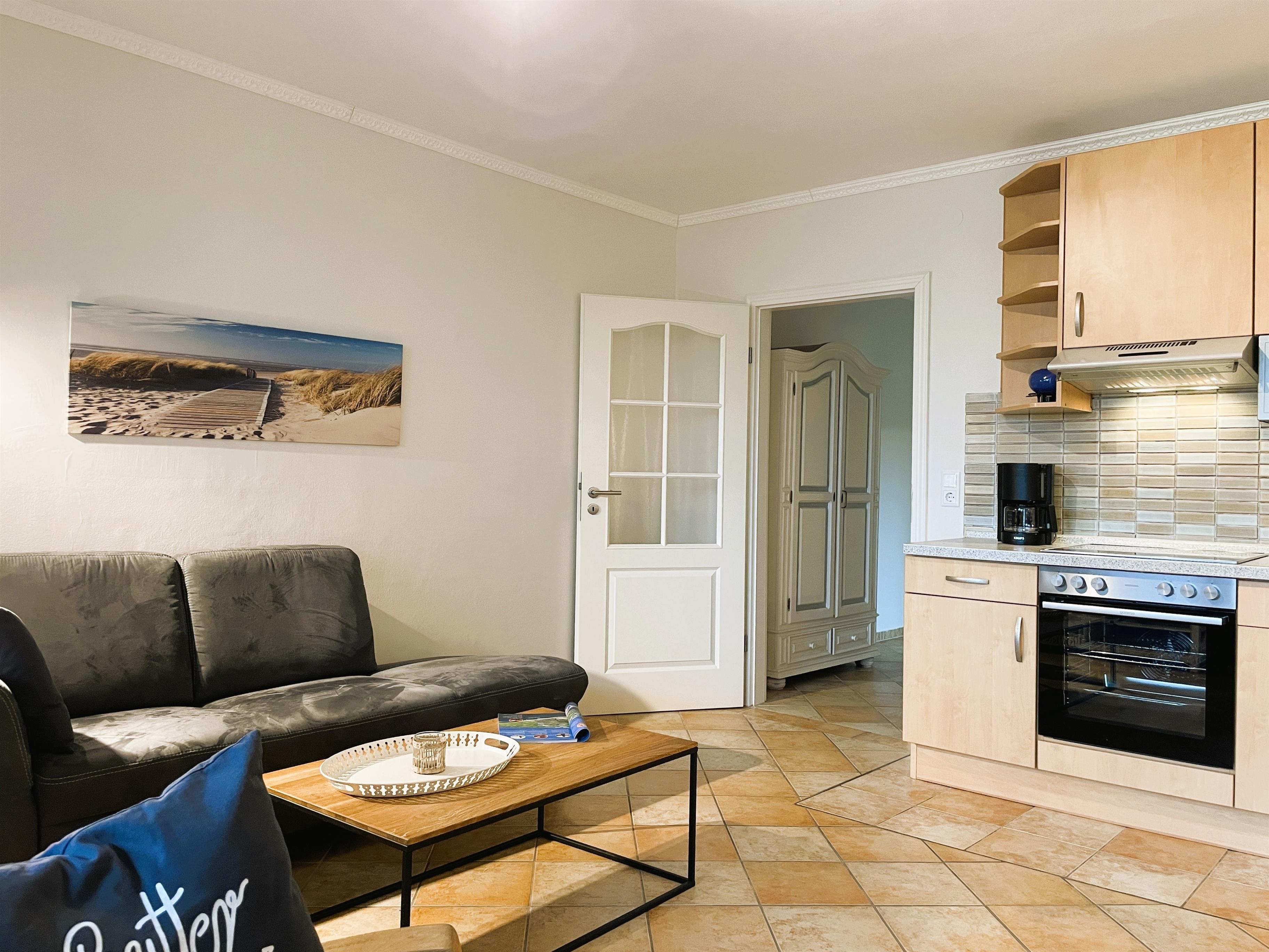 Entdecken Sie unsere großzügige Ferienwohnung, die ideal für einen komfortablen Familienurlaub bis zu 5 Personen ist. Die einzelnen Zimmer der hellen Ferienwohnungen sind alle vom Flur aus begehbar: Ein einladendes Wohnzimmer mit einer voll ausgestatteten Küchenzeile und einer bequemen Essgruppe bietet reichlich Platz und eignet sich ideal für gemütliche Film- oder Spielabende. Von hier aus gelangen Sie auf die nach Süden gelegene windgeschützte Loggia.