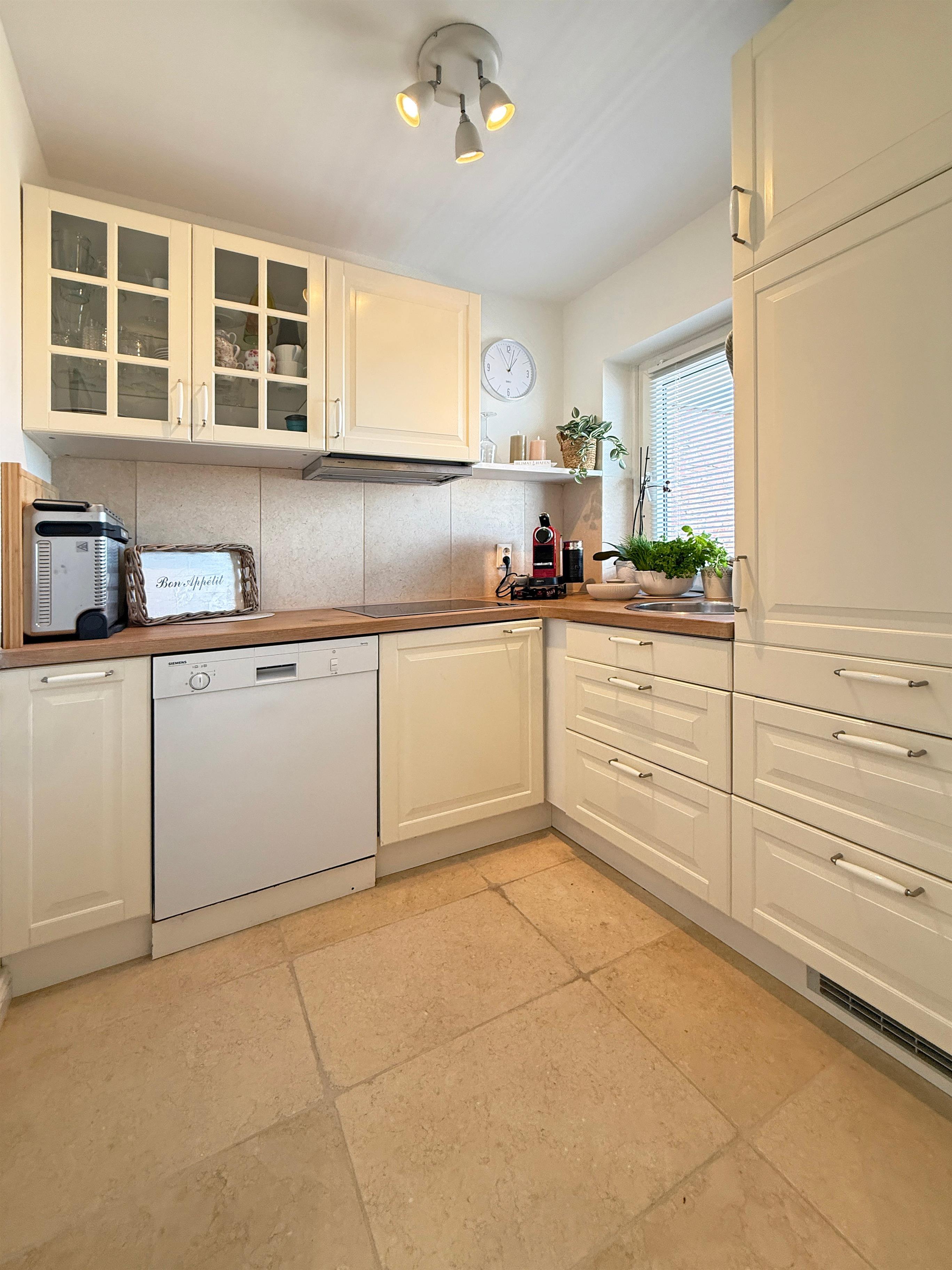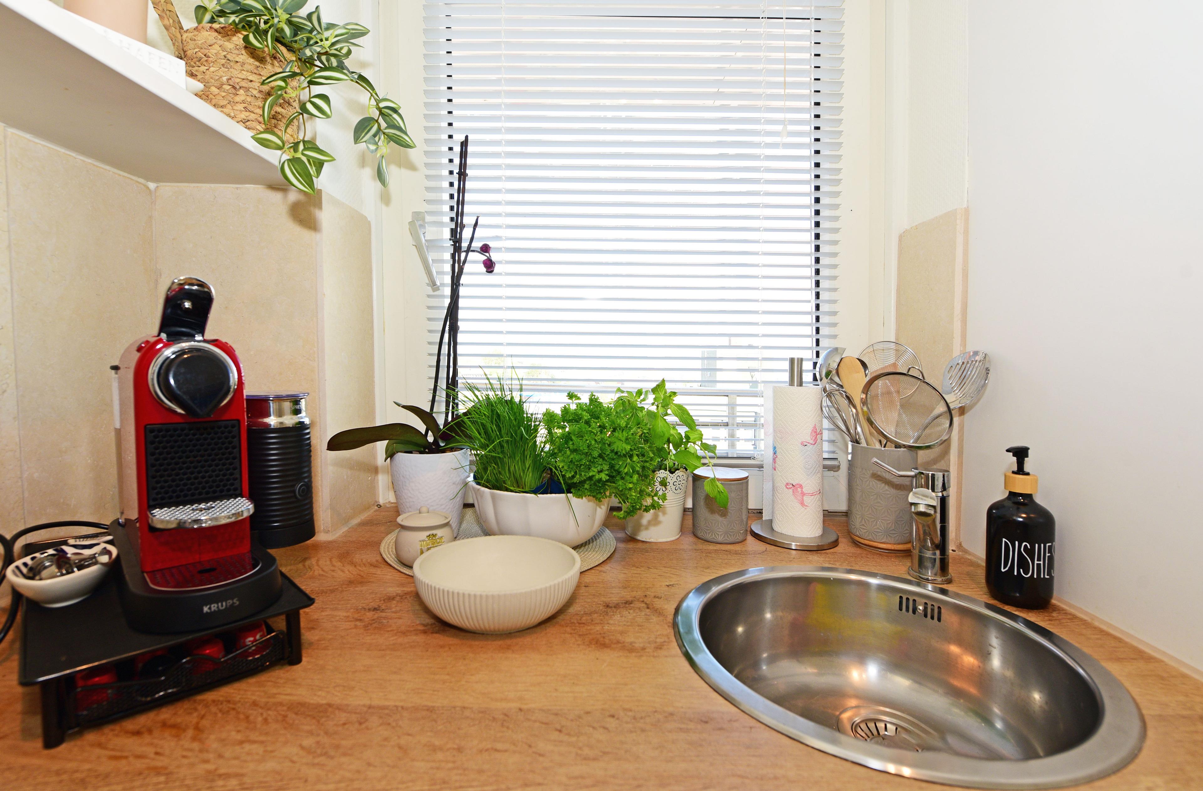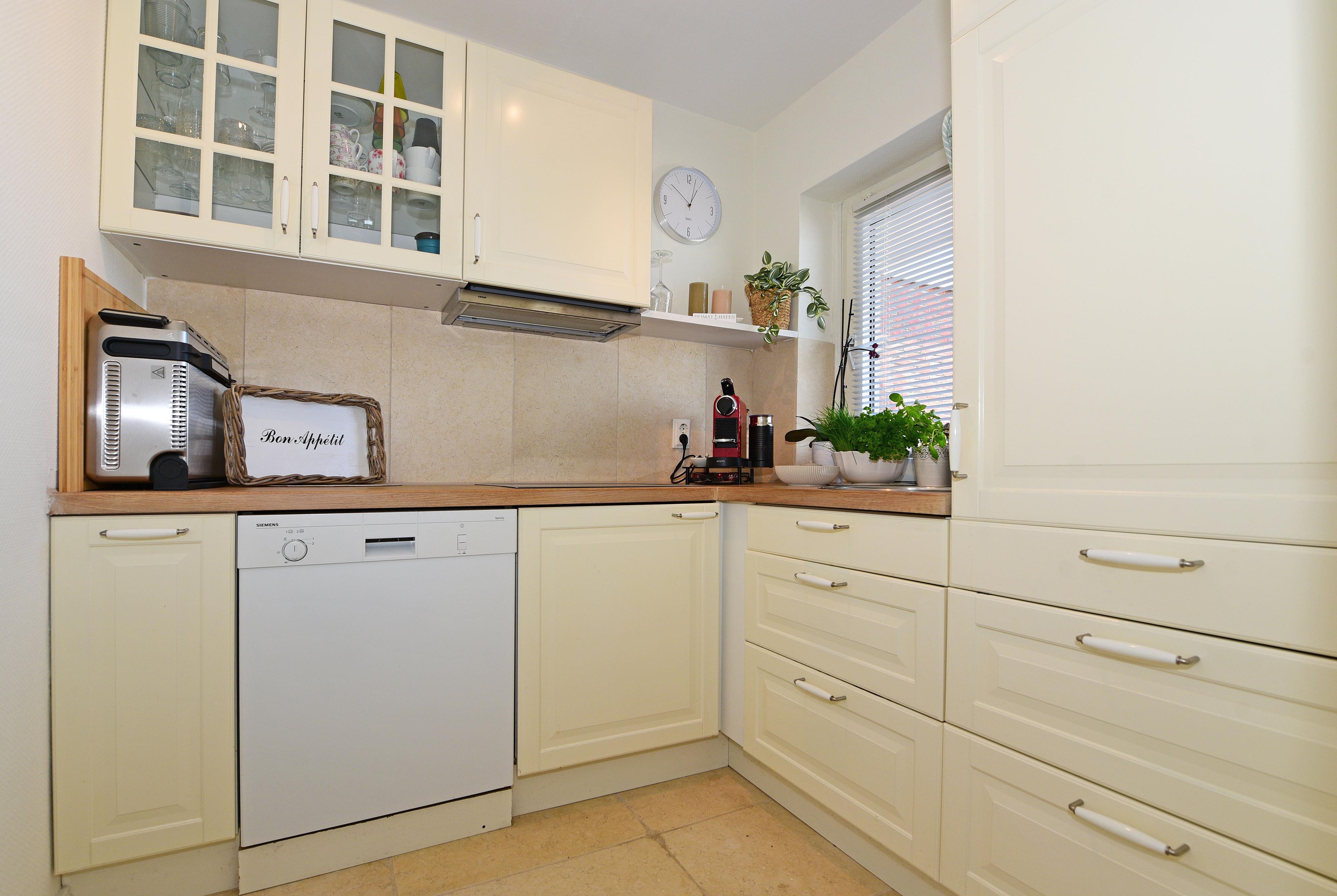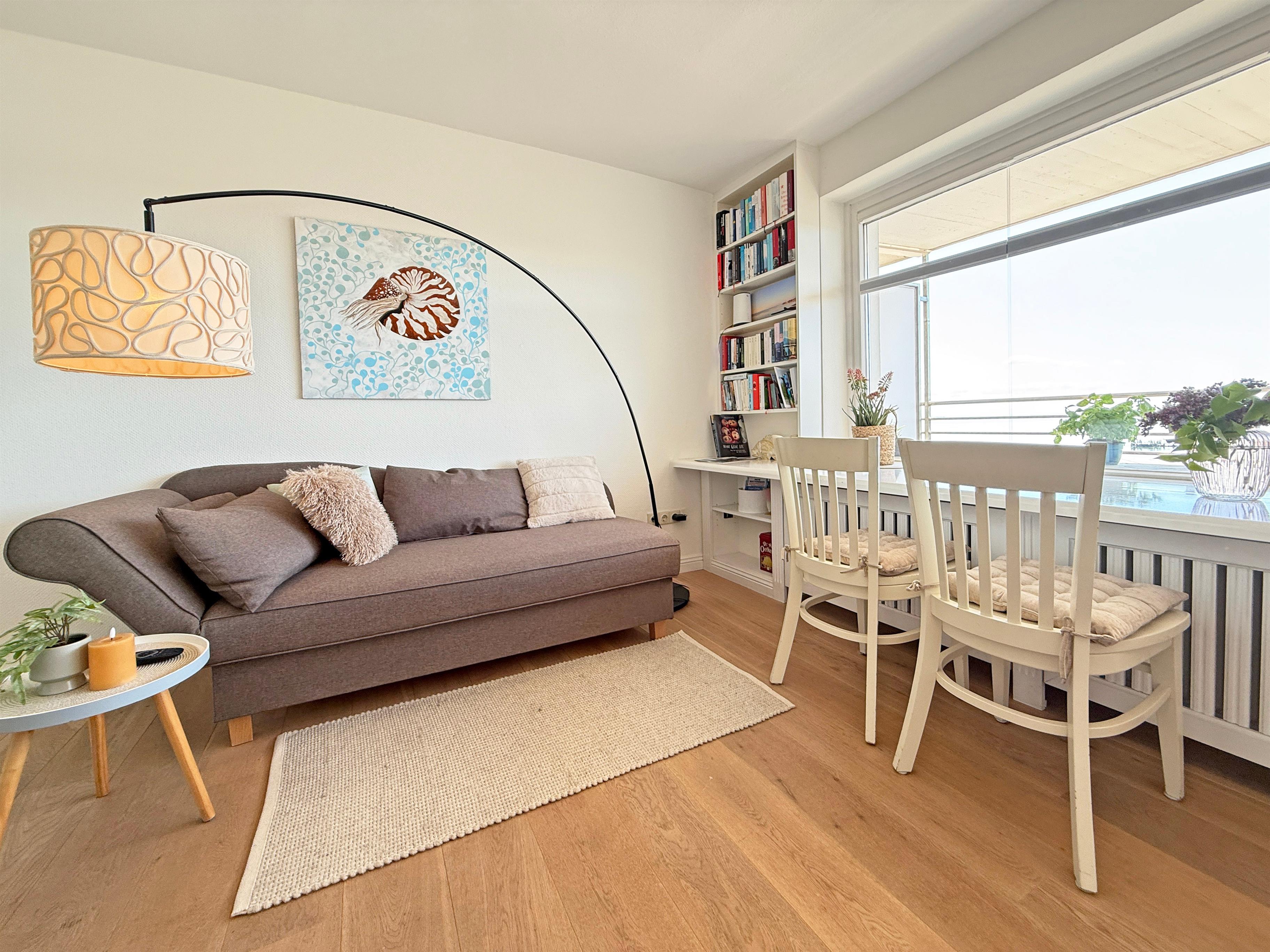 Die Wohnung bietet Platz für zwei Personen und ist mit einem komfortablen Doppelbett (160x200 cm) ausgestattet. Ein bequemes Sofa lädt zum Verweilen ein – ideal für gemütliche Abende mit einem Flachbildschirm für Ihre Unterhaltung. Außerdem gibt es eine Bücherecke und WLAN ist natürlich auch vorhanden. Die Küche bietet einen Blick auf das bunte Treiben im Hafen.
