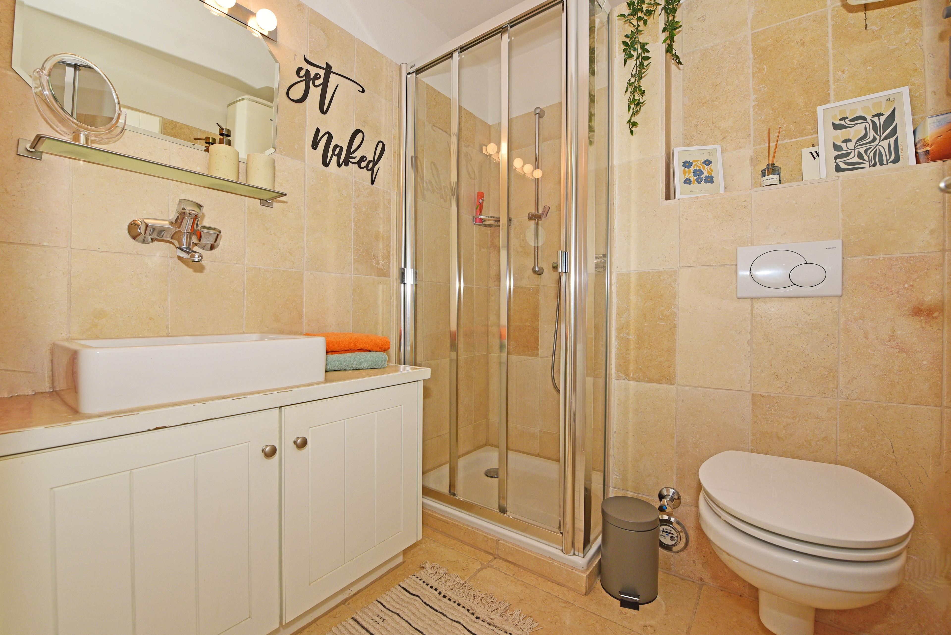 Das moderne Badezimmer verfügt über Dusche, Waschbecken und Toilette und bietet allen nötigen Komfort für einen rundum angenehmen Aufenthalt.