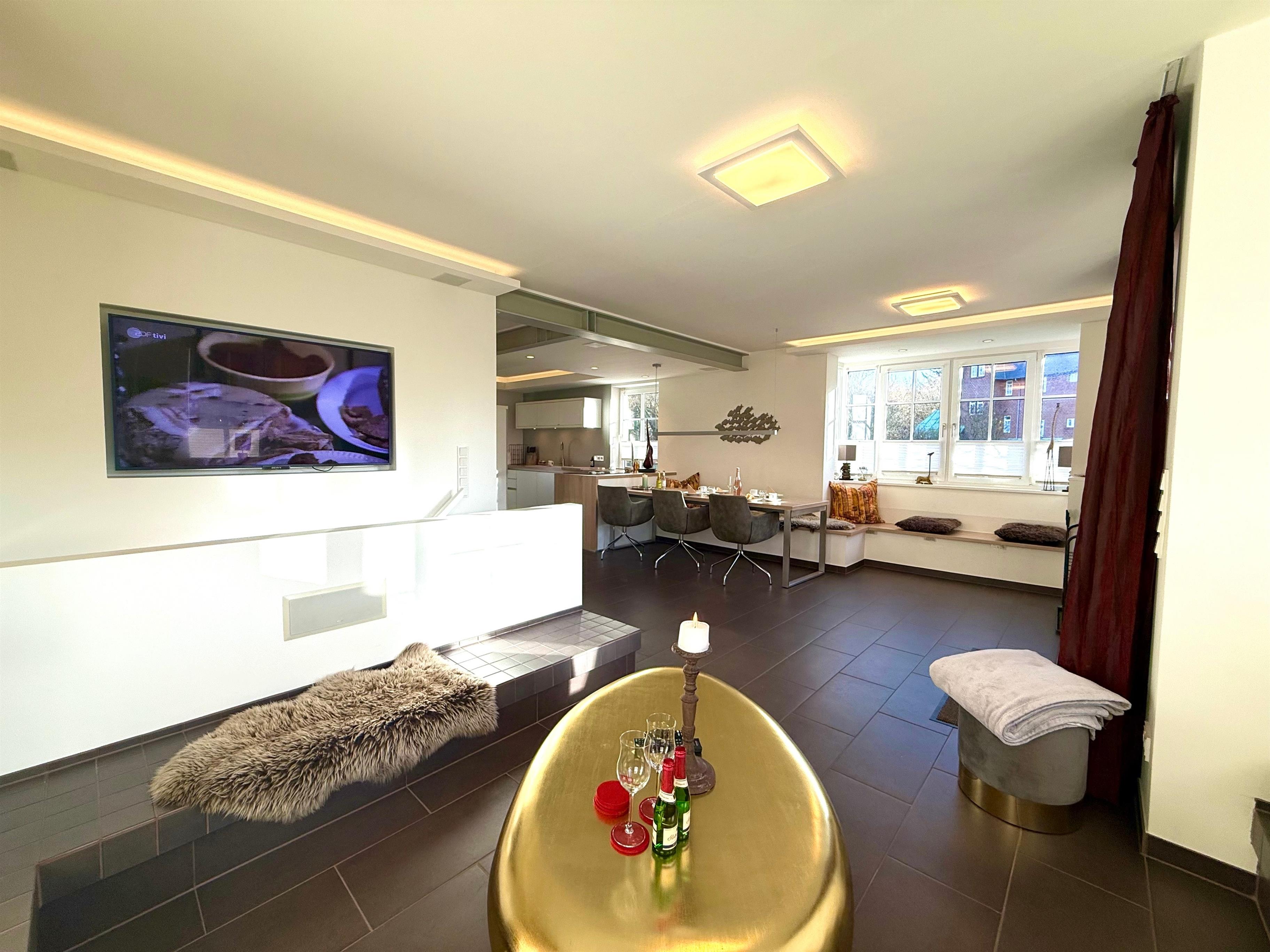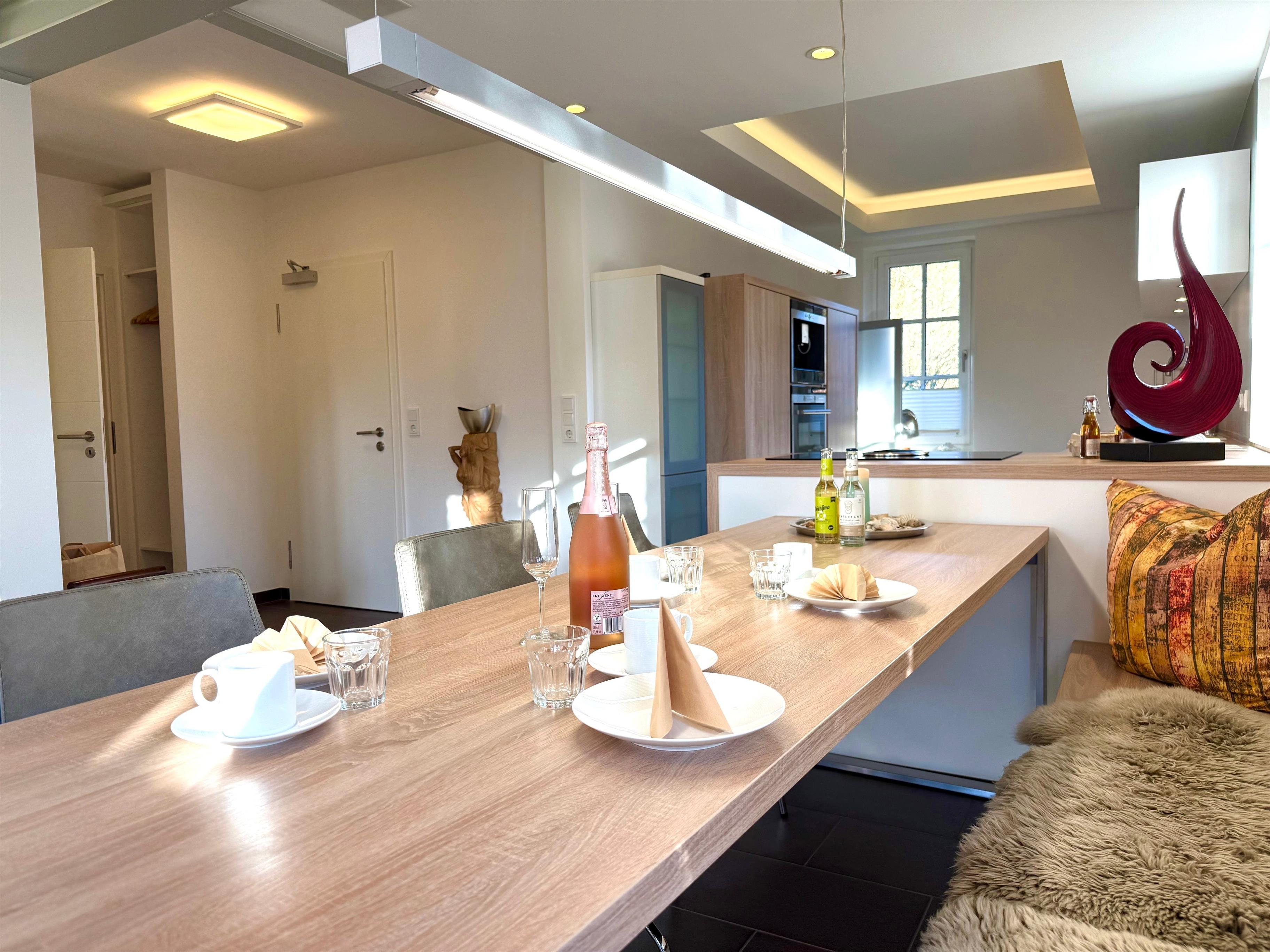 Dazu gehören unter anderem eine moderne Küche mit Spülmaschine, Kaffemaschine und alle wichten Küchenutensilien.