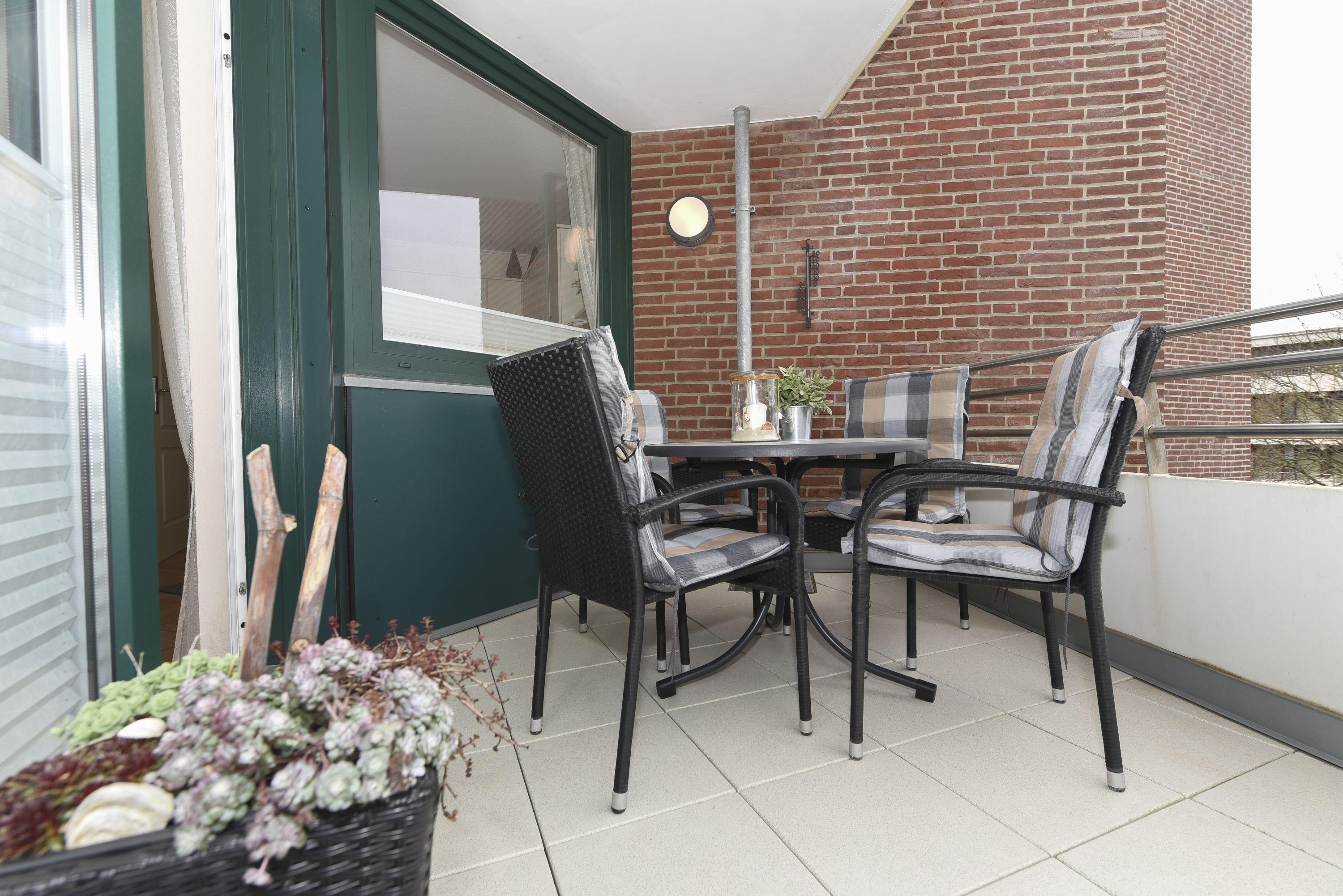 Der Südbalkon mit Gartenmöbeln lädt dazu ein, die Sonne zu genießen und die frische Nordseeluft in vollen Zügen zu genießen.