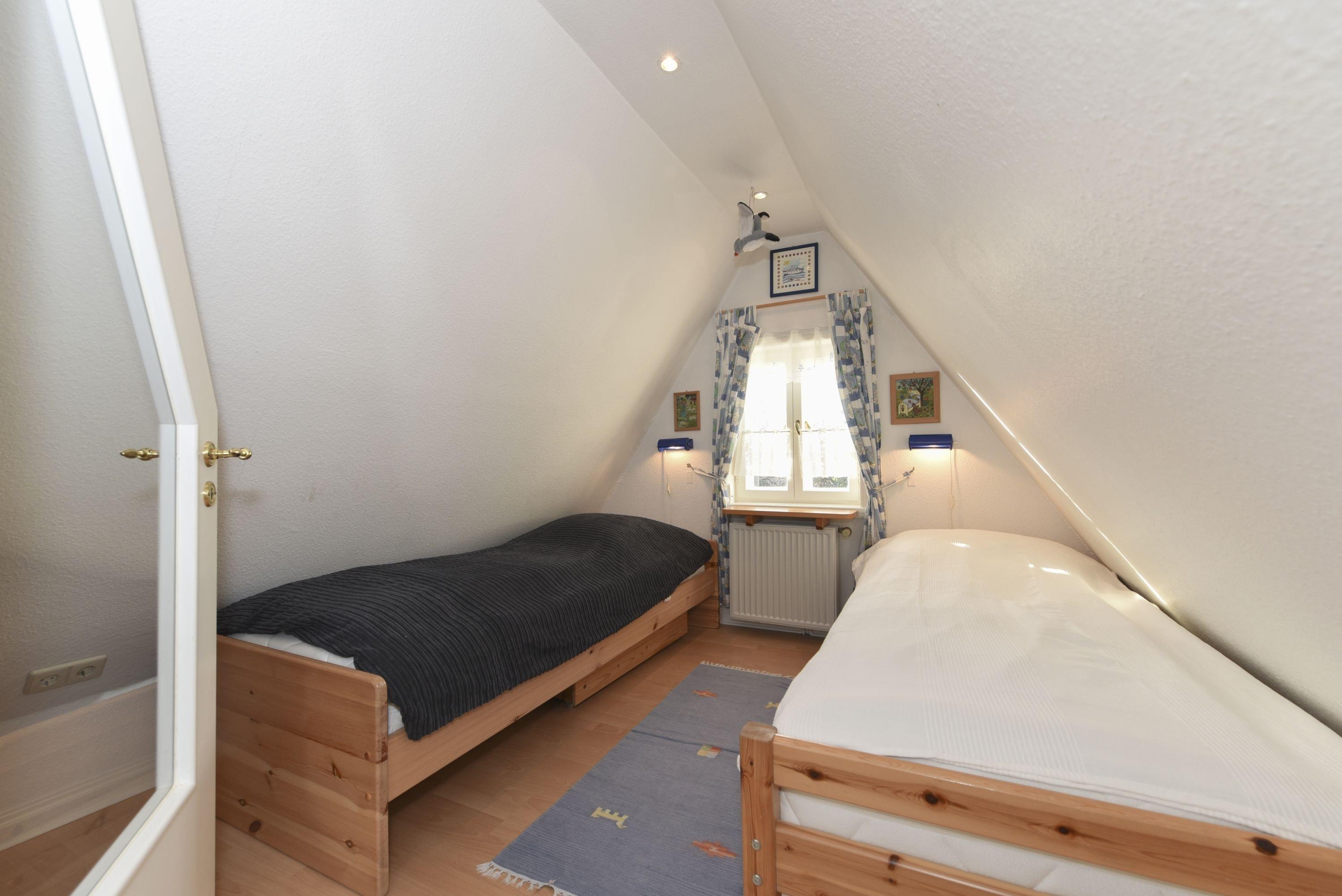 Im Dachgeschoss befindet sich das Kinderzimmer, welches mit zwei Einzelbetten zum gemütlichen Rückzugsort für die Kleinen wird.