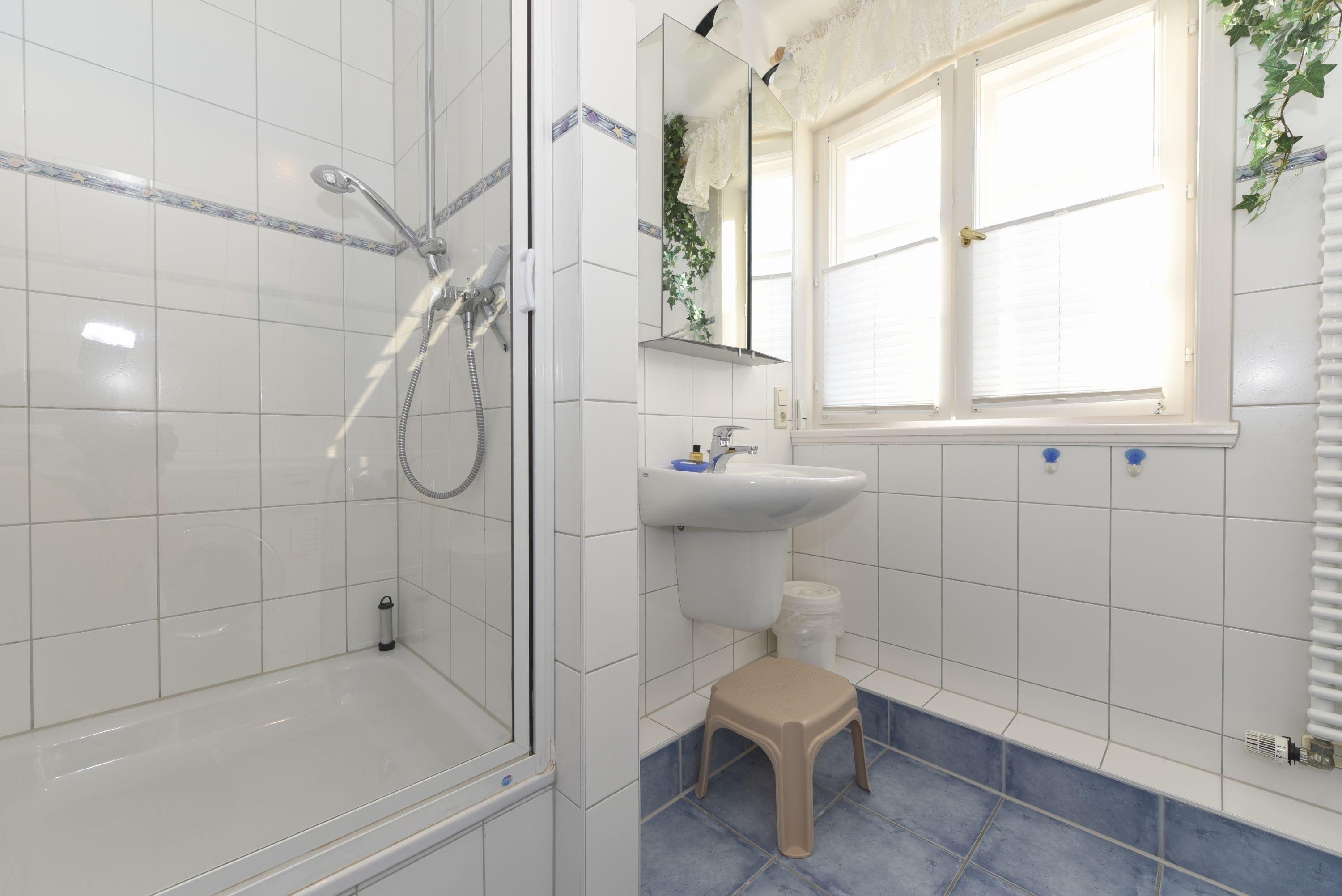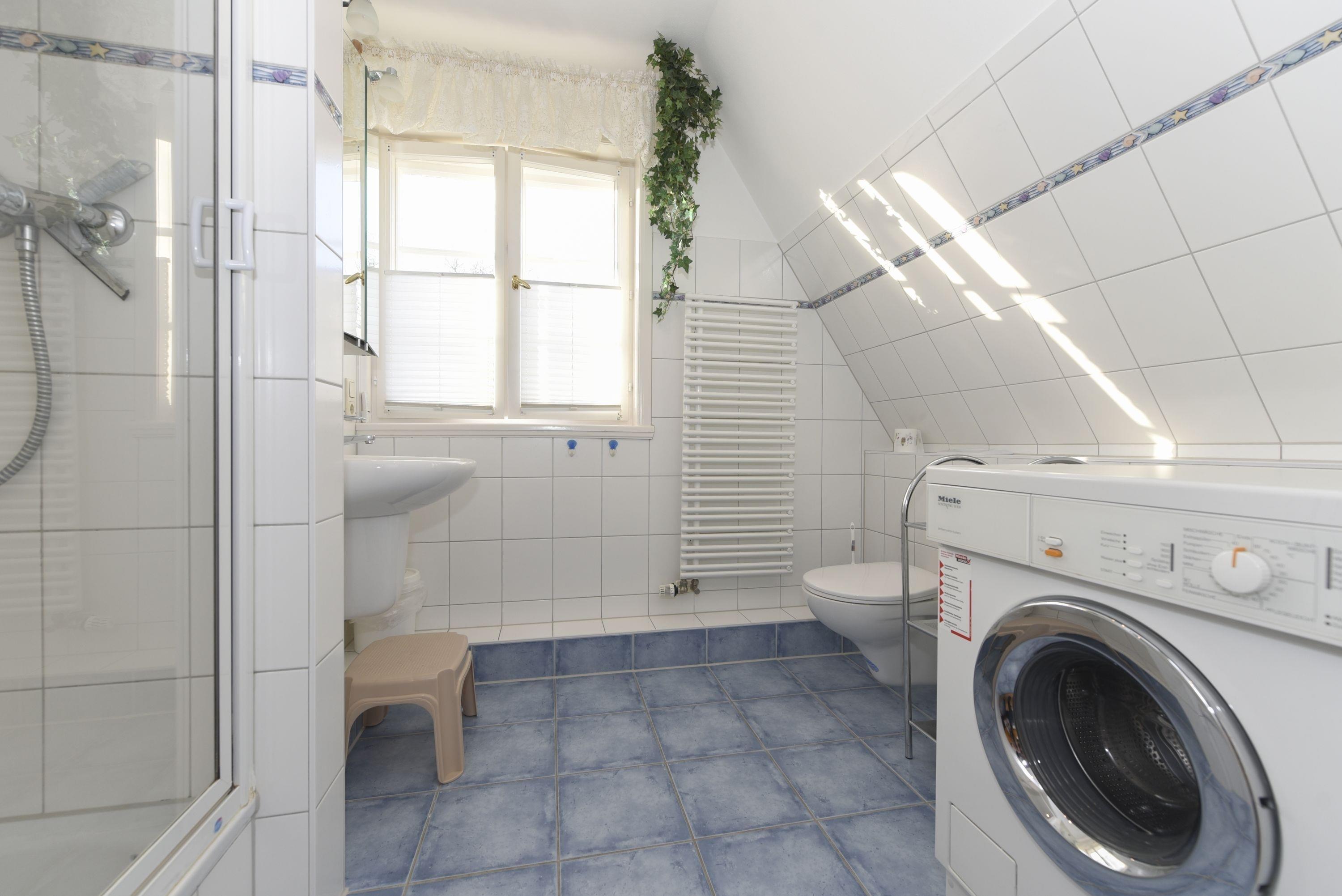 Das helle und freundlich geflieste Duschbad mit großem Fenster bringt viel Licht und frische Luft in den Raum.