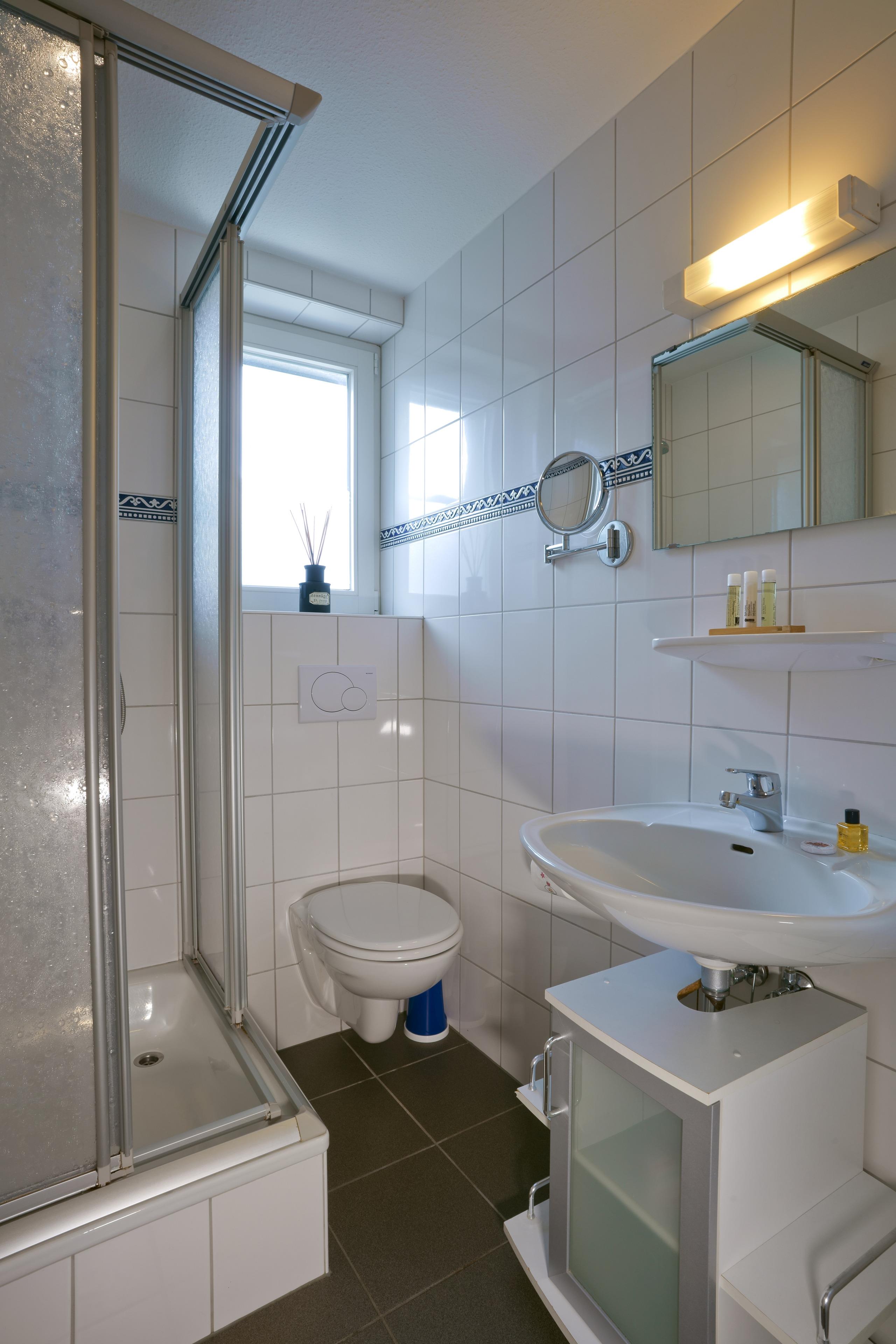 Das weiß geflieste Badezimmer mit Fenster, Dusche und WC sorgt für einen angenehmen Start in den Tag.