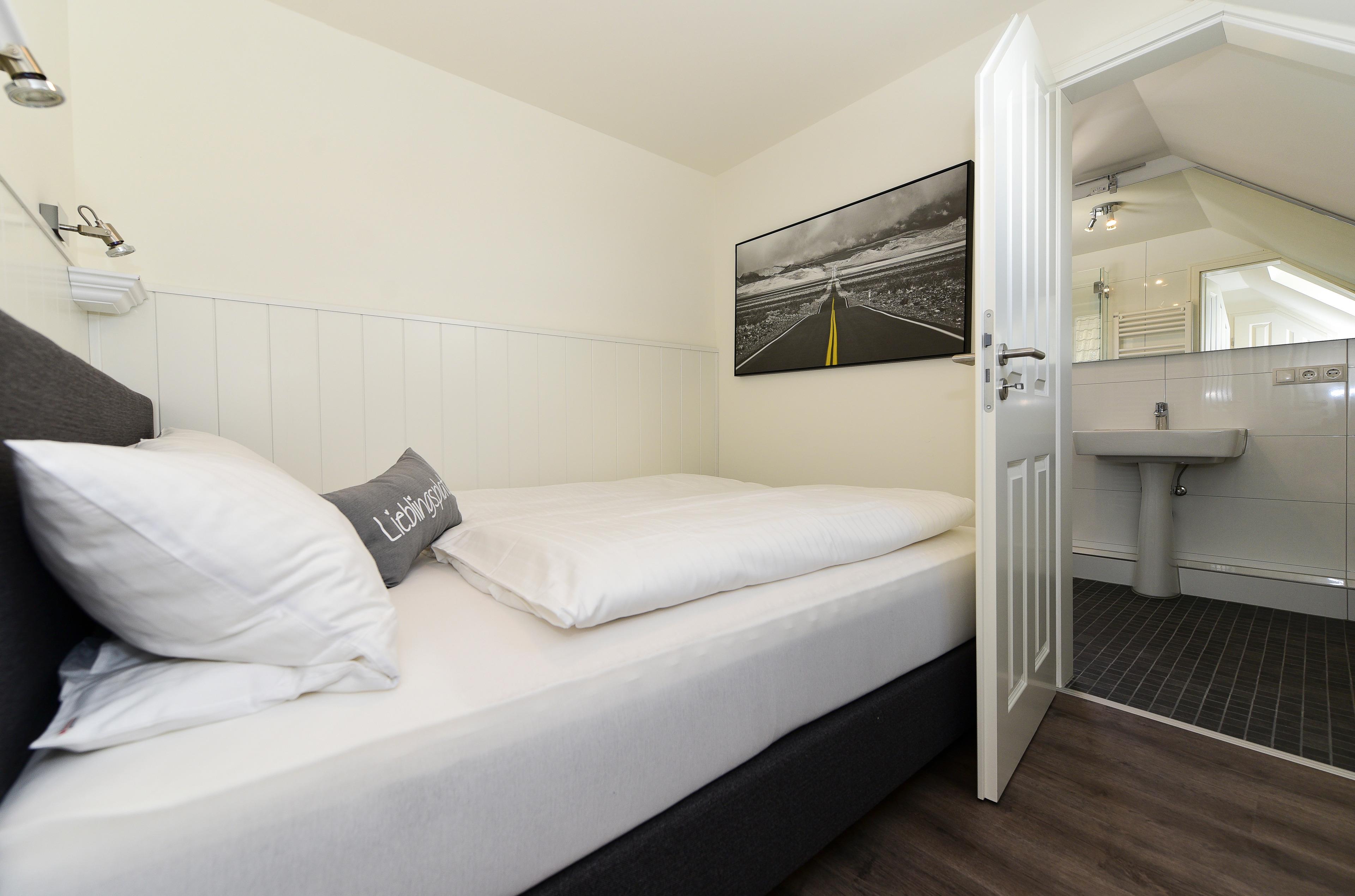 Das kleine, kuschelige Schlafzimmer ist mit einem neuen Boxspringbett ausgestattet, und das Bad mit Außenfenster verfügt über eine fast ebenerdige Dusche. Die geschmackvollen Accessoires machen diese Wohnung zu einer Wohlfühloase für Ihren Föhr-Urlaub.