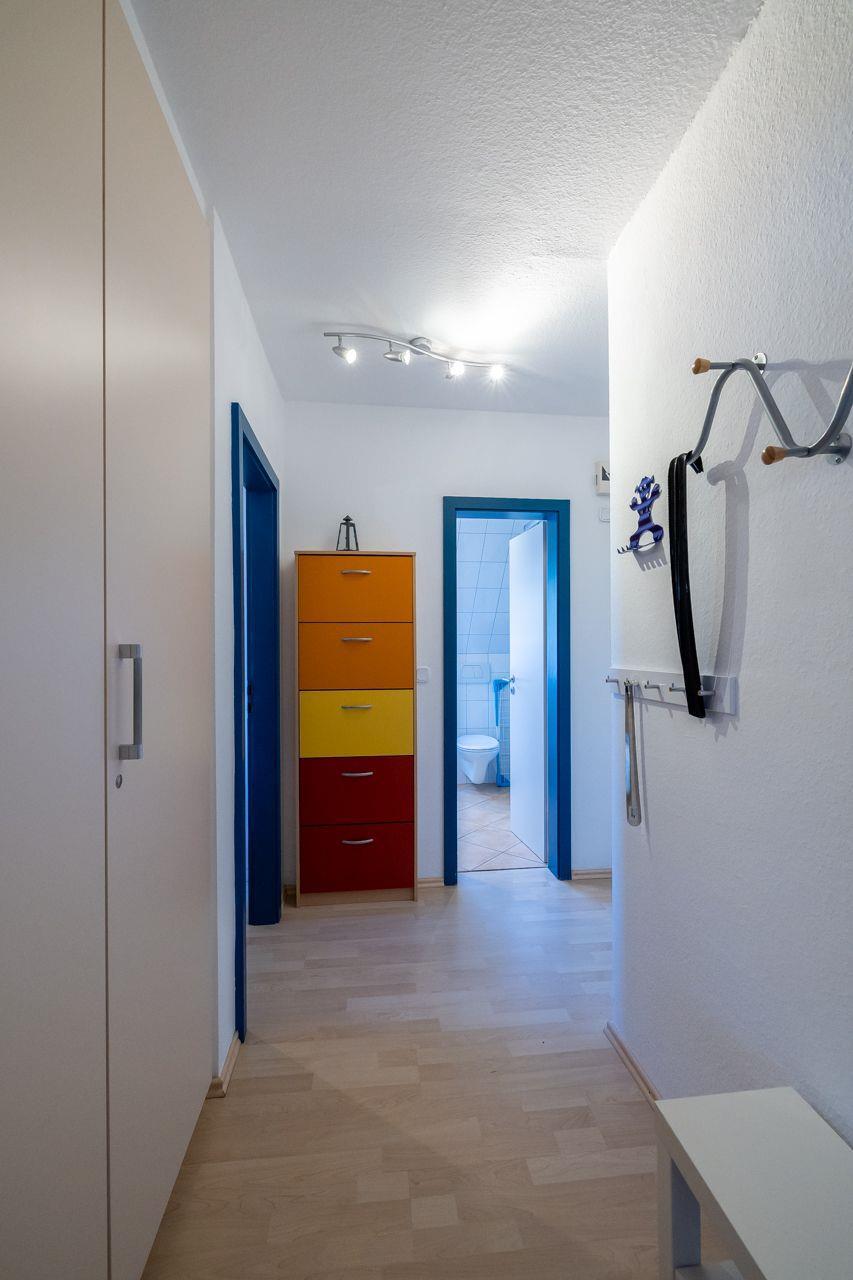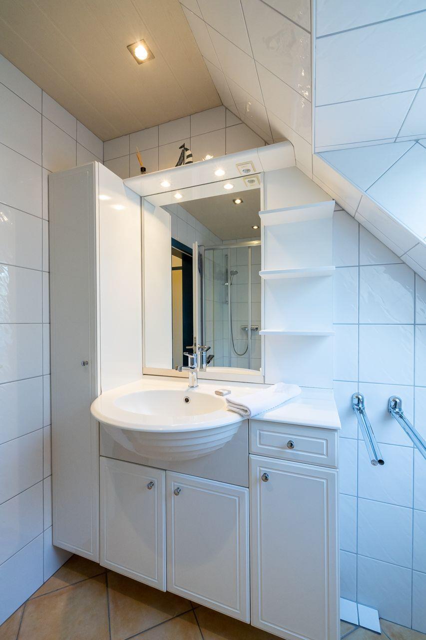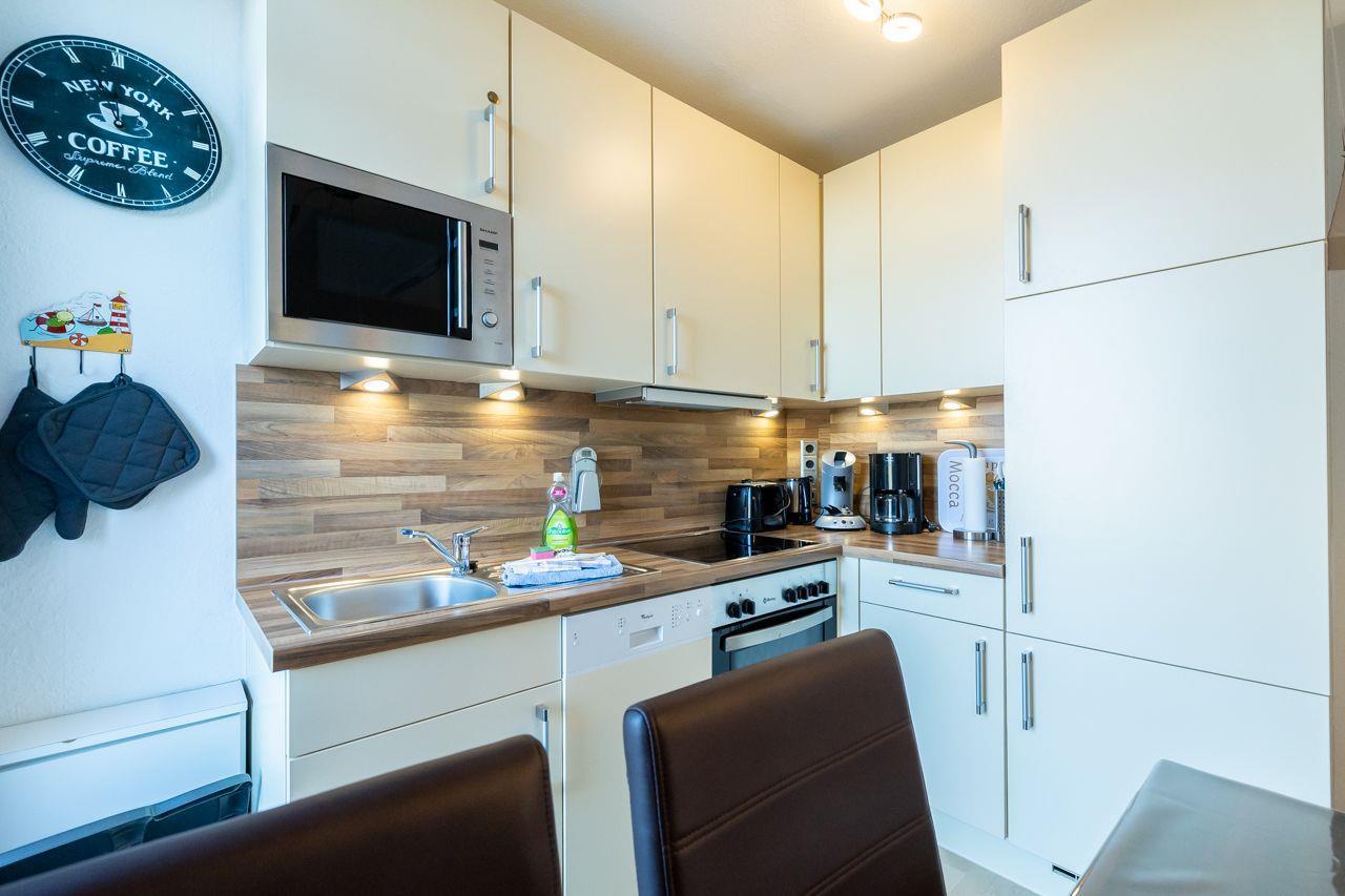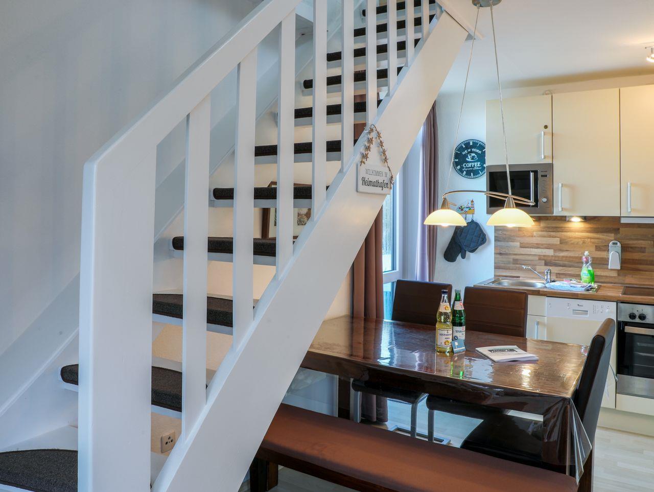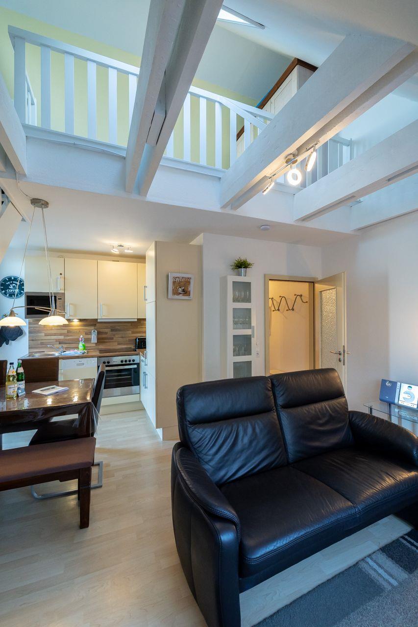 Diese gemütliche Wohnung befindet sich in der 1. Etage eines Mehrfamilienhauses und erstreckt sich über zwei Etagen am beliebten Südstrand in Wyk auf Föhr. Sie ist für ein bis fünf Personen geeignet. Es erwartet Sie ein mit viel Liebe eingerichtetes Feriendomizil. Auf ca.57 qm stehen Ihnen ein kleiner Flur mit Garderobe, ein Schlafzimmer mit einem Einzelbett und einem Tandembett (in diesem Zimmer befindet sich ein 2. Fernseher), ein Galerieschlafzimmer mit Doppelbett (180x200) in der 2. Etage, ein Duschbad, eine offene Küche mit kombiniertem Wohn-Essbereich zur Verfügung. Der Wohnbereich ist sehr liebevoll mit zwei gemütlichen Sofas, SAT-TV und Blue Ray-Player ausgestattet. In der Küche finden Sie unter anderem: Geschirrspülmaschine, Kaffeemaschine, Toaster , Wasserkocher, Cerankochfeld, Mikrowelle und einen Kühlschrank mit Gefrierfach. Ein Strandkorb inklusive Strandlaken von Mai bis September am Wyker Strand (Abschnitt 23) befindet sich kaum 5 Gehminuten von der Wohnung entfernt.
