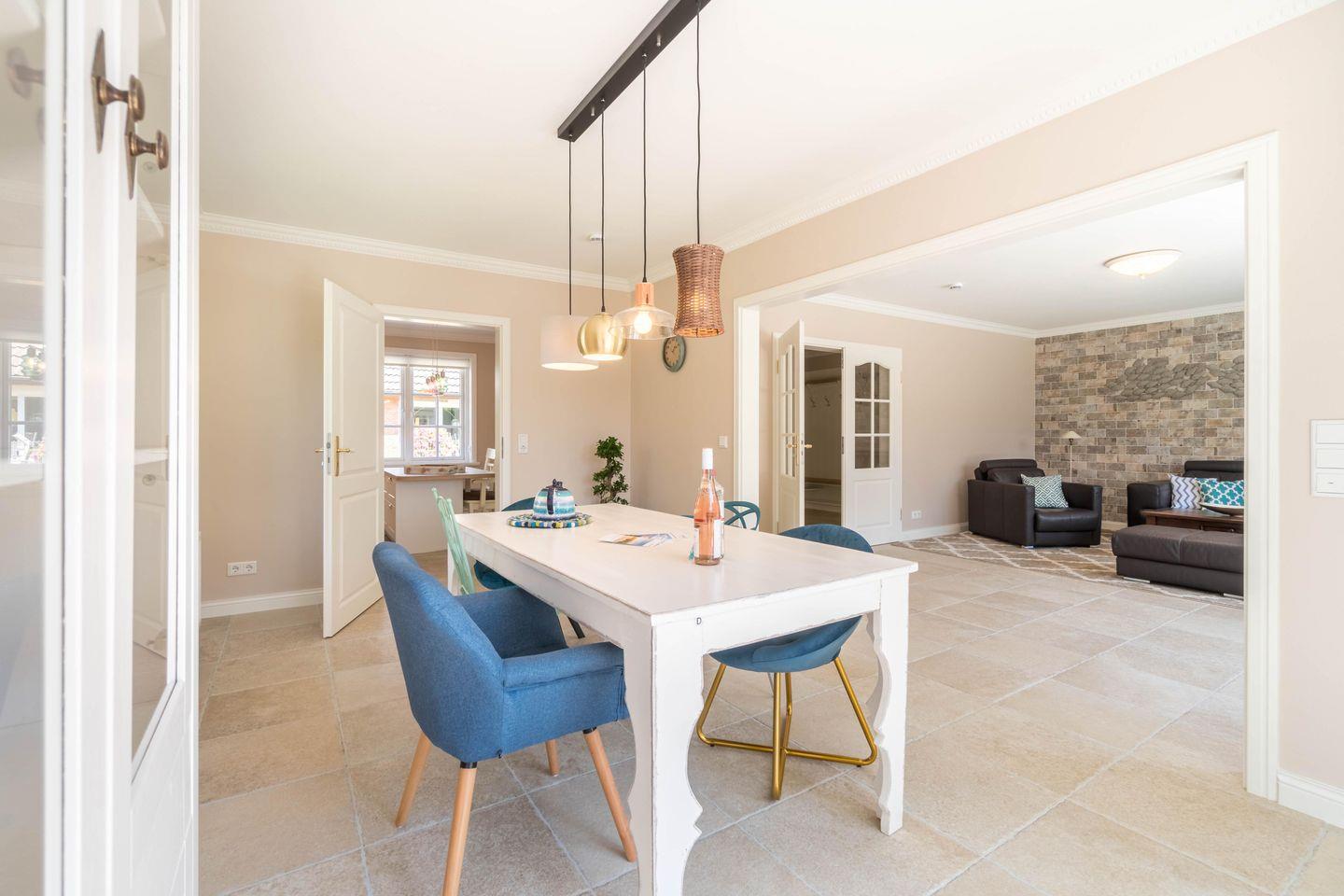 Durch den offenen Wohn- und Essbereich, welcher dank der bodentiefen Fenstern ausreichend mit Tageslicht versorgt wird, erreichen Sie die wohnungseigene Terrasse mit Zugang zu dem gemeinschaftlich genutzten Garten.