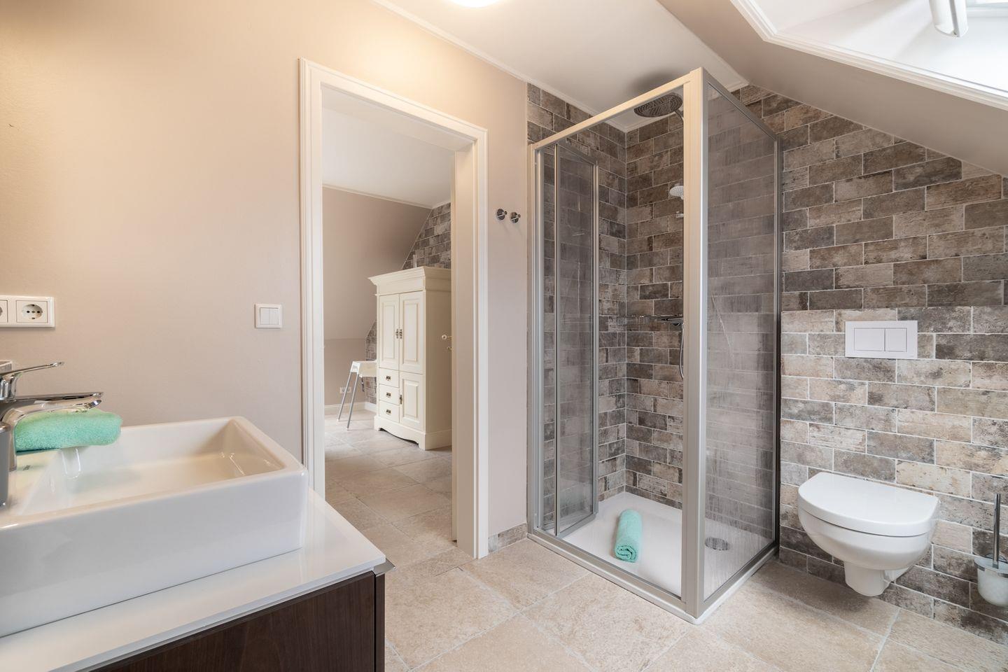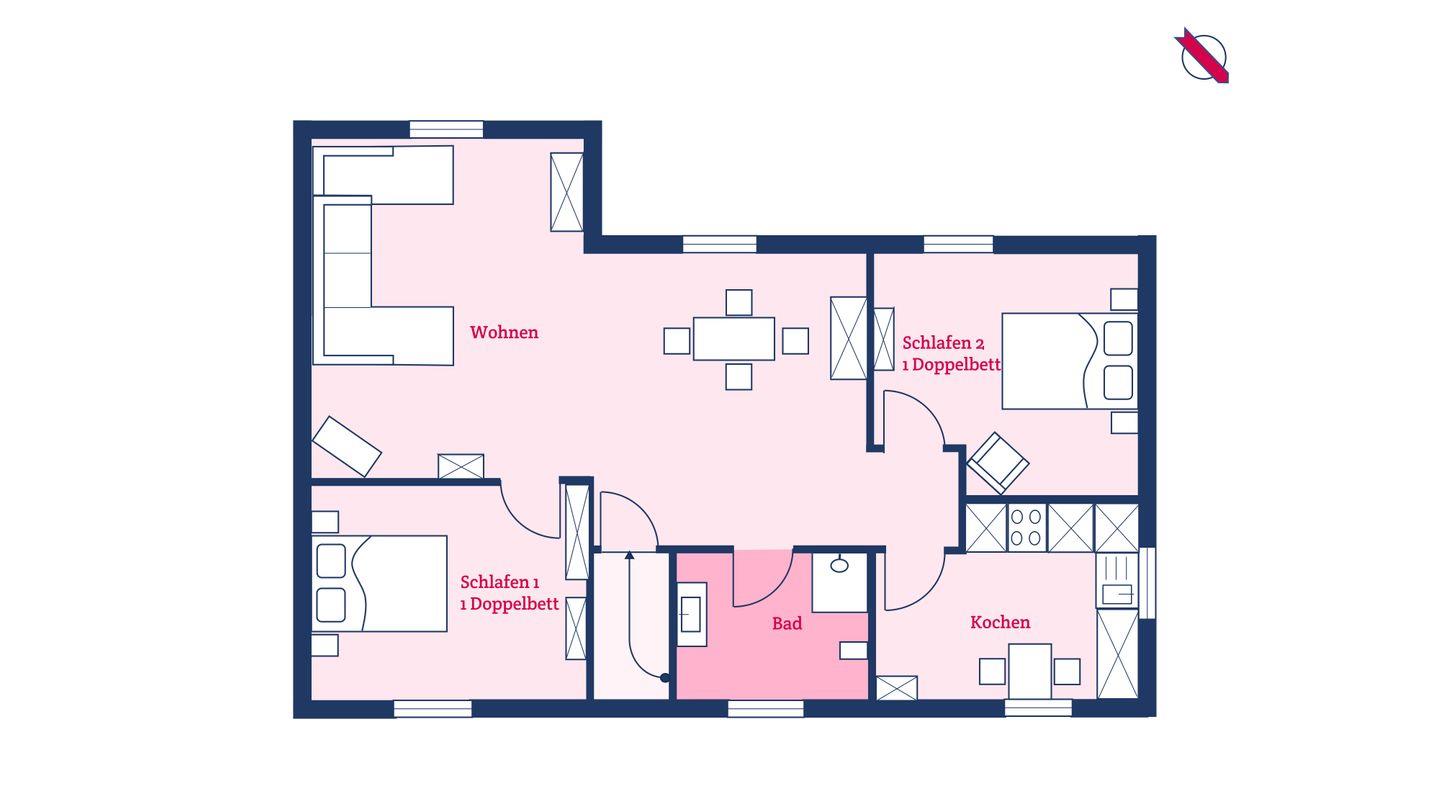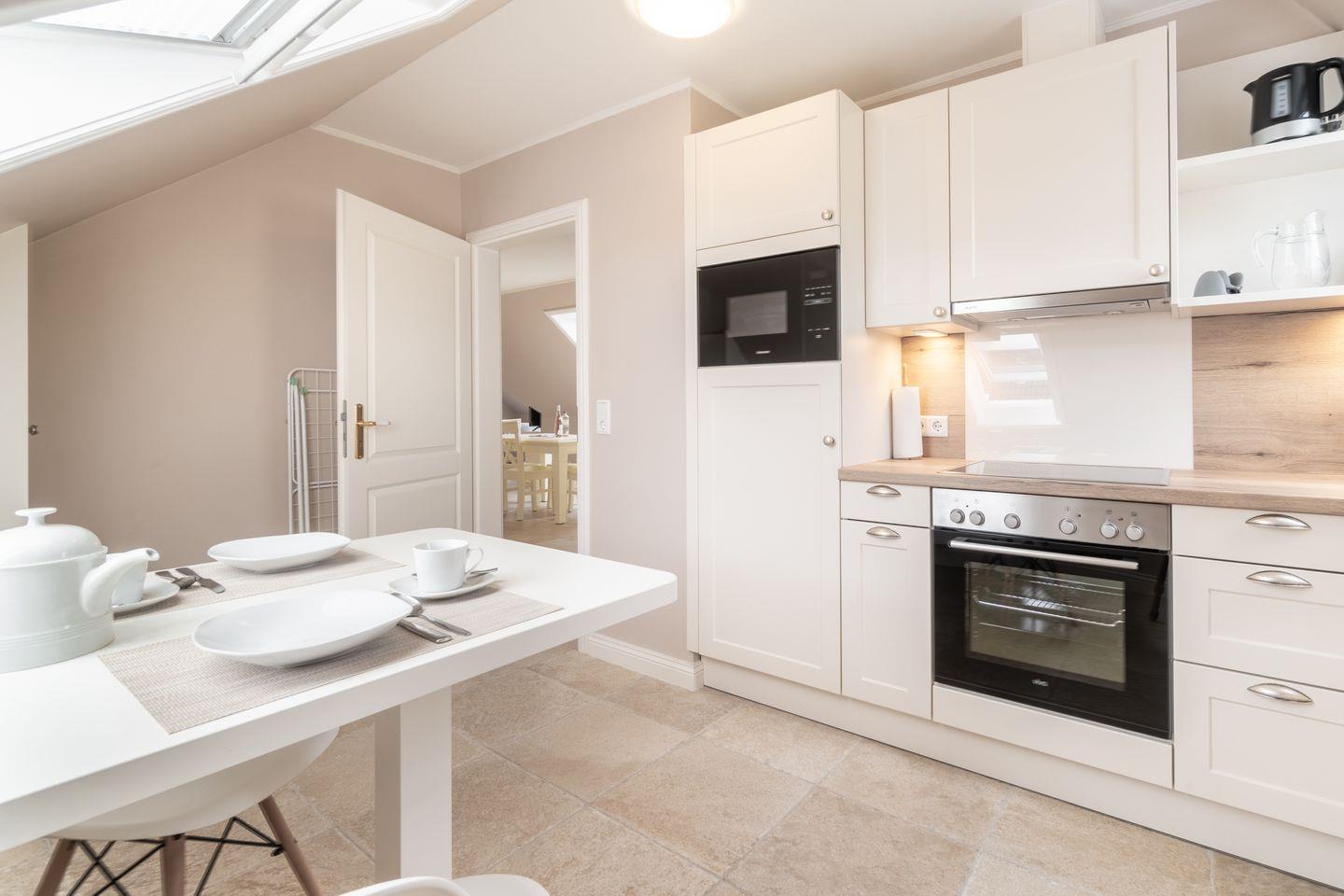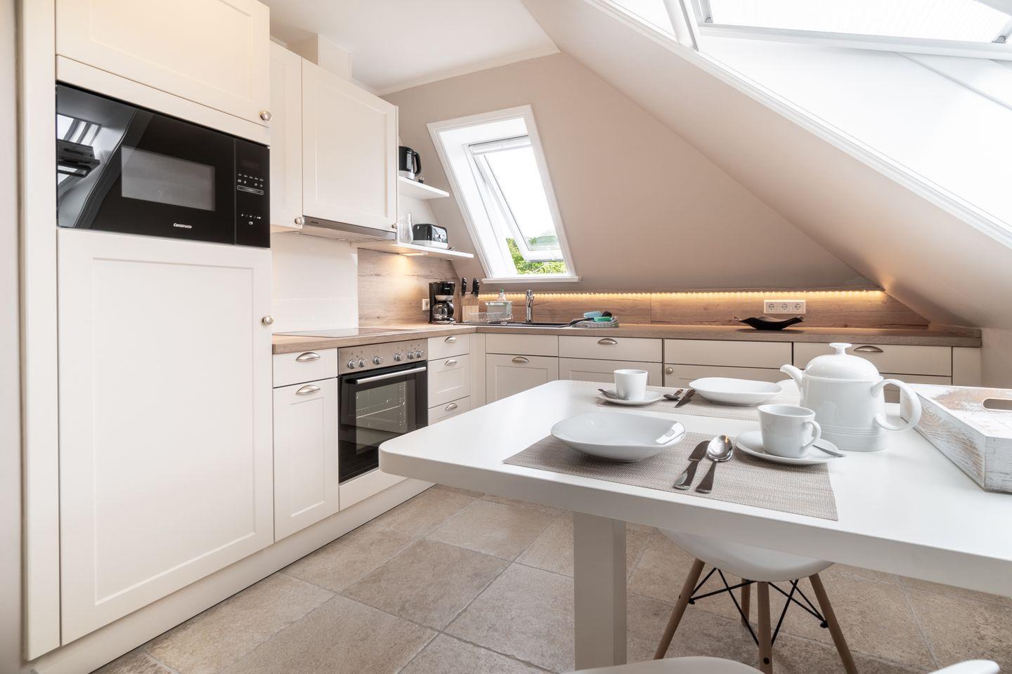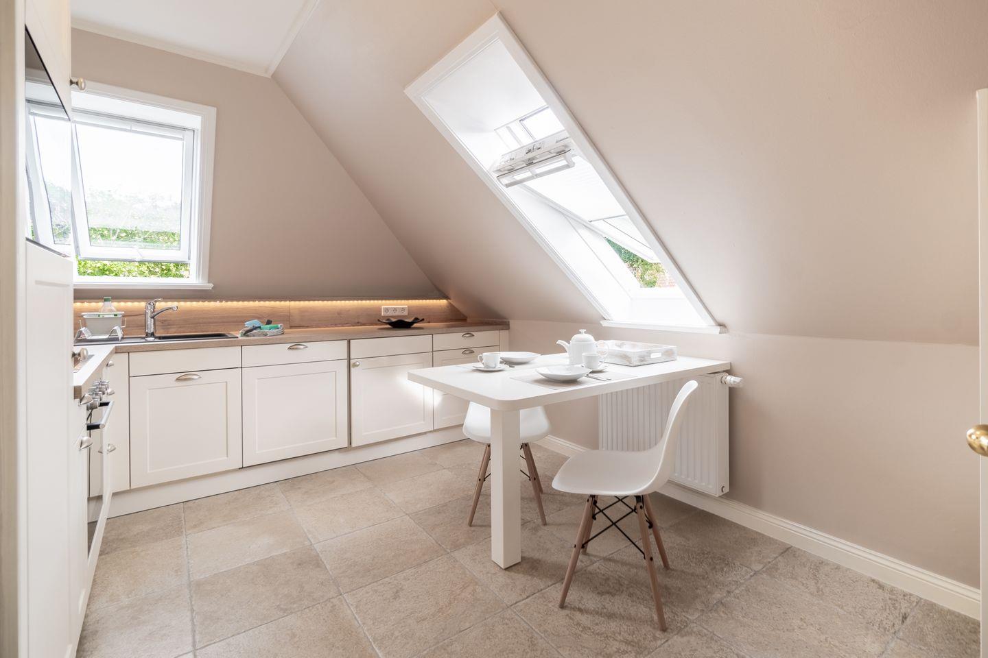 Die Wohnung verfügt zudem über einen offenen Wohn- und Essbereich, eine separate Küche mit kleinem Essplatz und ein Duschbad. Den Gästen der Wohnung 2 steht eine eigene Terrasse im gemeinschaftlich genutzten Garten zur Verfügung.