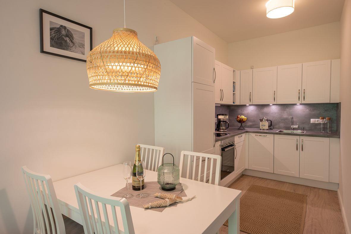 Über den westlich gelegenen Eingang gelangen Sie in die Wohnung, die mit einer modernen Küche ausgestattet ist. Hier finden Sie alles, was Sie benötigen, um Ihre Lieblingsgerichte zuzubereiten, einschließlich Ceranfeld, Backofen und Kaffeemaschine. Der Wohn- und Essbereich ist zur Küche offen gestaltet und bietet ausreichend Platz zum Entspannen und Genießen der Mahlzeiten.
