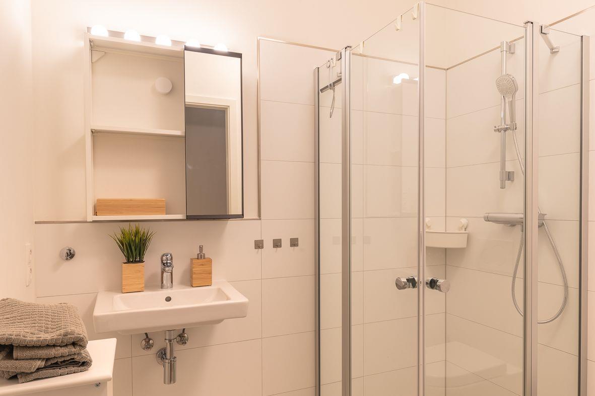 Das Badezimmer ist hell und modern gestaltet und mit einer ebenerdigen Dusche ausgestattet. Hier können Sie sich nach einem Tag an der Nordsee erfrischen und entspannen.