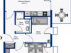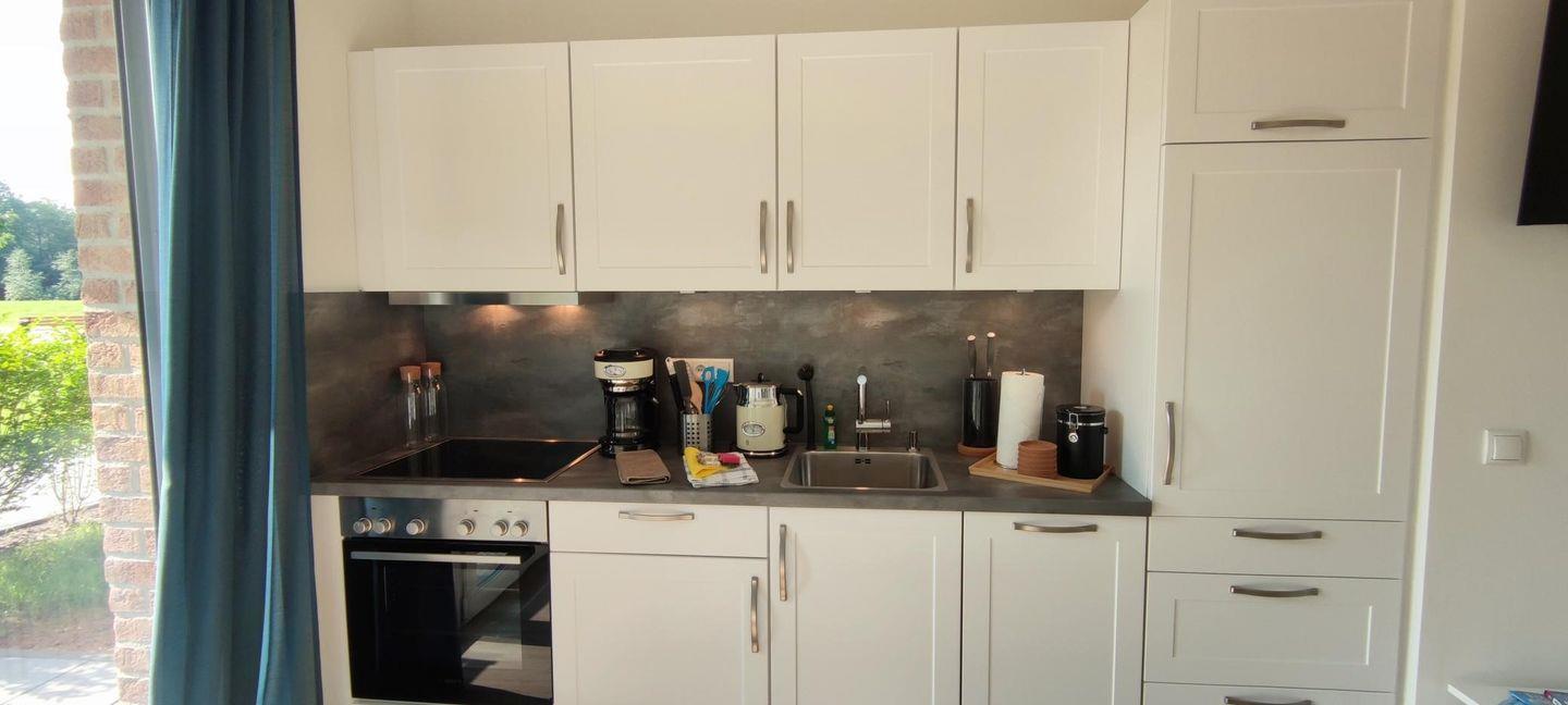 Die moderne Küche ist mit allem ausgestattet, was man für die Zubereitung von Mahlzeiten benötigt. Ein Ceranfeld, Backofen und Kaffeemaschine sind selbstverständlich vorhanden und bieten viel Komfort. Der angrenzende Wohn- und Essbereich ist offen gestaltet und bietet ausreichend Platz zum Entspannen und gemeinsamen Essen.