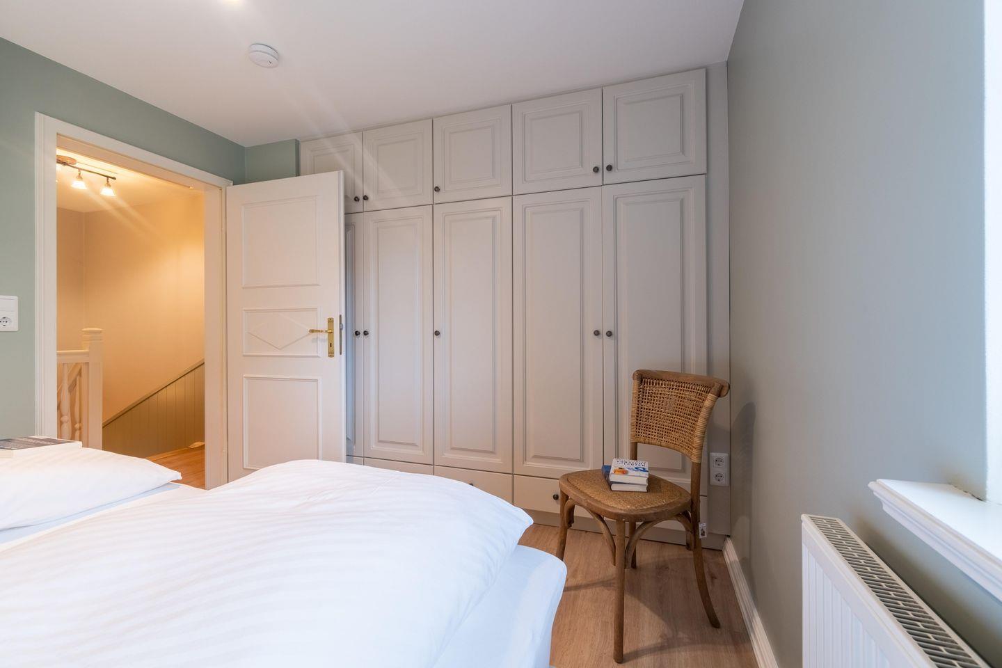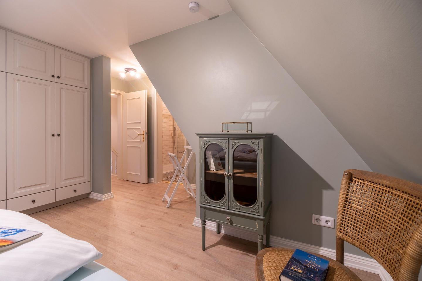 Im Obergeschoss sind die beiden Schlafzimmer - eines mit Doppelbett und eines mit zwei Einzelbetten - sowie zwei der drei Bäder - eines davon en Suite - gelegen.