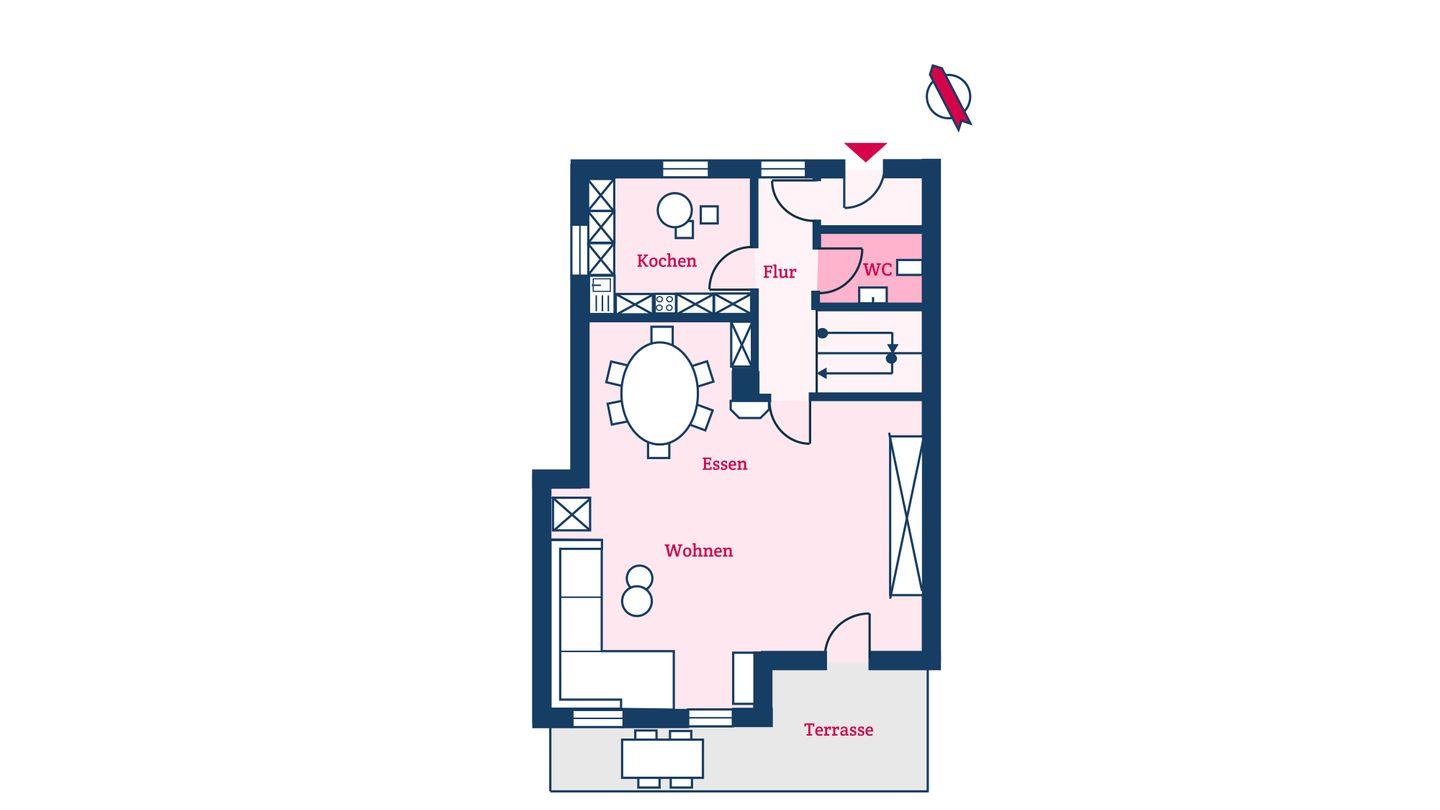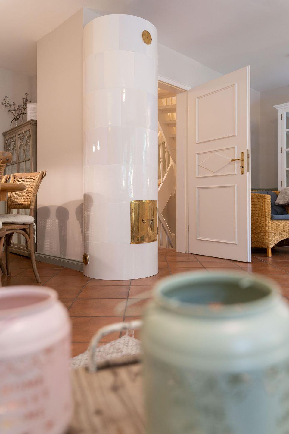 Im Erdgeschoss befinden sich das offene Wohn-/Esszimmer mit separater Küche sowie ein Gäste-WC. Der Original Mylin-Kachelofen im Wohnzimmer spendet auch an kühleren Tagen wohlige Wärme. Die voll ausgestattete Küche wird jeden Hobbykoch begeistern.