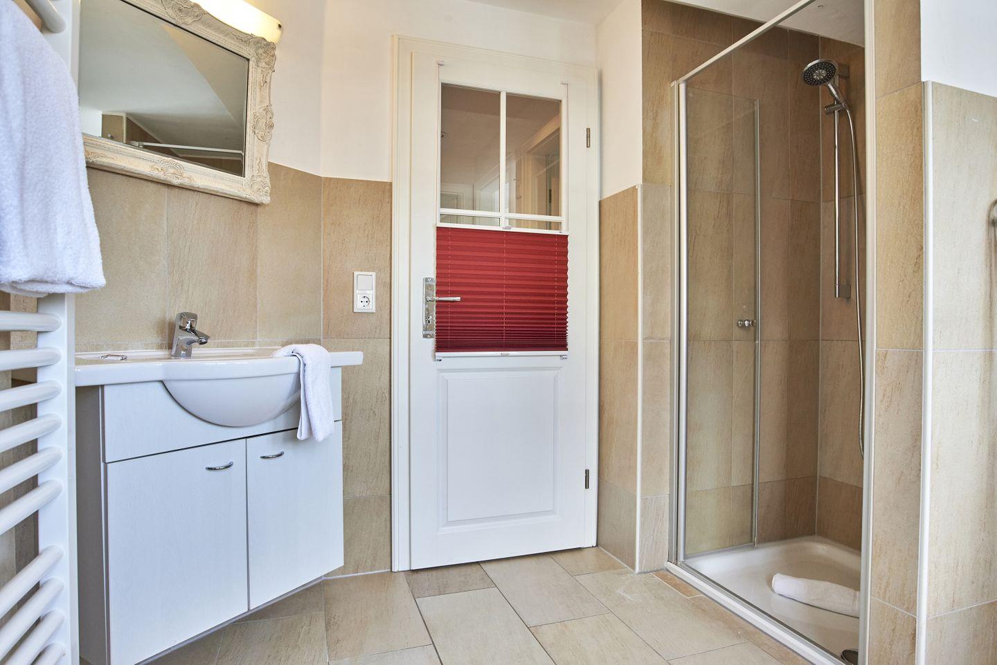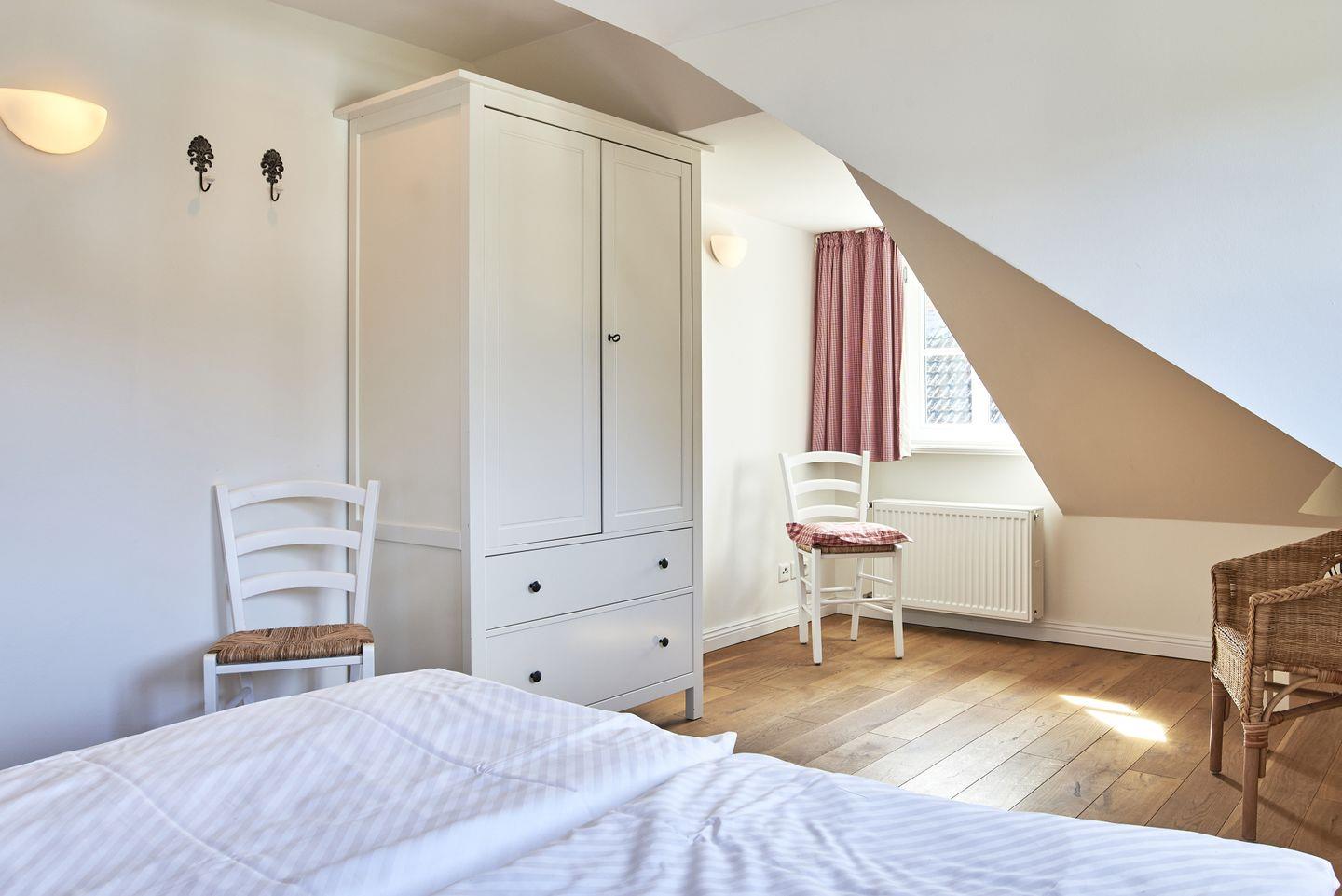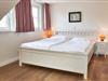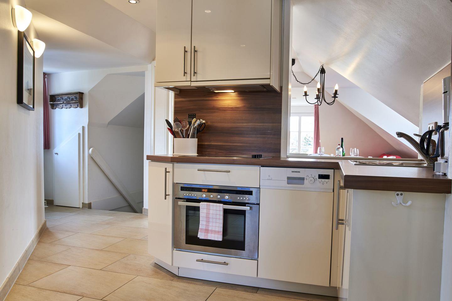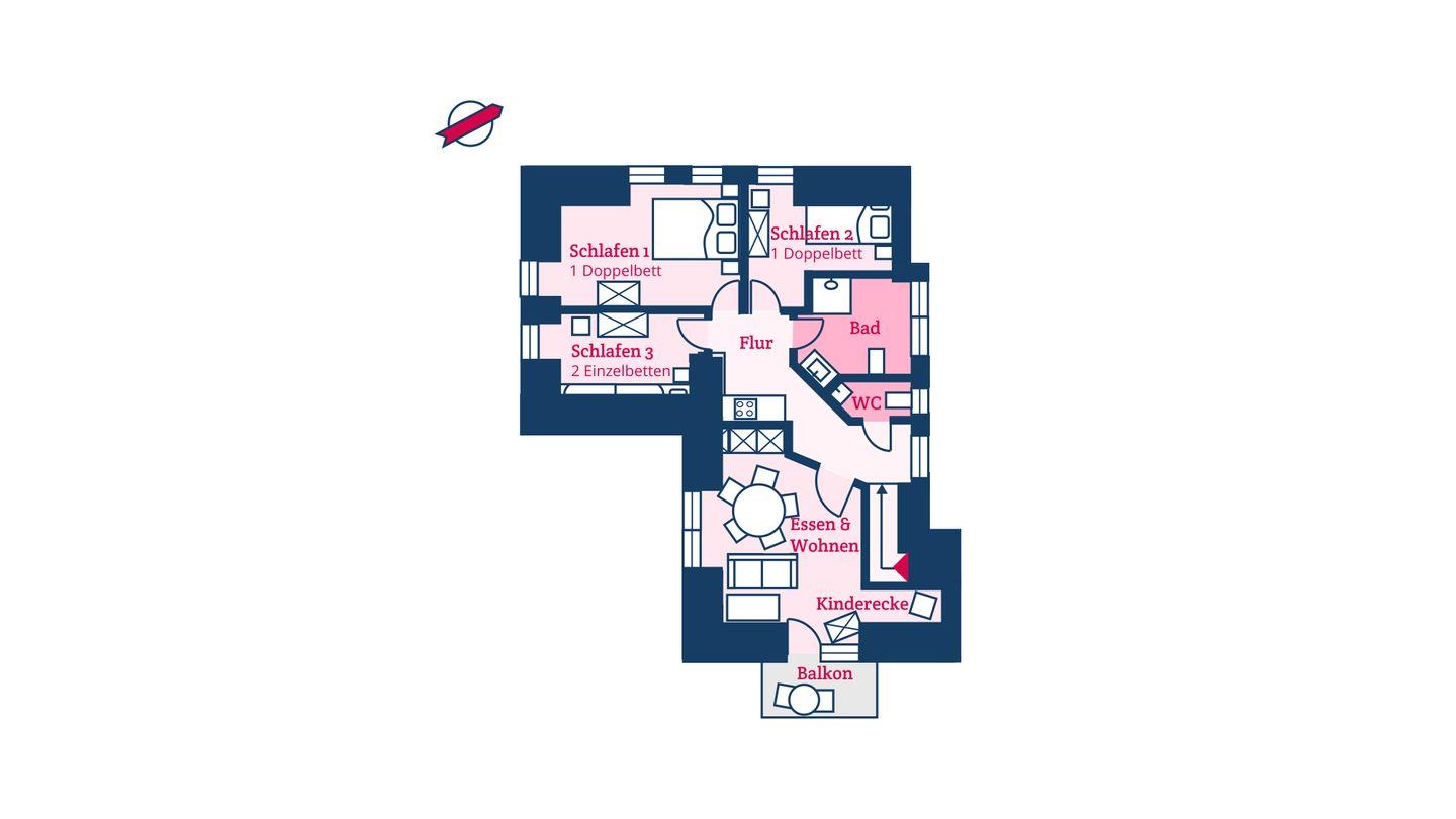 Die großzügig geschnittene Wohnung liegt im Obergeschoss. Hier befinden sich der lichtdurchflutete Wohn- und Essbereich mit angrenzender Küche, drei Schlafzimmer, ein Duschbad und ein Gäste-WC. Über den Wohnbereich gelangen Sie auf den Balkon mit Blick in den Garten. Über einen halboffenen Tresen blicken Sie vom Wohnbereich in die vollständig ausgestattete Küche im edlen Design und können so dem Koch oder der Köchin beim Zaubern zusehen. Das erste Schlafzimmer bietet Ihnen einen Rückzugsraum mit Doppelbett und Sitzecke. Das zweite Schlafzimmer verfügt über ein Queen-Size-Bett sowie einem eigenen Flachbildfernseher.. Im dritten Schlafzimmer befinden sich zwei Einzelbetten. Das helle Badezimmer hat neben der bodengleichen Dusche auch einen Waschtrockner.