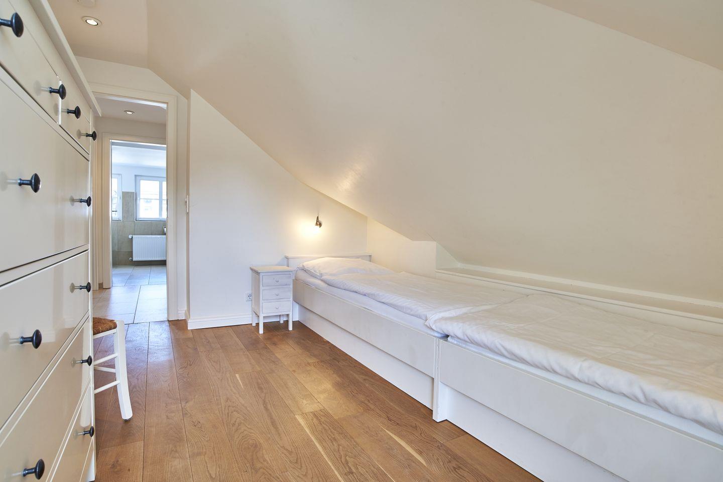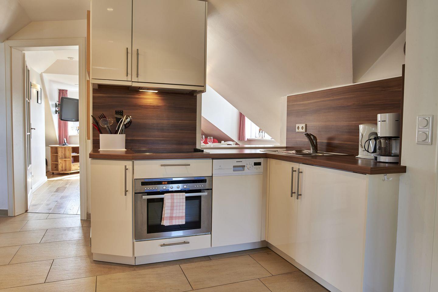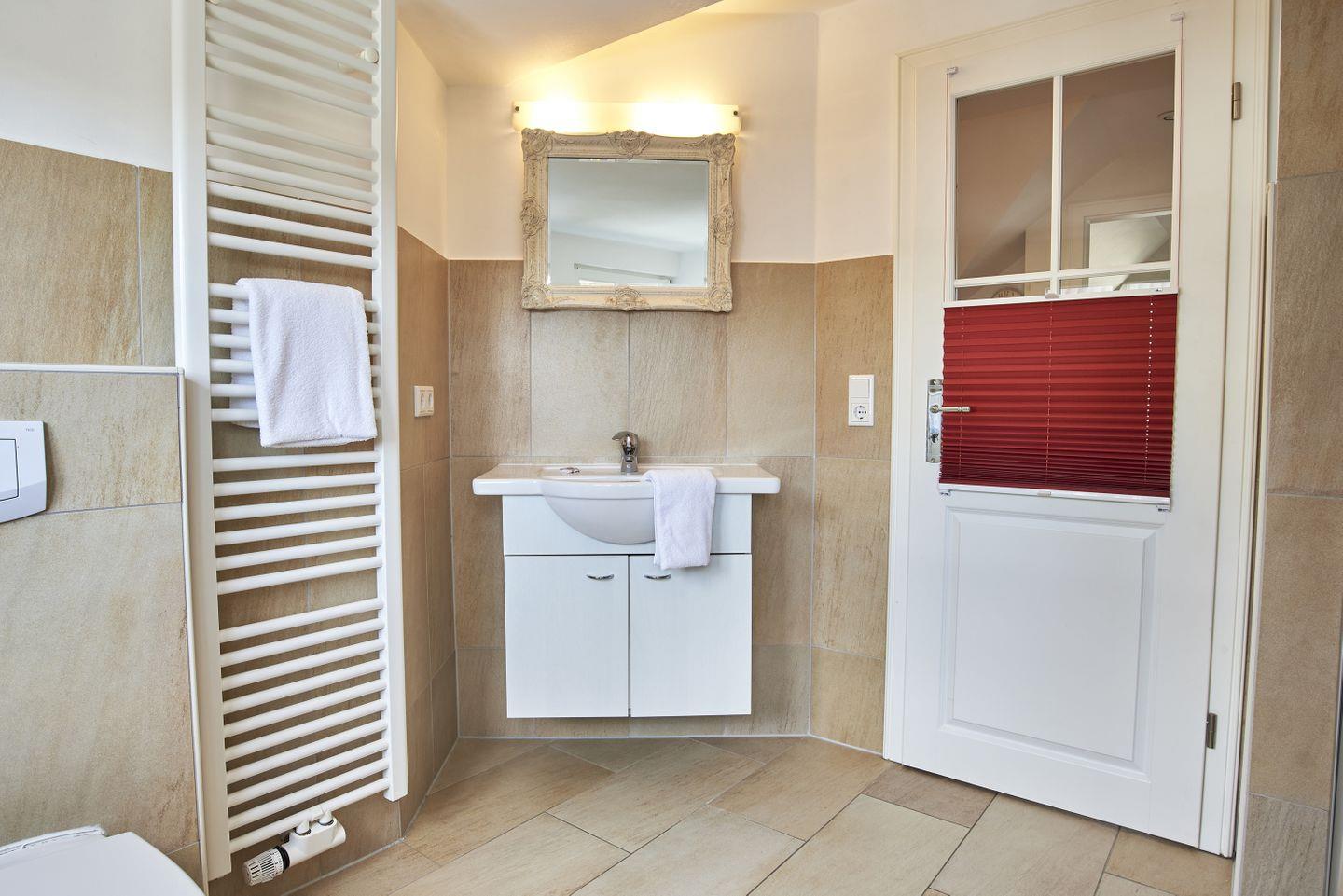 Die großzügig geschnittene Wohnung liegt im Obergeschoss. Hier befinden sich der lichtdurchflutete Wohn- und Essbereich mit angrenzender Küche, drei Schlafzimmer, ein Duschbad und ein Gäste-WC. Über den Wohnbereich gelangen Sie auf den Balkon mit Blick in den Garten. Über einen halboffenen Tresen blicken Sie vom Wohnbereich in die vollständig ausgestattete Küche im edlen Design und können so dem Koch oder der Köchin beim Zaubern zusehen. Das erste Schlafzimmer bietet Ihnen einen Rückzugsraum mit Doppelbett und Sitzecke. Das zweite Schlafzimmer verfügt über ein Queen-Size-Bett sowie einem eigenen Flachbildfernseher.. Im dritten Schlafzimmer befinden sich zwei Einzelbetten. Das helle Badezimmer hat neben der bodengleichen Dusche auch einen Waschtrockner.
