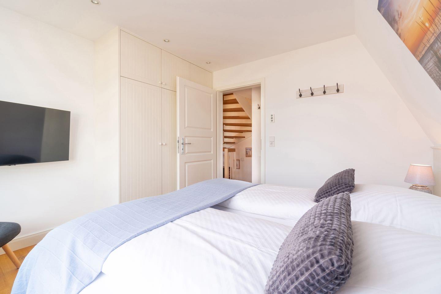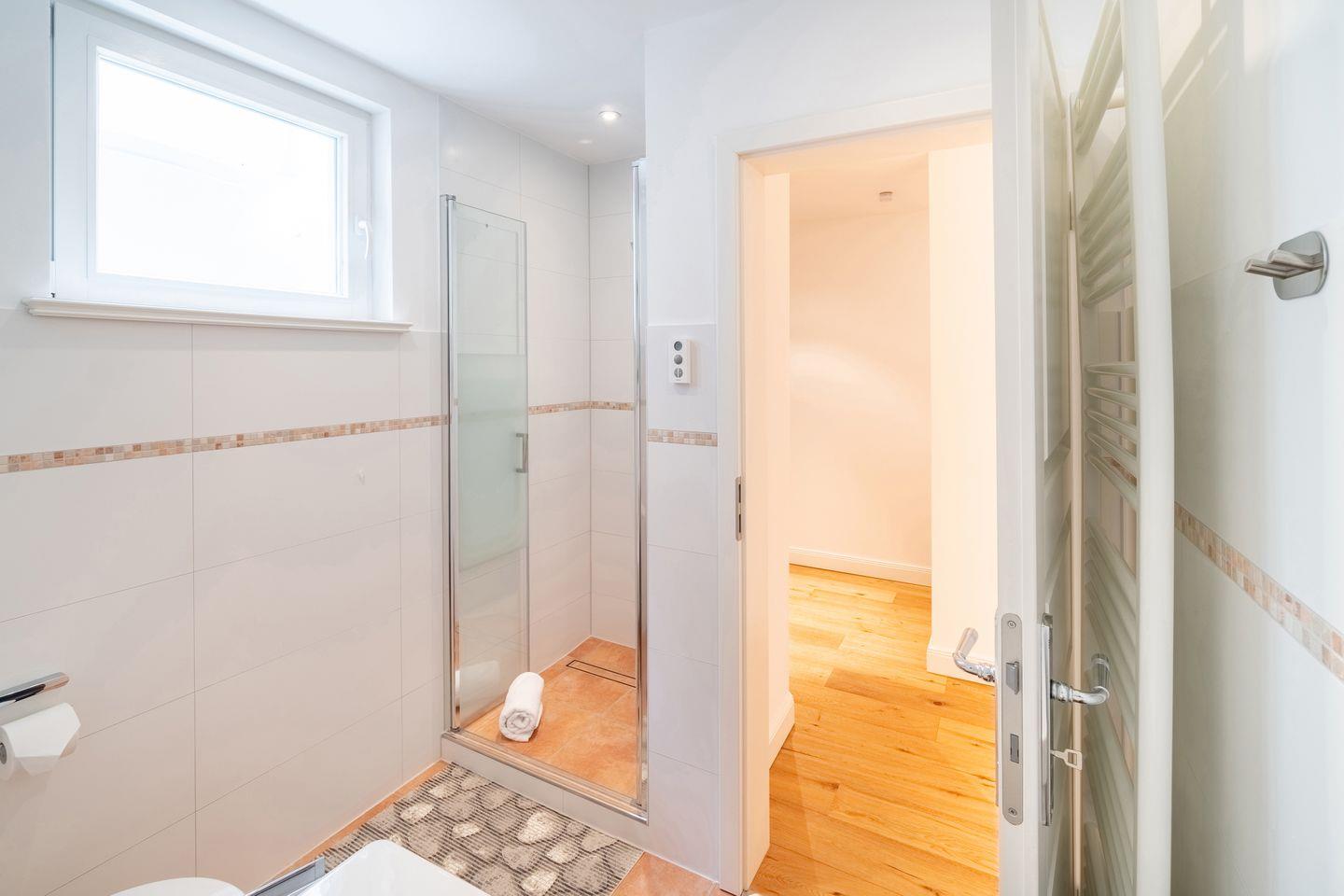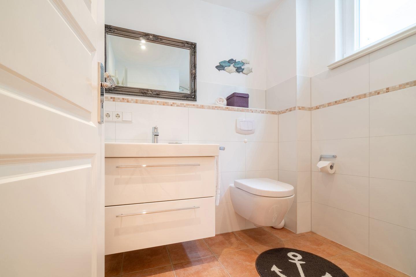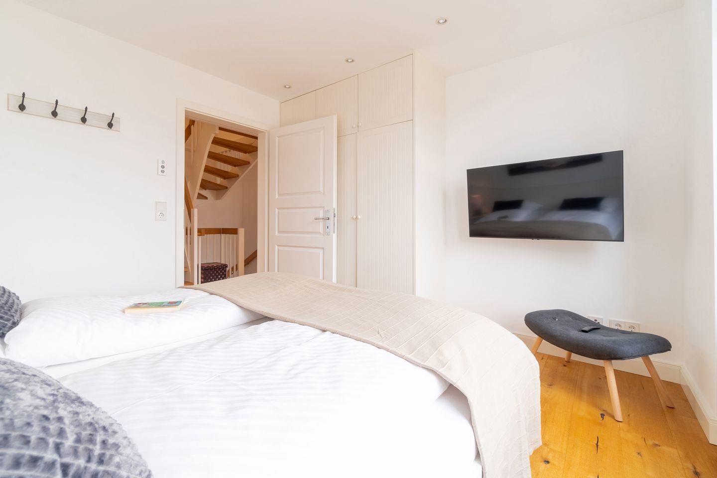 Im Souterrain befinden sich ein weiteres Schlafzimmer mit Doppelbett, ein Duschbad mit bodengleicher Dusche, die hauseigene Sauna und ein Hauswirtschaftsraum mit Waschmaschine.