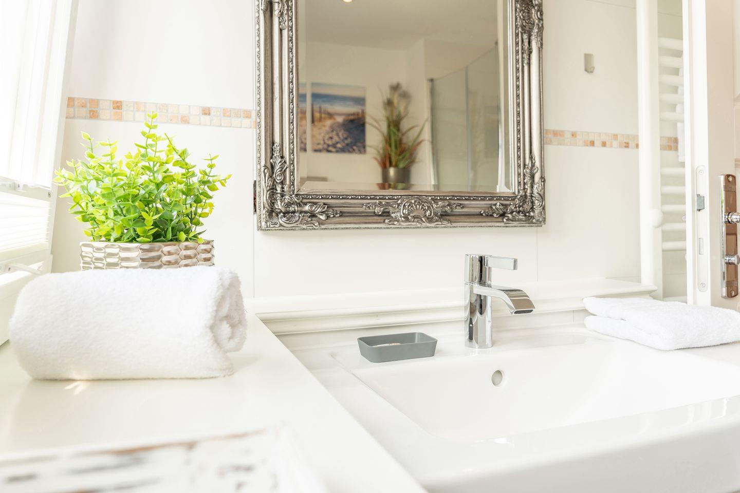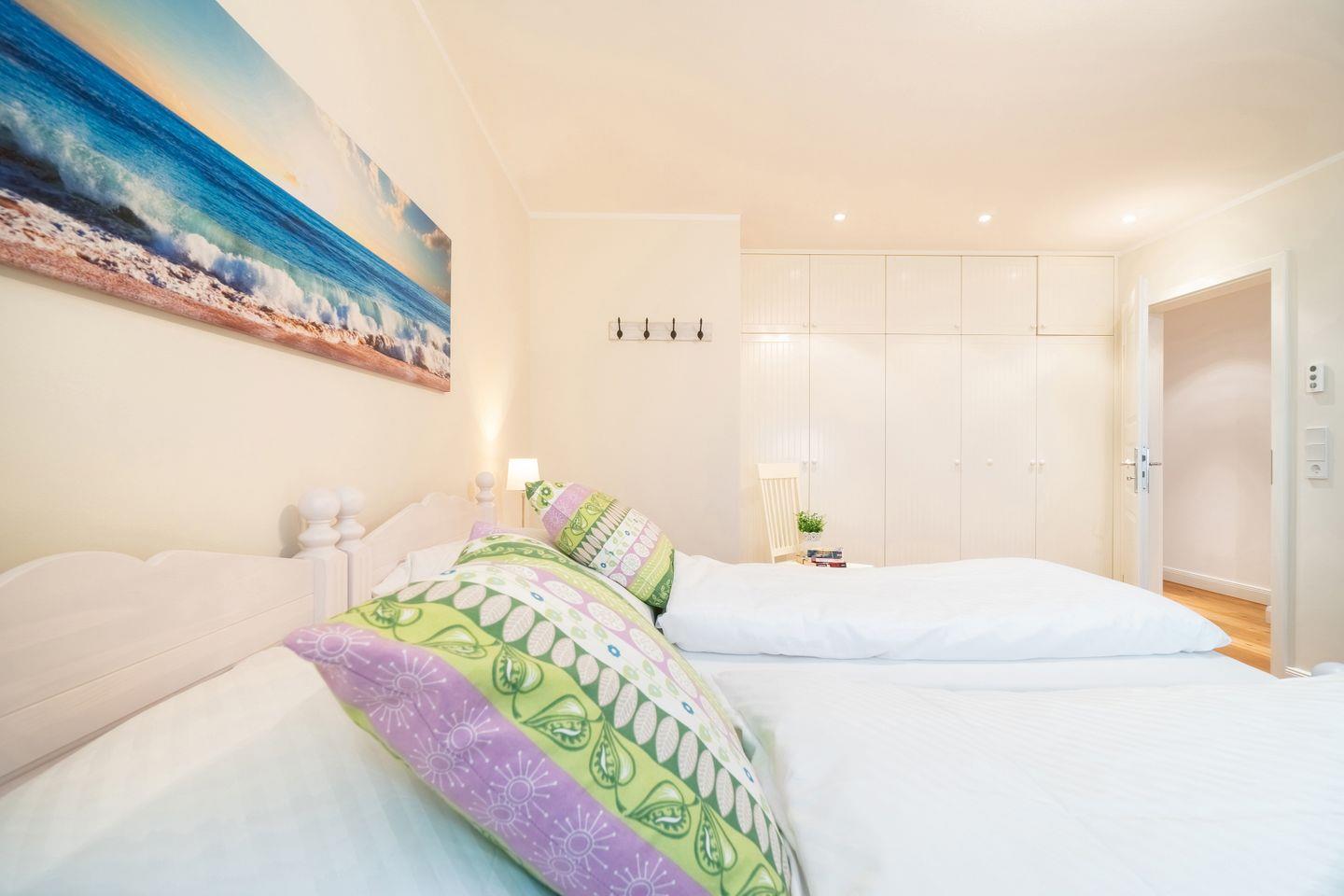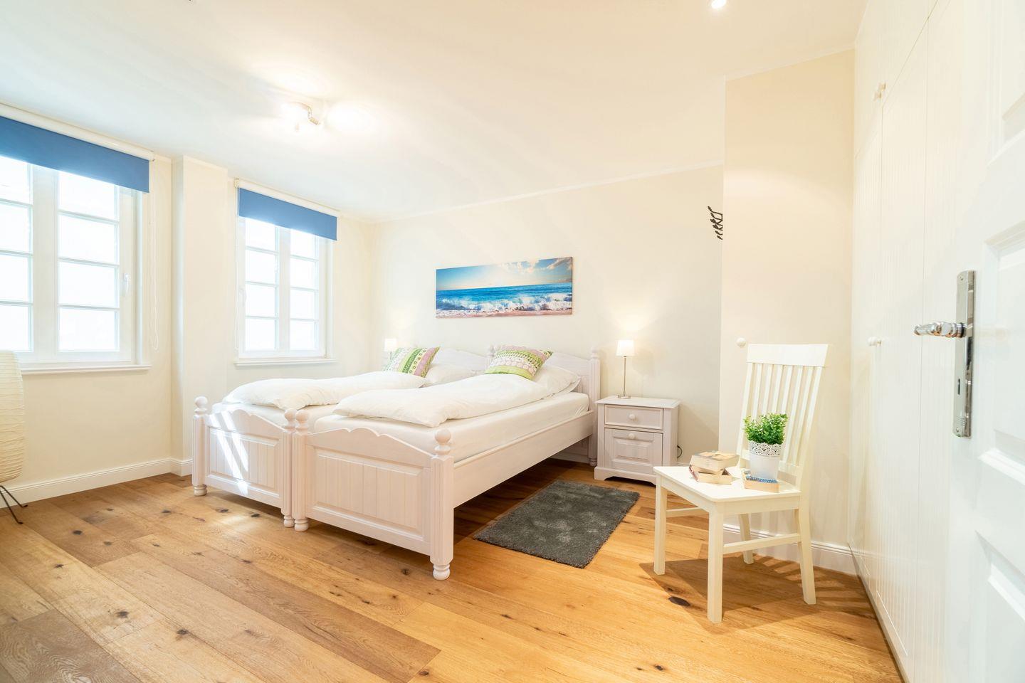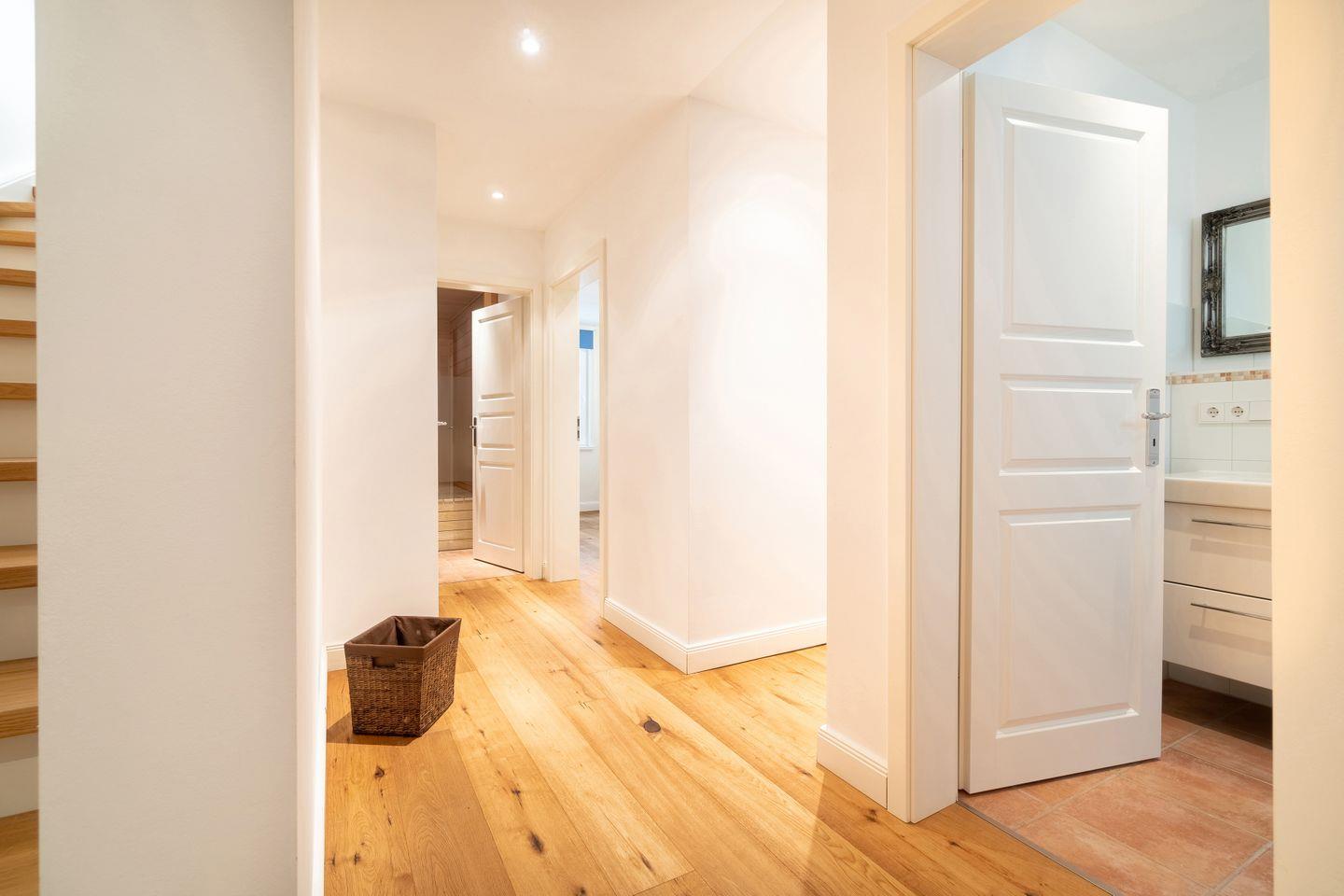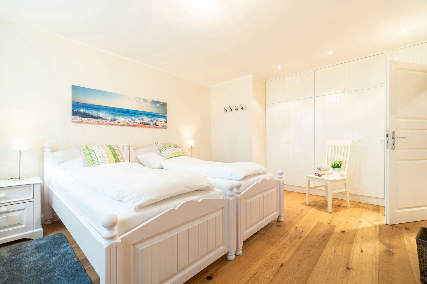 Im Souterrain befinden sich ein weiteres Schlafzimmer mit Doppelbett, ein Duschbad mit bodengleicher Dusche, die hauseigene Sauna und ein Hauswirtschaftsraum mit Waschmaschine.