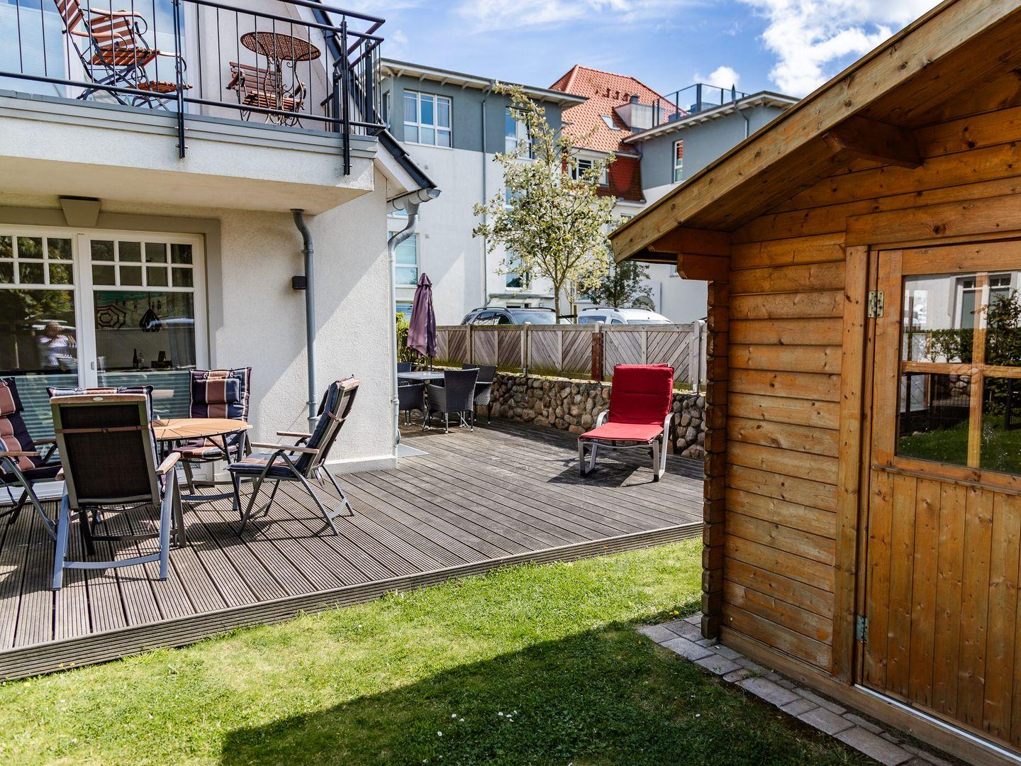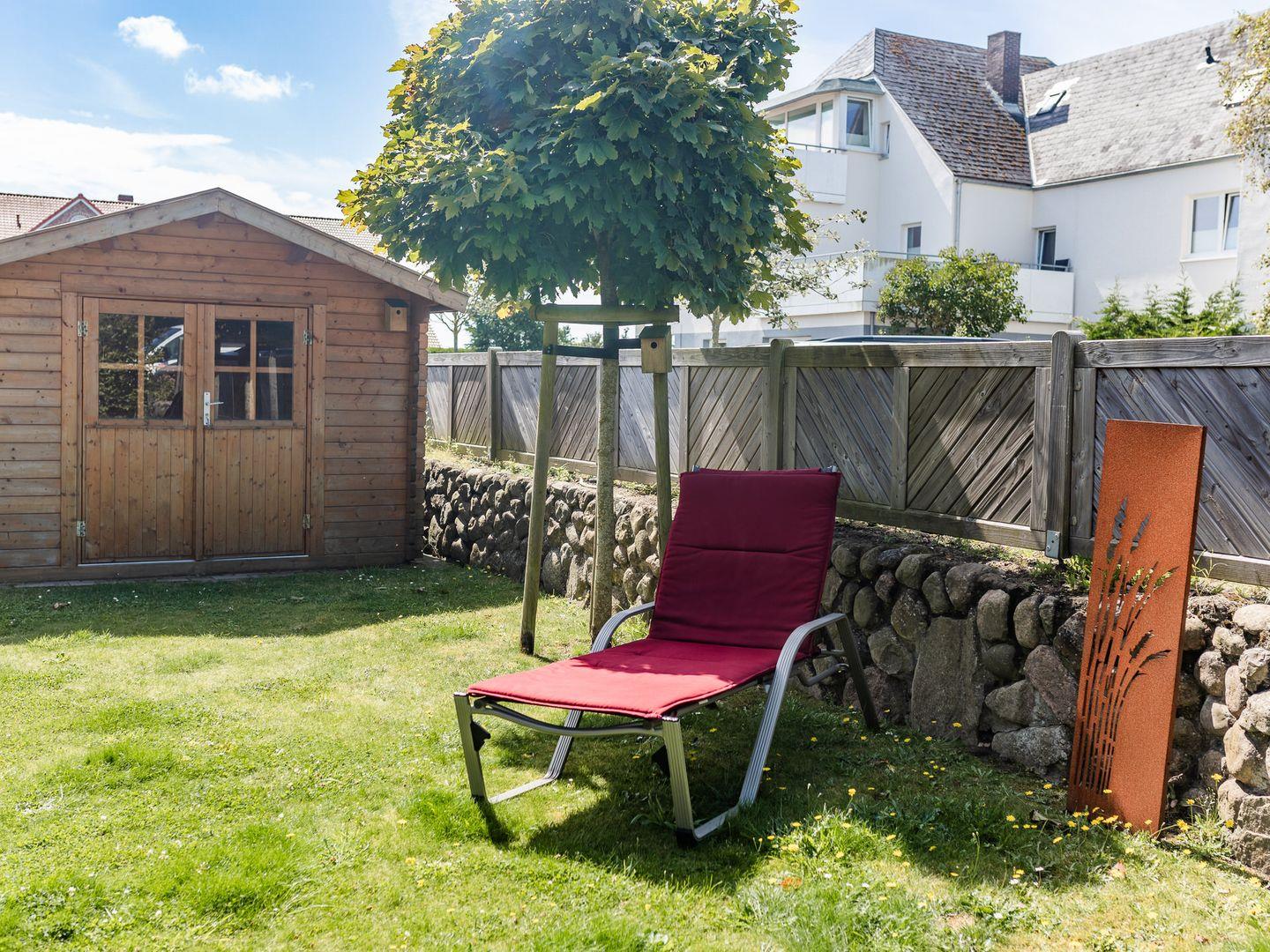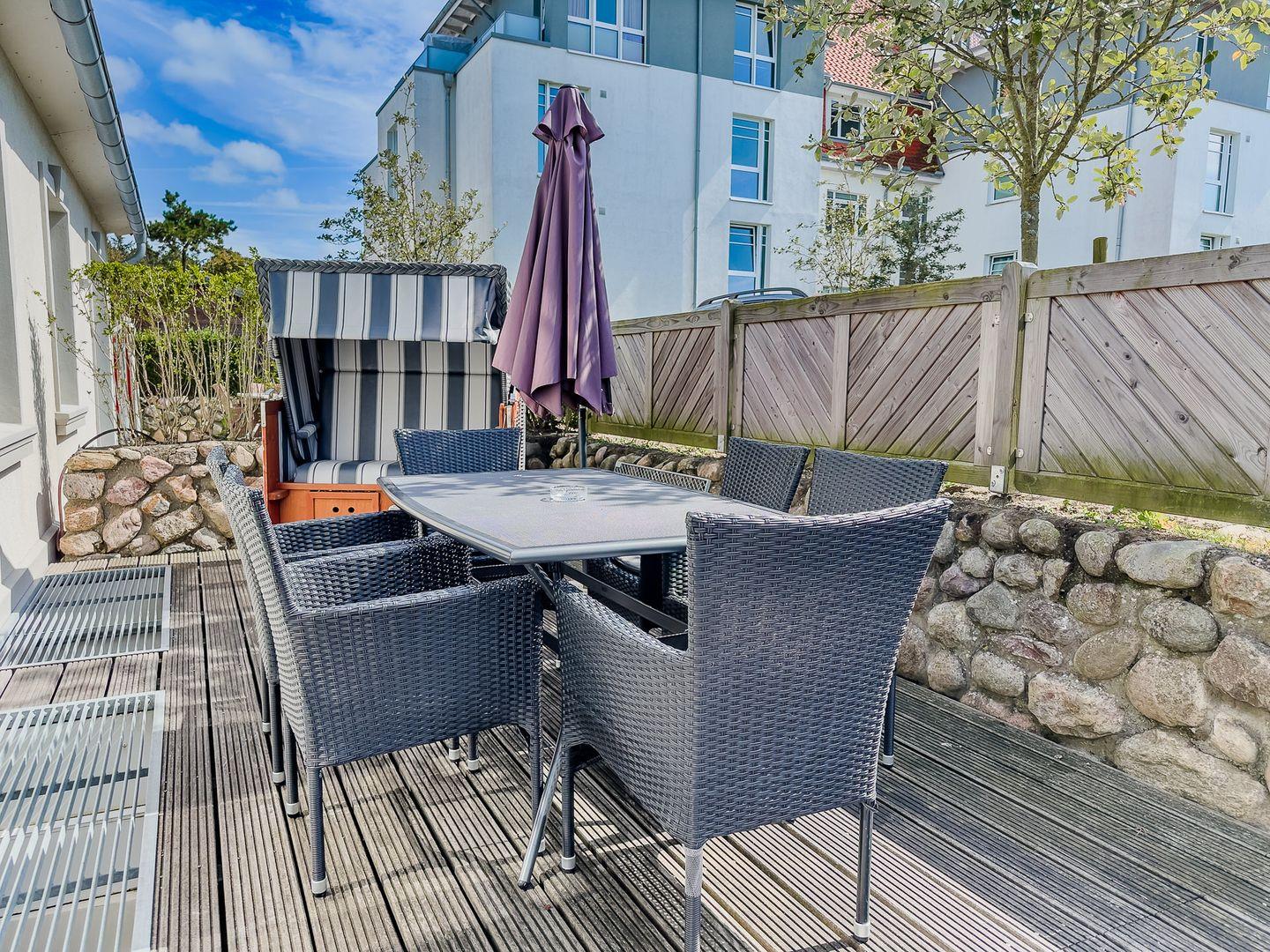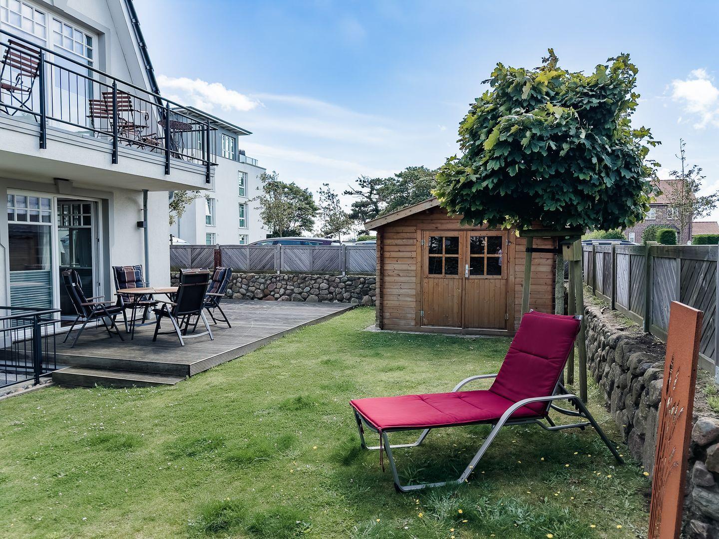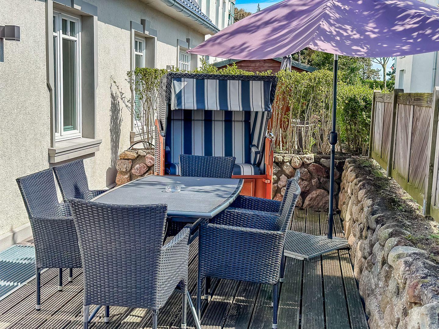 Im Außenbereich befinden sich eine Terrasse mit Strandkorb im Garten, sowie ein PKW-Stellplatz. Zudem steht Ihnen ein Saisonstrandkorb direkt am Strand zur Verfügung, im Strandabschnitt 13-19.