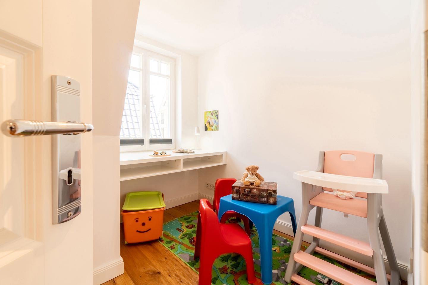Im Obergeschoss befinden sich zwei Doppelbett-Schlafzimmer mit gemeinsamem Balkon, ein Duschbad mit Meerblick, sowie ein Spielzimmer für Ihre Kinder.