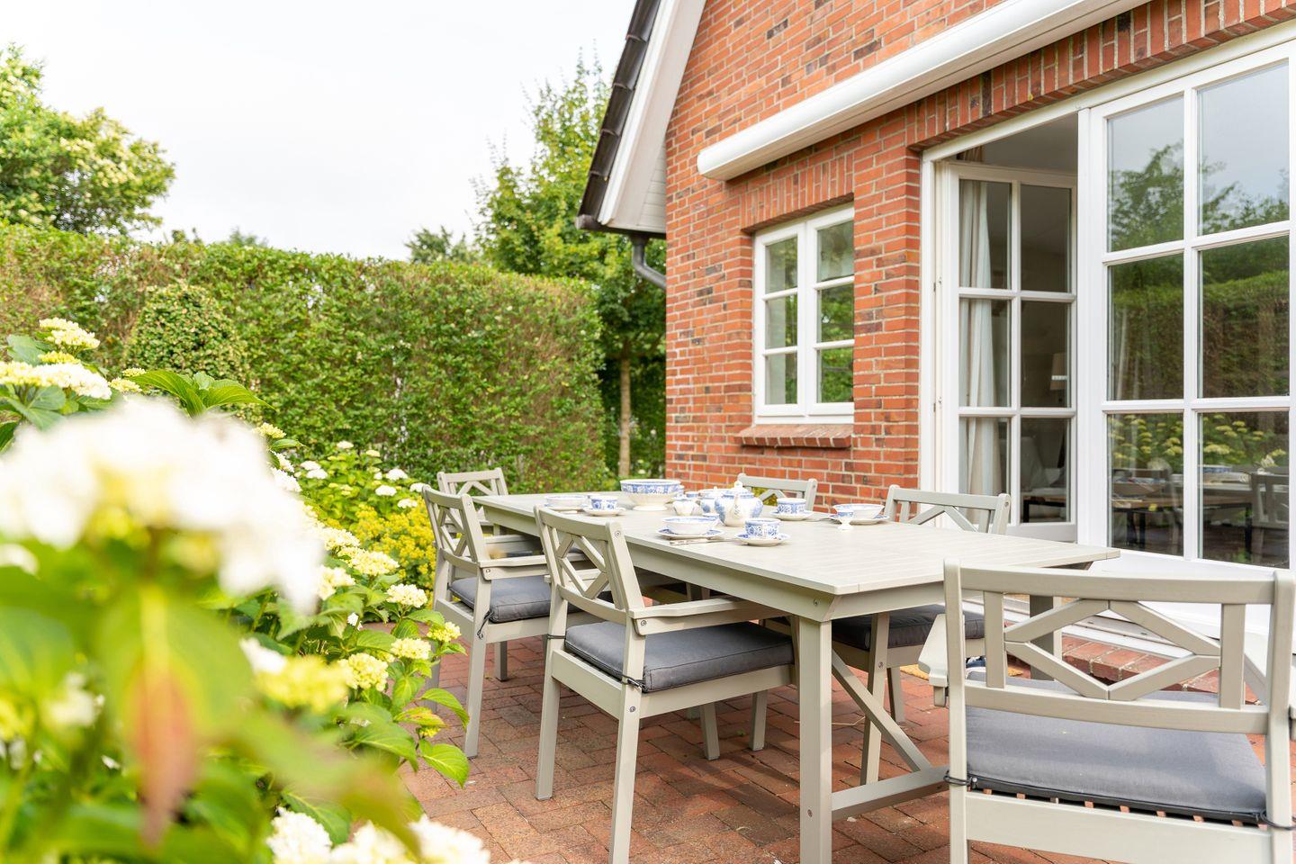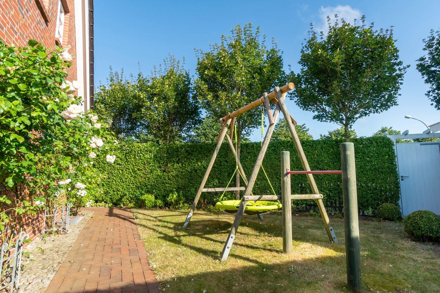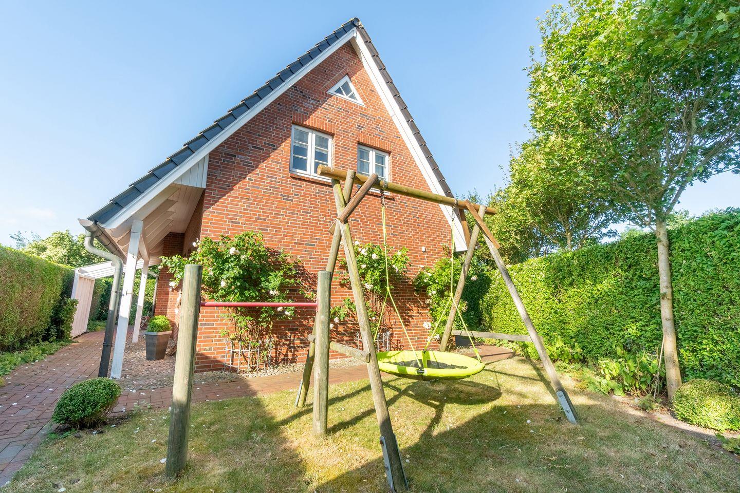 Das Grundstück am Wyker Ortsrand ist vollständig von einer Hecke umgeben und bietet somit angemessene Privatsphäre. Im Garten befinden sich neben der Terrasse noch eine Schaukel und eine Kletterstange zum Spielen und Toben. Abgerundet wird das Angebot durch einen PKW-Stellplatz am Haus sowie das Gartenhäuschen, in dem Sie Ihre Fahrräder unterstellen können.