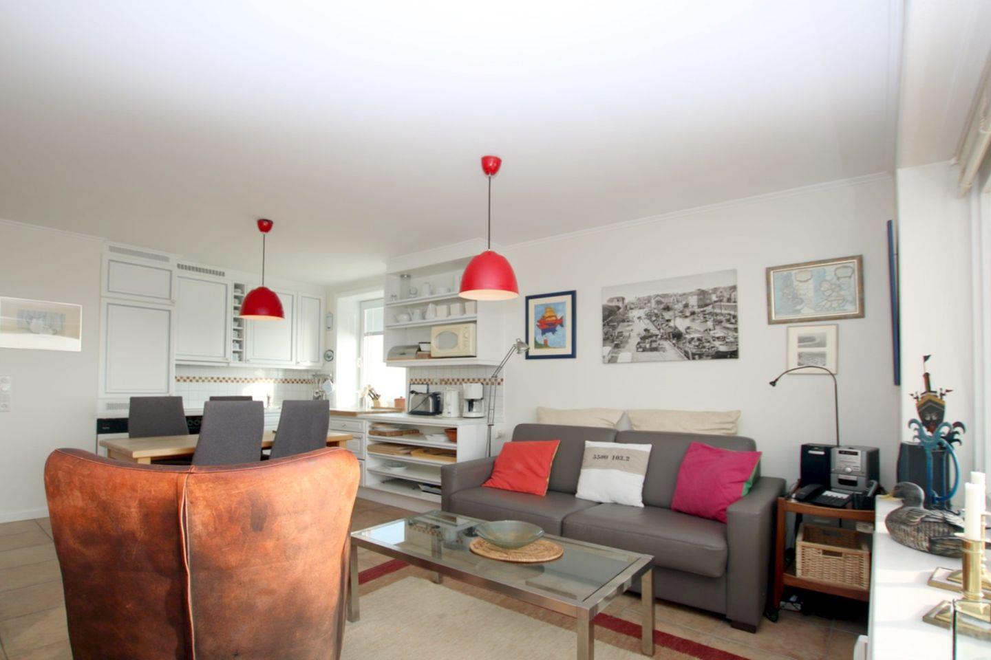- Wohnzimmer mit Sitzecke, 2 Sessel, Esstisch mit 4 Stühlen und Küchenzeile