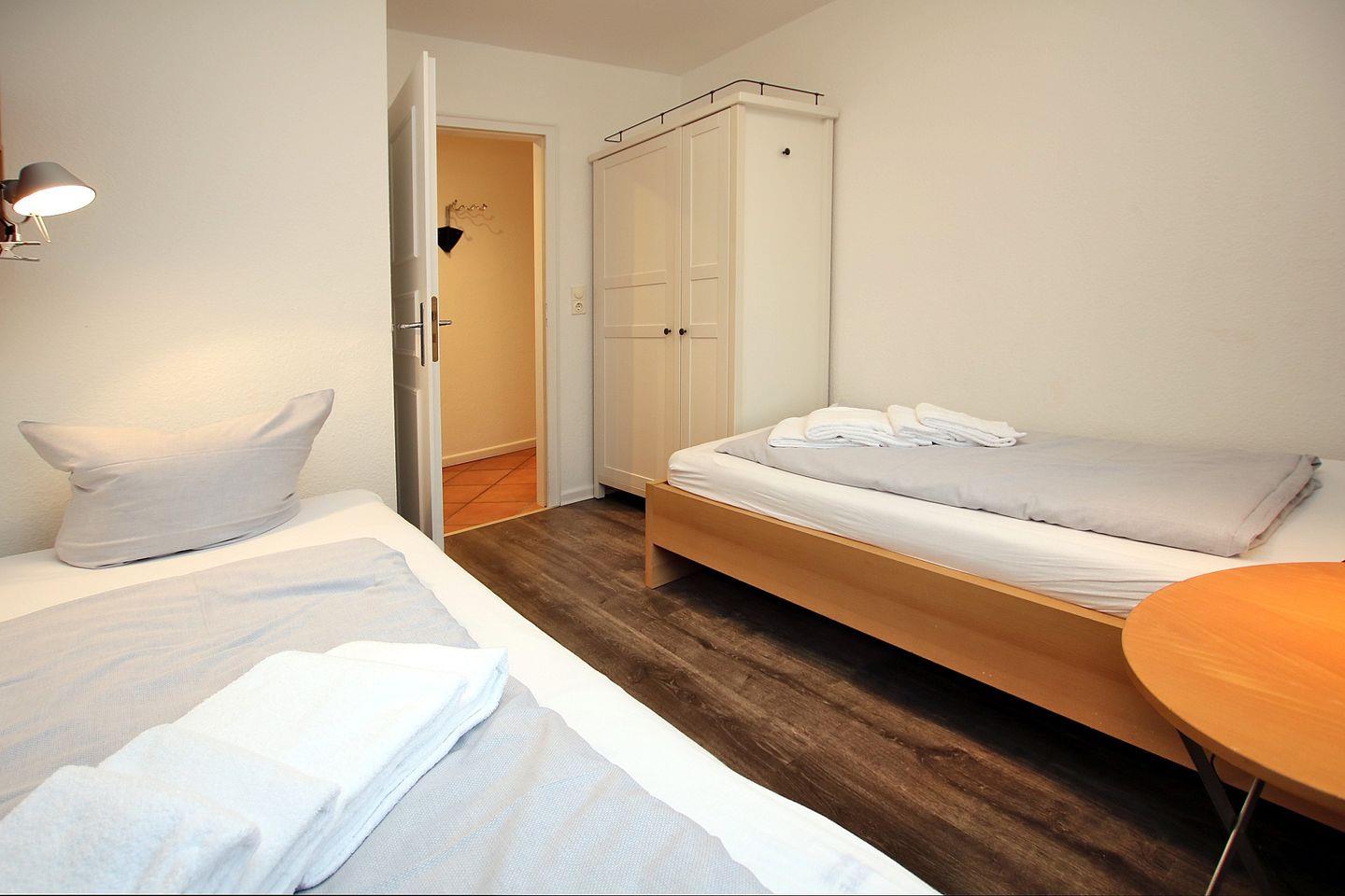Im SCHLAFZIMMER 1 sind zwei getrennt stehende Betten (0,90 x 2 m) und eine Kommode. Das SCHLAFZIMMER 2 verfügt über ein Doppelbett (1,80 x 2 m) und einen geräumigen Kleiderschrank. Beide Zimmer sind mit Teppich ausgelegt. Im Badezimmer befinden sich Dusche und WC.