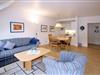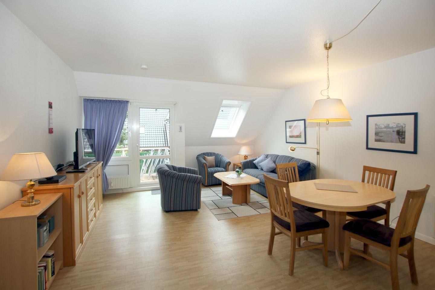 16 Wohnungen. WOHNZIMMER: Couch, 2 Sessel, Esstisch mit 4 Stühlen und TV.