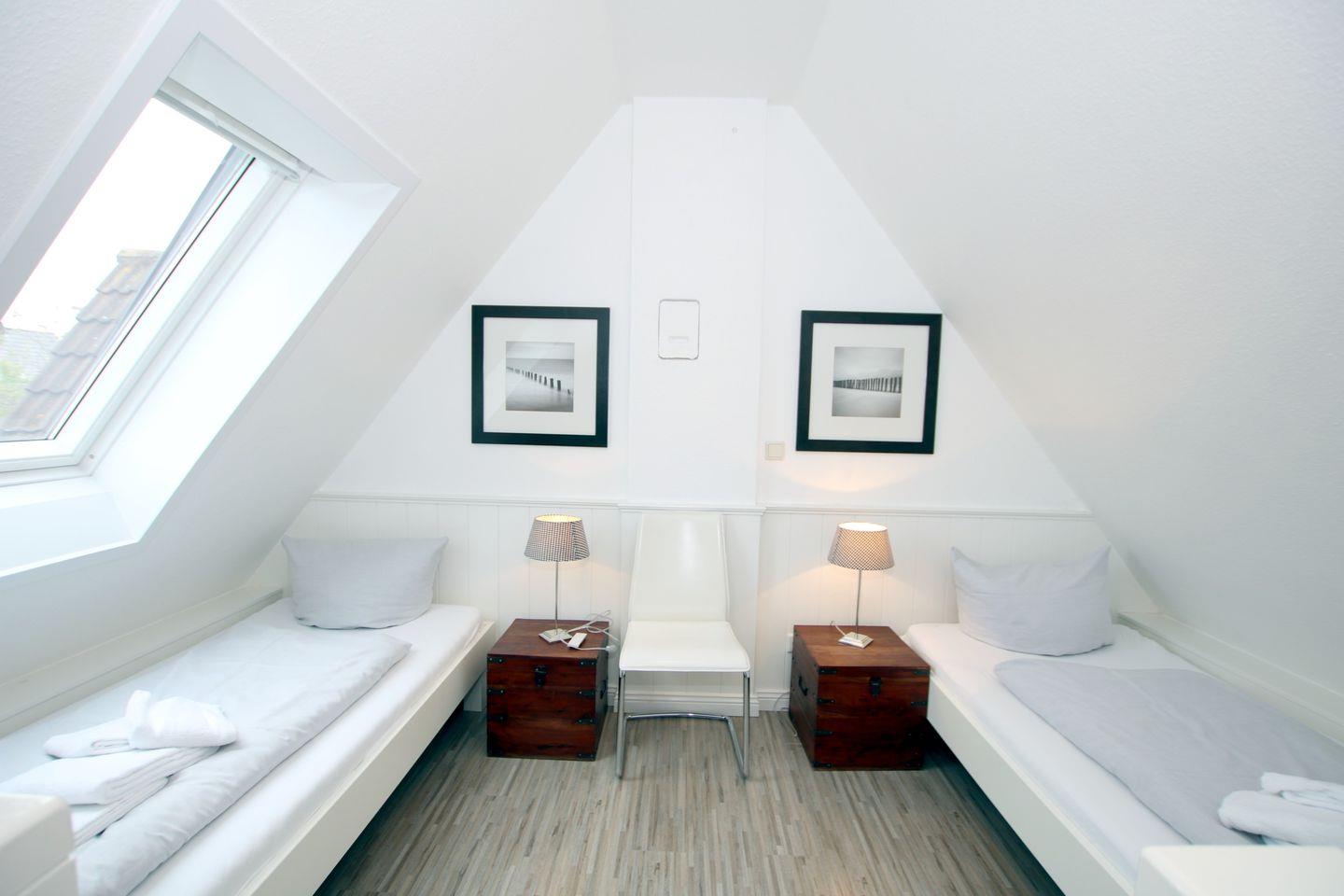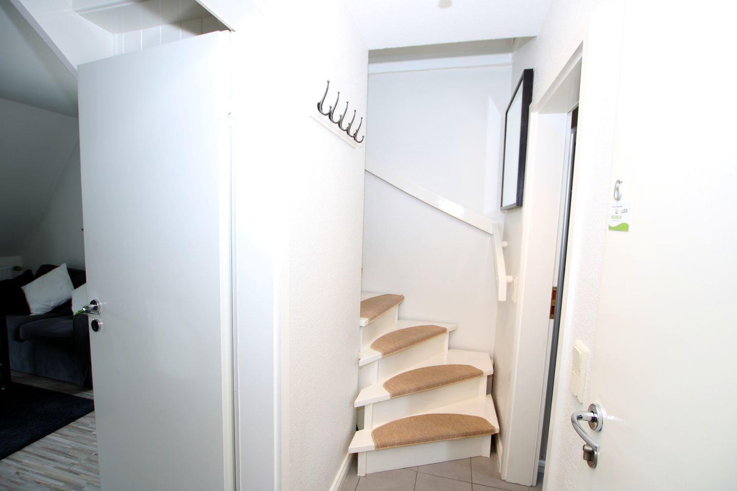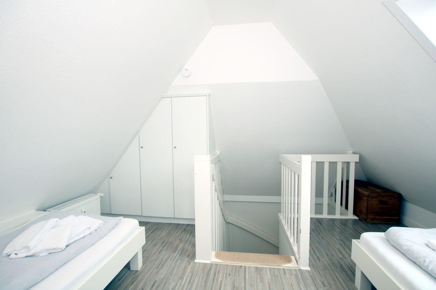 - Vom Flur führt eine offene Treppe ins Dachgeschoss, dort stehen 2 Einzelbetten