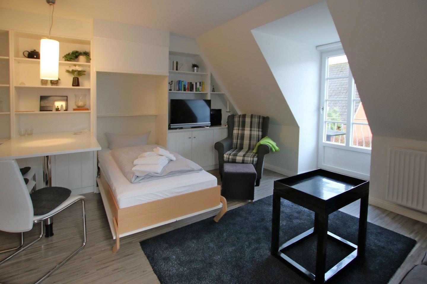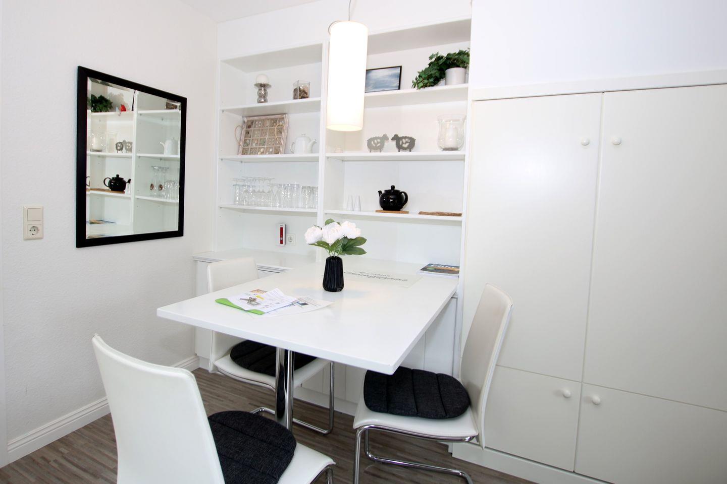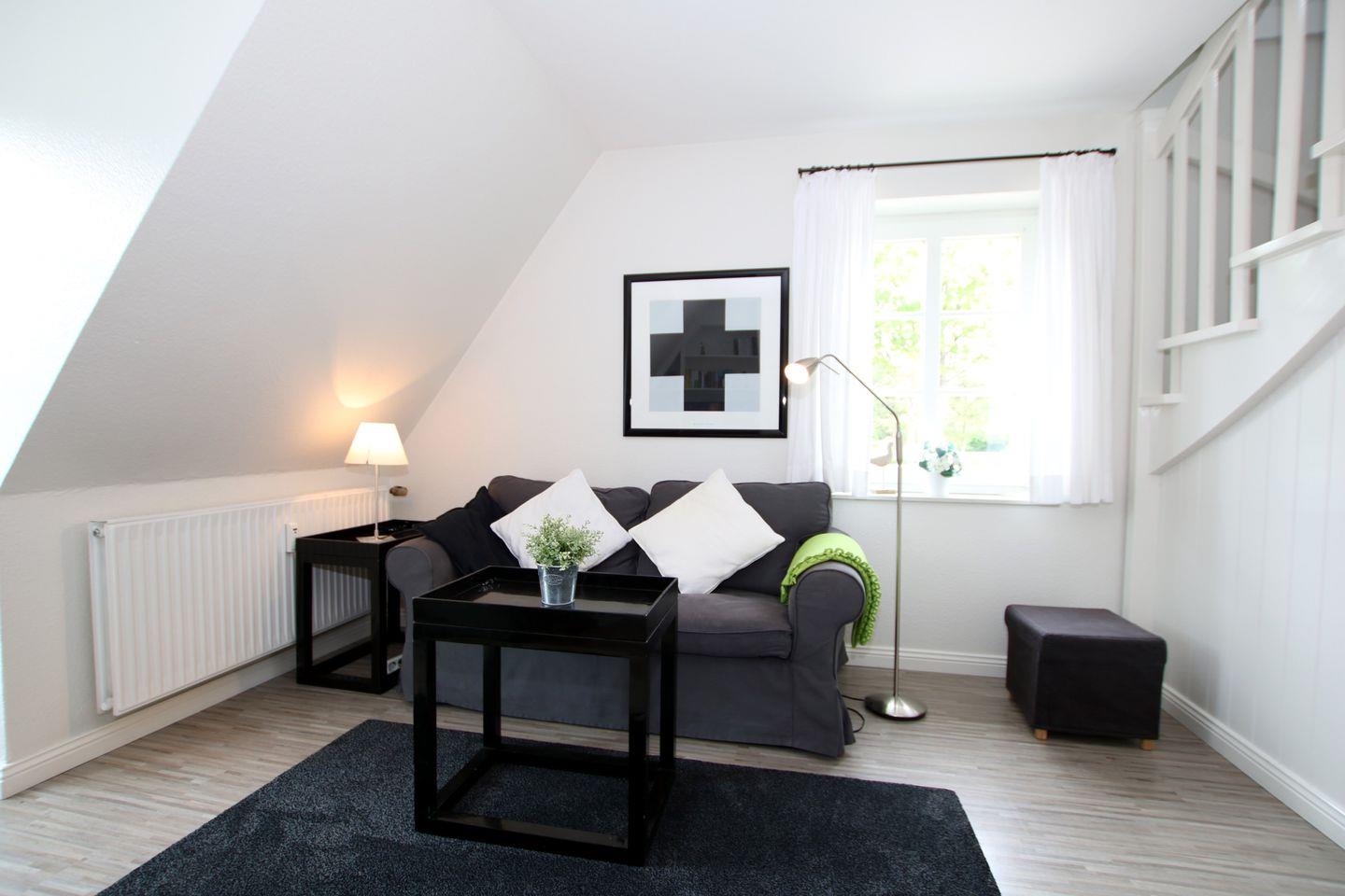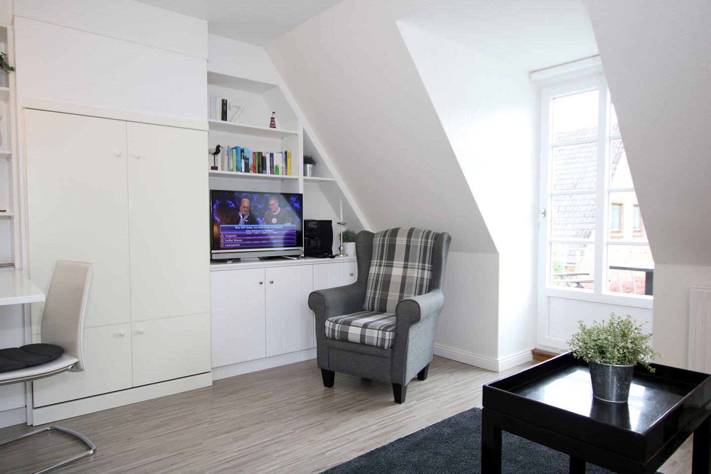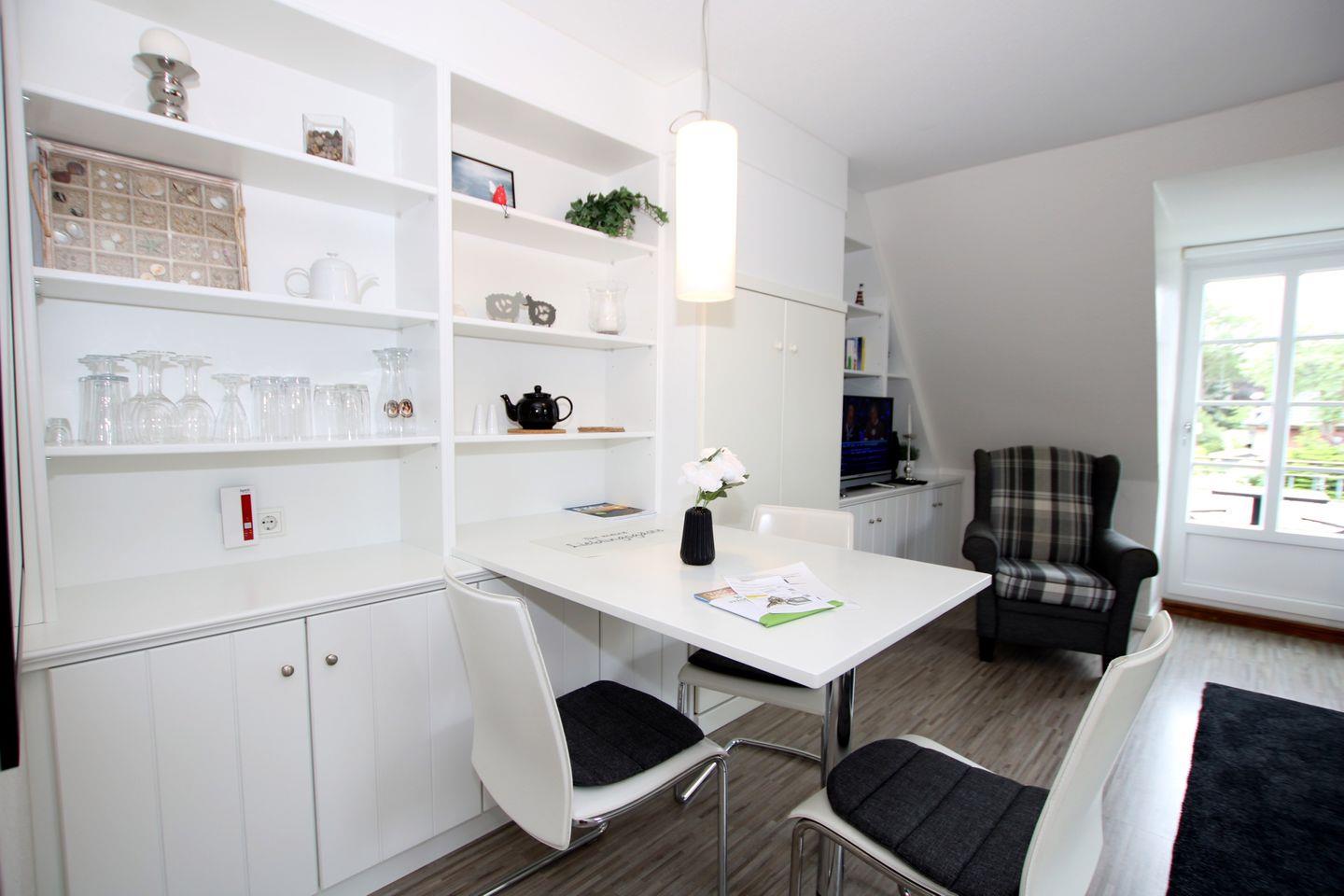 Ferienwohnung in Wyk auf Föhr, Lüttmarsch 13, Whg. Nr. 6 (ca. 35 qm), 2-Zimmer-Nichtraucherwohnung in der 1. Etage mit Südbalkon. WOHNZIMMER: Esstisch mit 3 Stühlen, 2 er Couch, 1 Sessel, Südbalkon mit 2 Stühlen. Separate Küche mit allen Extras. BAD: Dusche/WC. Vom Flur führt eine offene Treppe ins Dachgeschoss, dort stehen 2 Einzelbetten und ein Einbauschrank zur Verfügung.