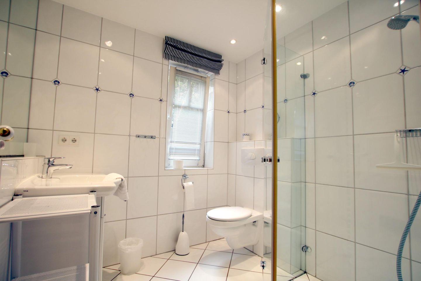 Vom Flur führt eine Treppe ins Souterrain. Dort befindet sich das BAD: Dusche/WC und Fußbodenerwärmung.