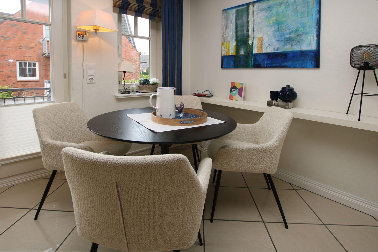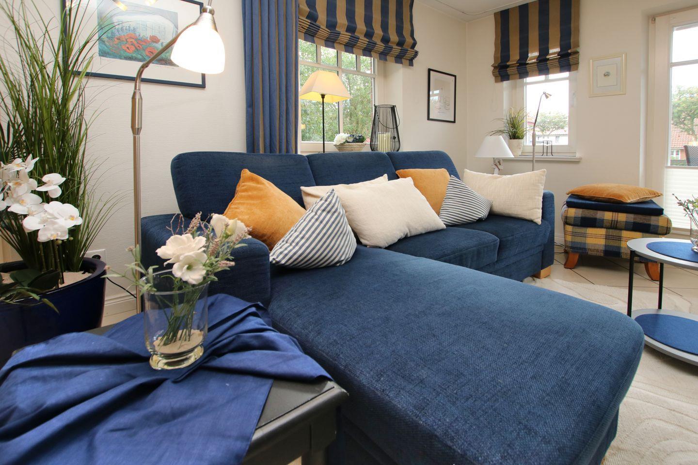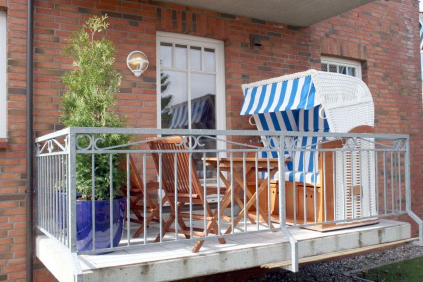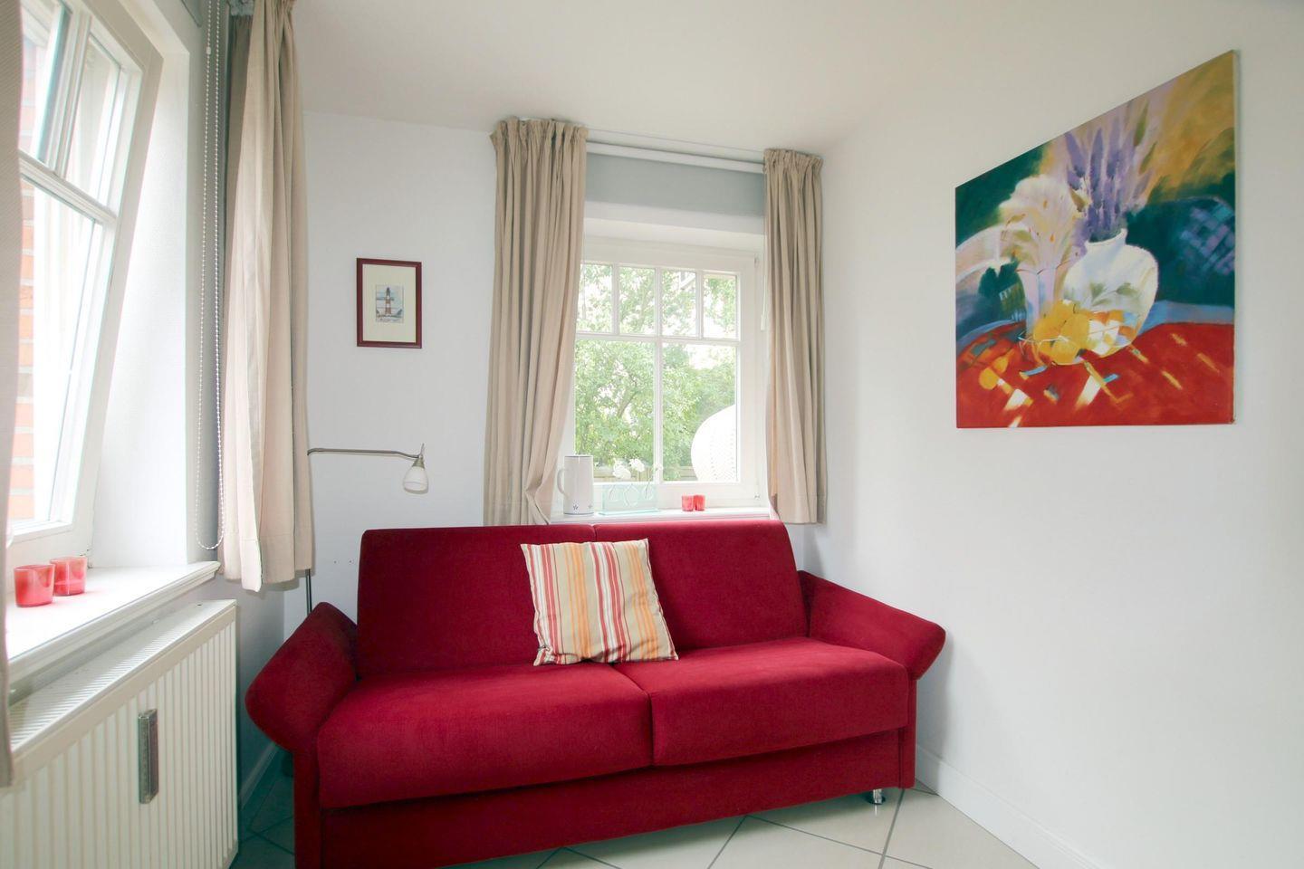 Ferienwohnung in Wyk auf Föhr, Rungholtstraße 6a, Wohnung Nr.2, 2-Zimmer-Nichtraucherwohnung (ca. 45 qm) im Hochparterre mit 1 Ostbalkon mit Strandkorb und 1 Südbalkon. WOHNZIMMER: Sitzecke mit 3er Eckcouch und 1 Sessel mit Hocker, Esstisch mit 4 Stühlen, KÜCHENZEILE. SCHLAFZIMMER: Doppelschlafcouch (1,40 x 2m), Kleiderschrank, TV. Wohnzimmer und Schlafzimmer mit Fliesen ausgelegt.