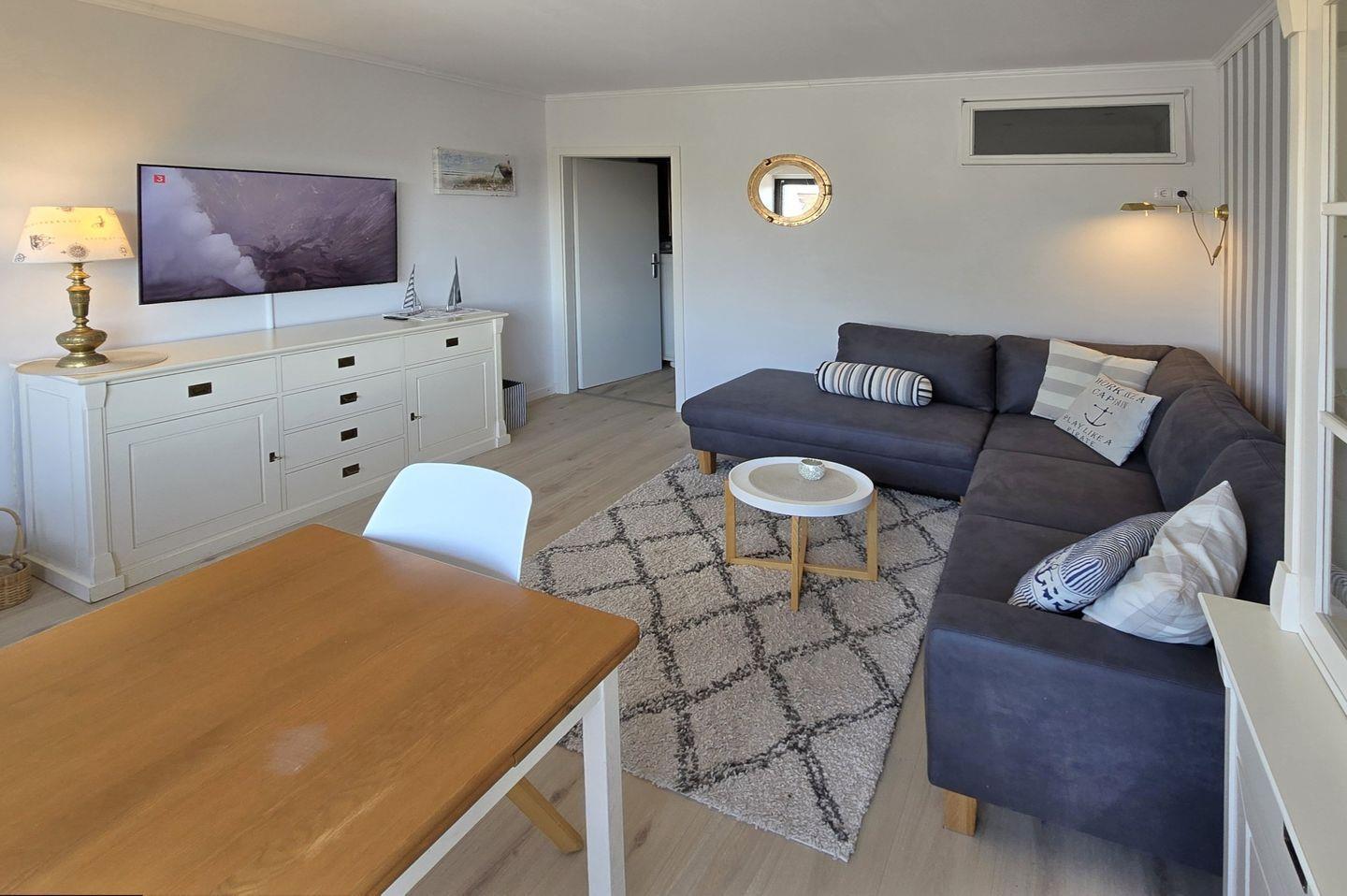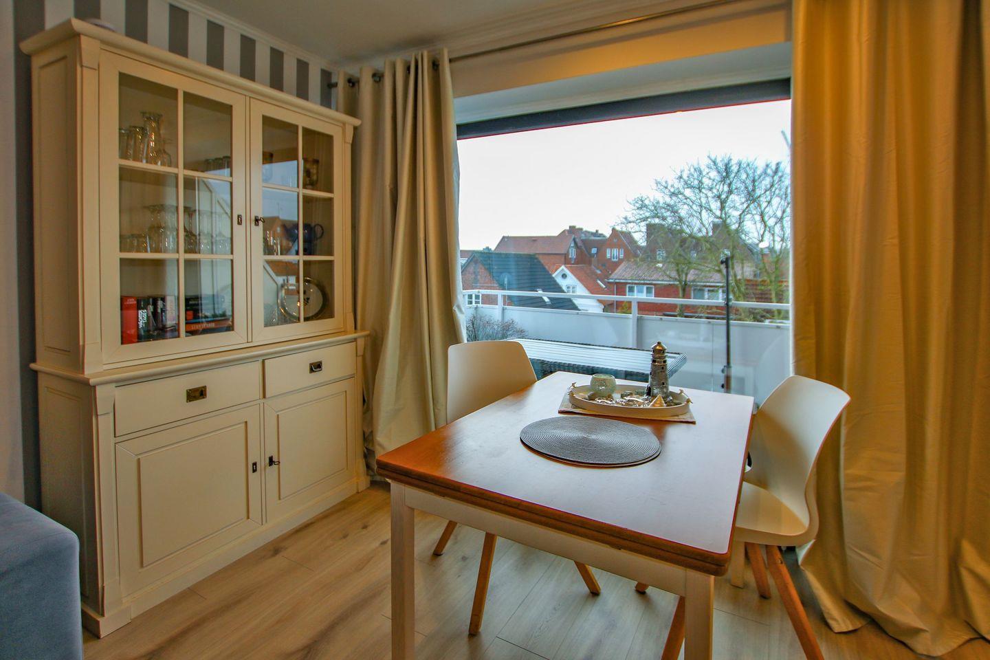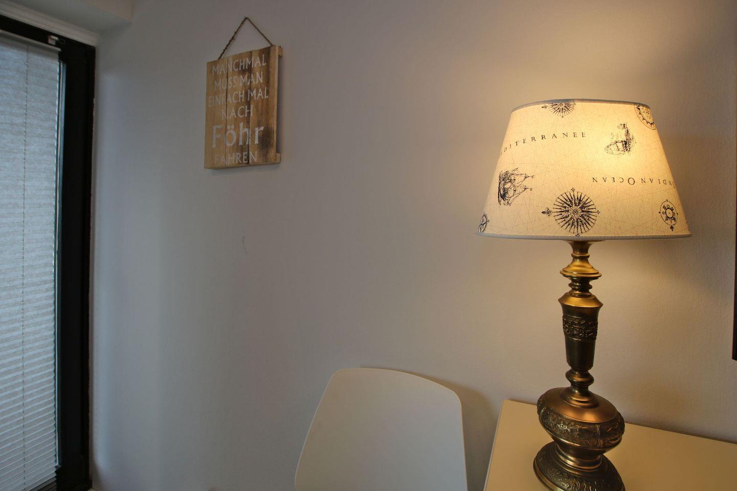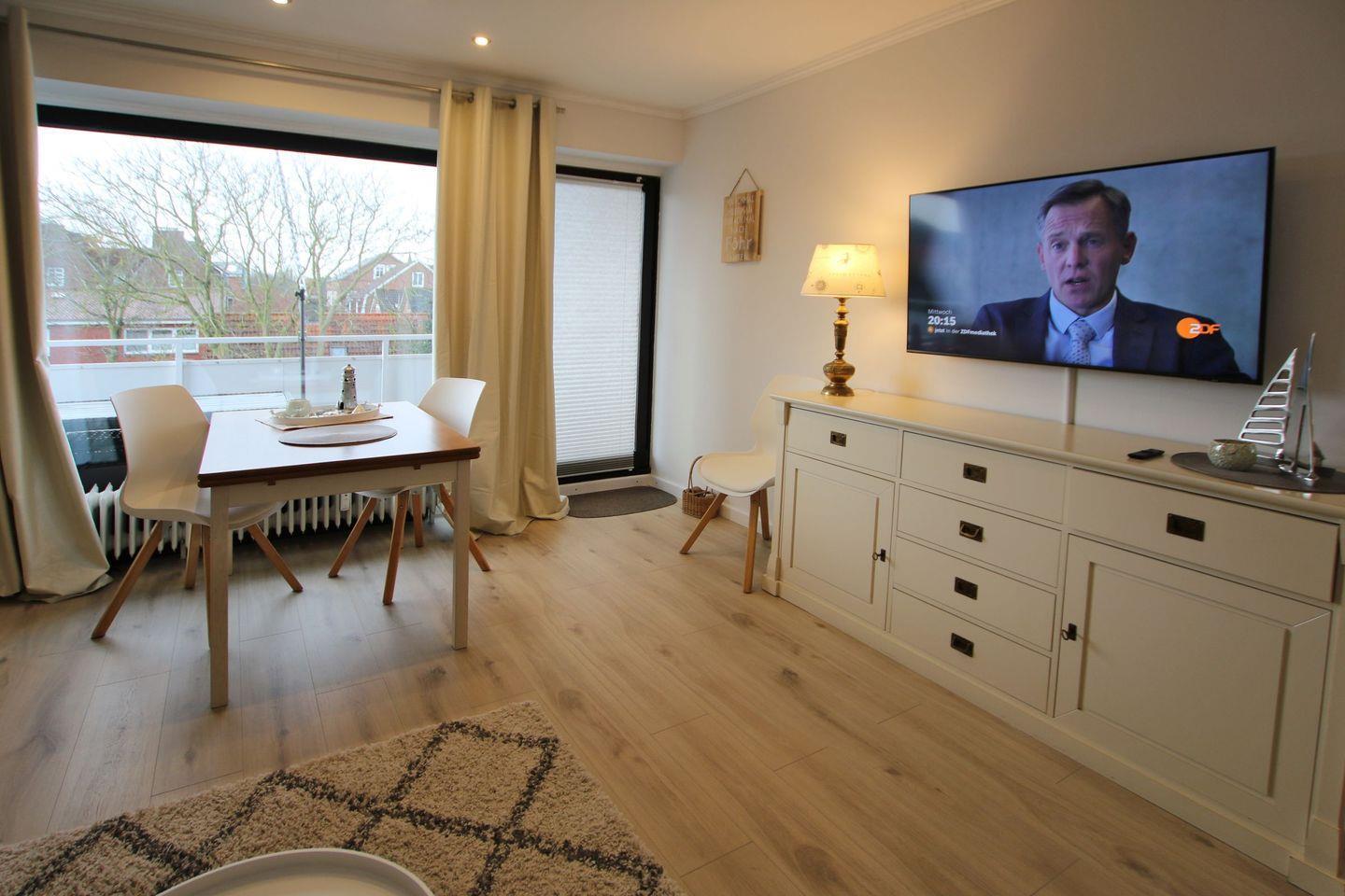 Die Ferienwohnung befindet sich in Wyk auf Föhr, Große Str. 19, Whg. Nr. 5 im 2. OG. Die Nichtraucherwohnung liegt sehr zentral in der Fußgängerzone und nur 150 m vom Strand entfernt. Die modern und liebevoll eingerichtete 2-Zimmerwohnung verfügt über einen großen Südbalkon (10 qm) mit Tisch und Stühlen. Das Wohnzimmer, ausgestattet mit einer Eckgarnitur (als Schlafcouch nutzbar) und einem Esstisch mit drei Stühlen, ist durch große Fensterfronten lichtdurchflutet. Der Schlafbereich mit Doppelbett (1,6 m breit) ist mit einem Vorhang vom Flur abtrennbar, ein Fenster zum Wohnbereich sorgt für Tageslicht und Frischluft. Die Küchenzeile mit Geschirrspüler befindet sich separat. Die Wohnung verfügt über ein Duschbad. WLAN ist vorhanden. Die Bodenbelege bestehen aus Fliesen und Laminat. Ein Parkplatz ist nicht vorhanden. Zum Be- oder Entladen ist es erlaubt, die Fußgängerzone zu befahren.