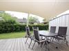 - Südterrasse mit Sonnensegel, 2 Liegen und Terrassenmöbeln. Rasenfläche vor den Terrassen